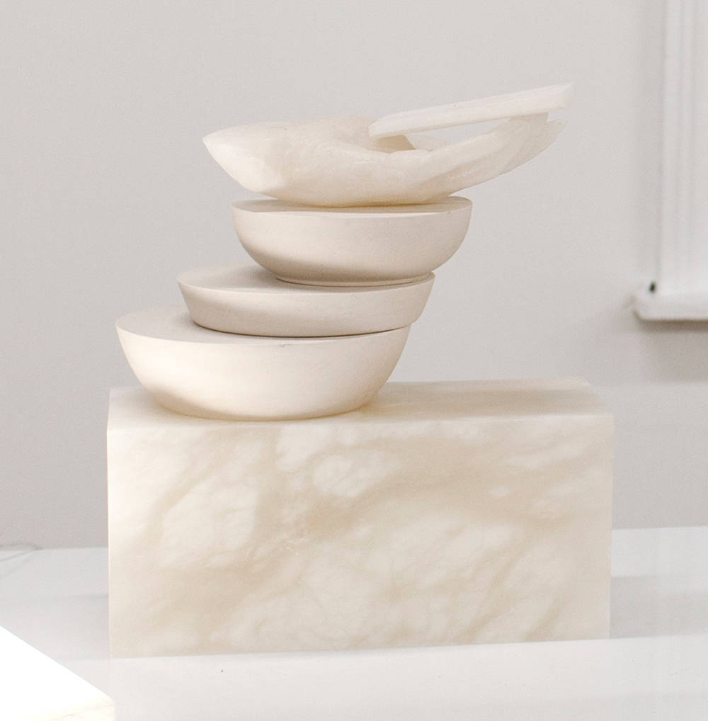 Intimacy (again), 2015 Alabaster, watercolor, limestone, tempered steel 34 3/4 x 16 2/5 x 11 3/4 inches