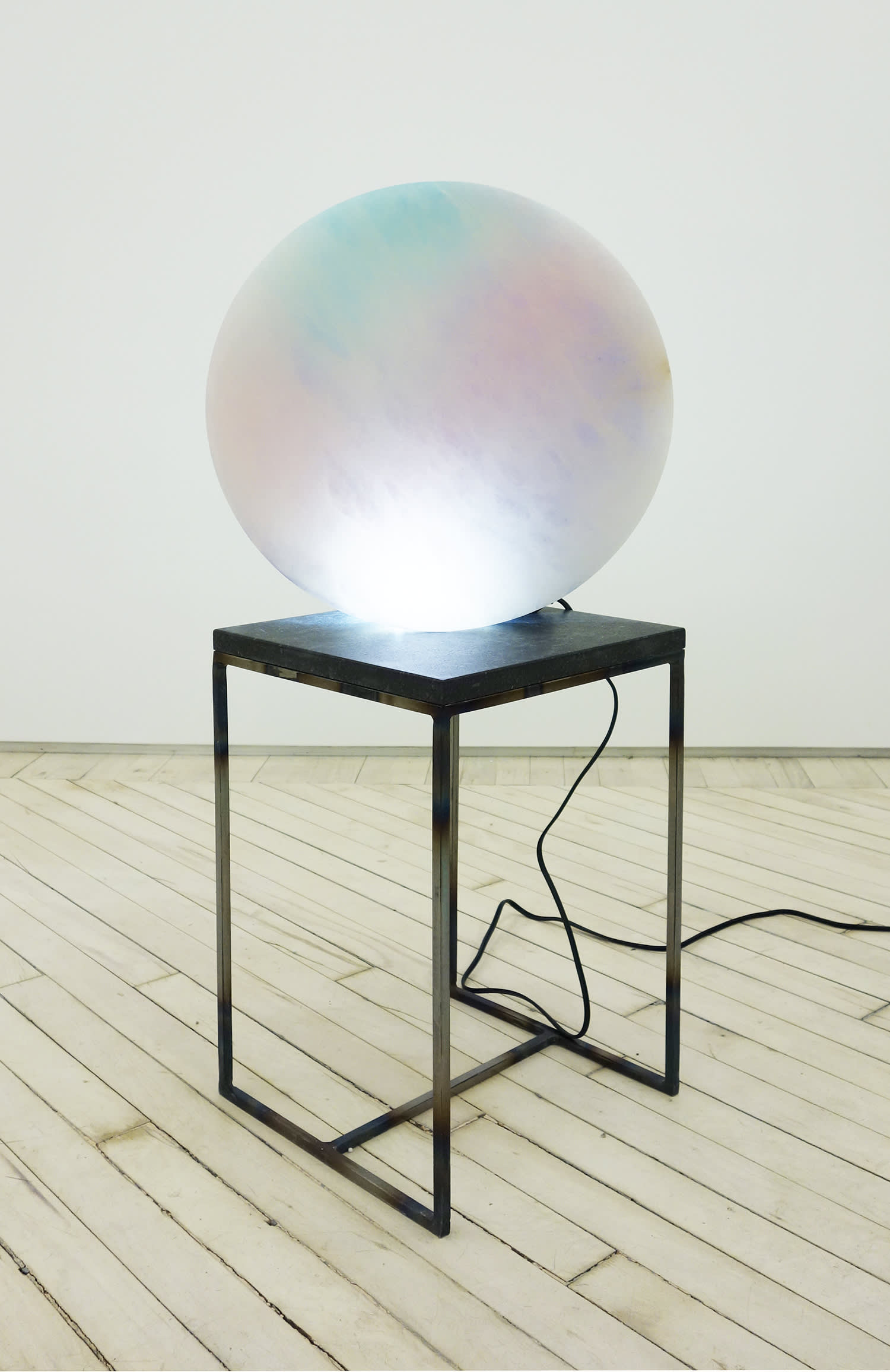 A Slow Moving Thing, 2014-2015 Alabaster, fluorescent acrylic paint, limestone, lacquered steel 44 1/2 x 10 3/4 x 10 3/4 inches