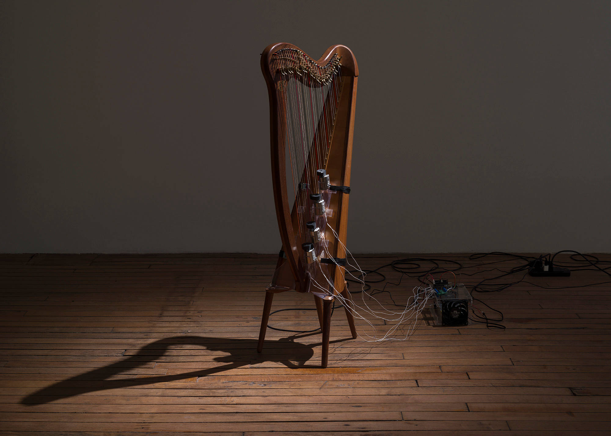 The New Note, 2024 Cláirseach Harp, pewter, motors, 3D resin print, 3D bamboo print, Bela board, power supply, computer fans, DI box, speaker, harp pick-up Dimensions variable
