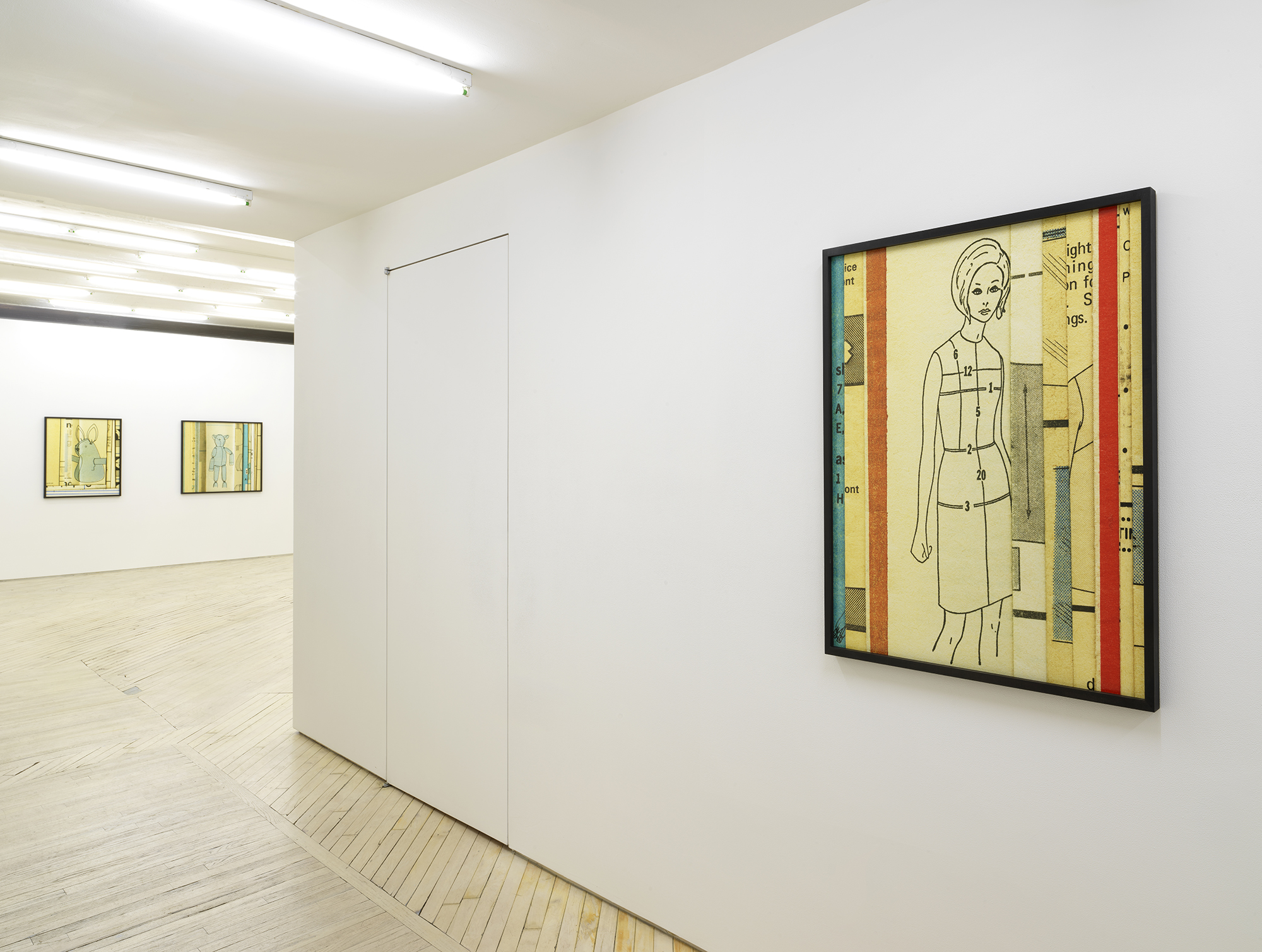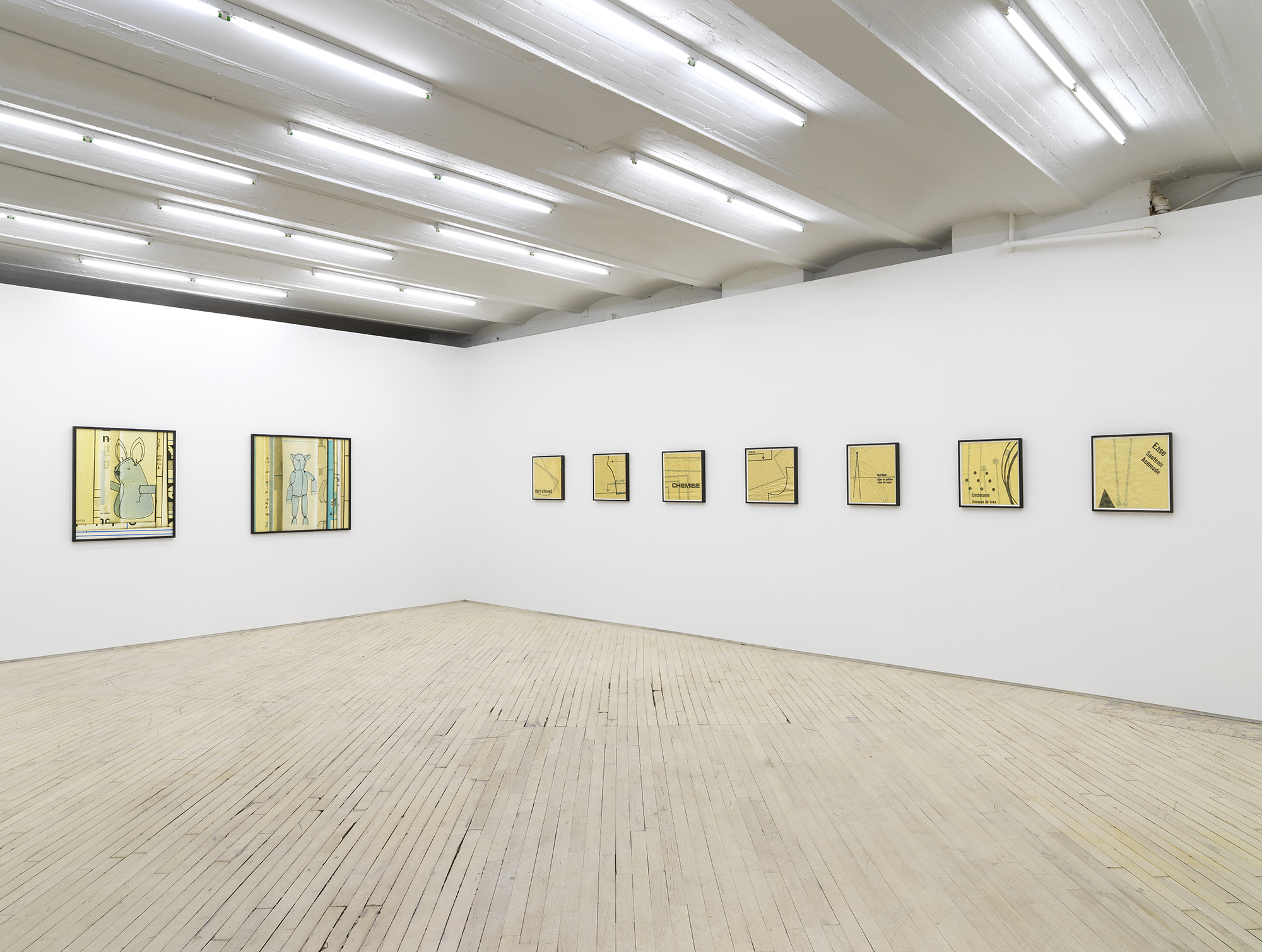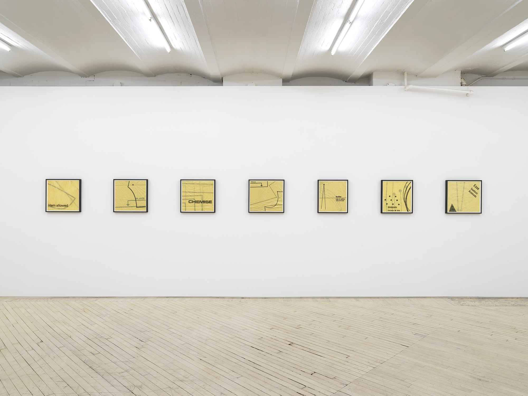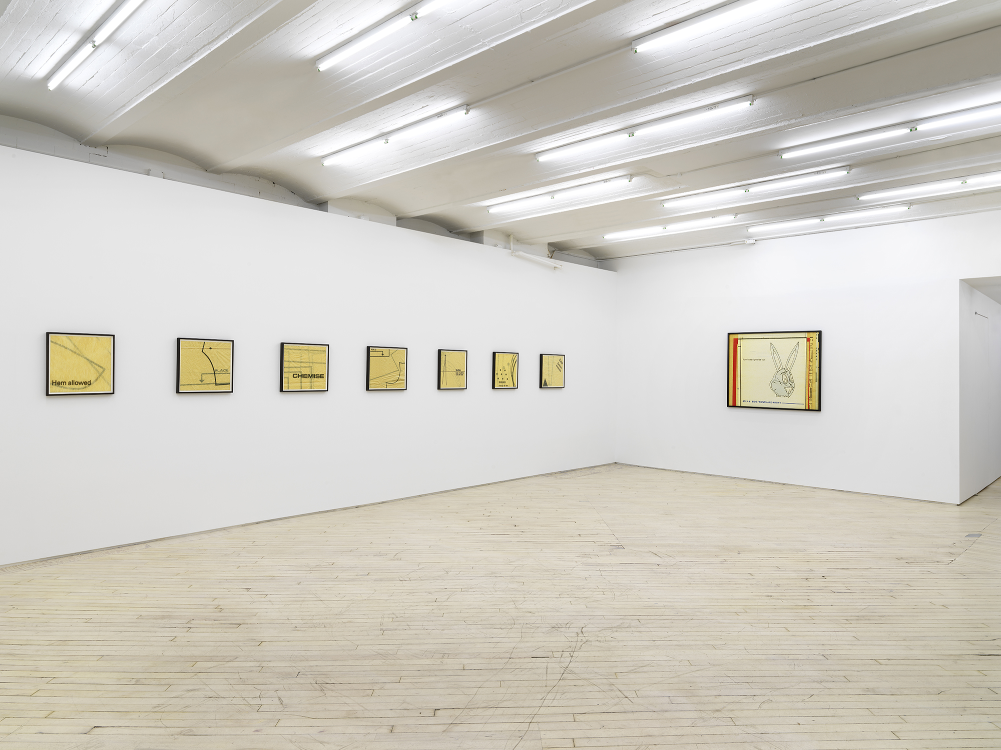 Bureau is pleased to announce our fifth solo exhibition with Erica Baum, A Long Dress. This exhibition debuts Baum’s Patterns, a new series of photographs capturing the textures, contours and words from twentieth century sewing patterns. Baum’s oeuvre over the past twenty years has focused on composing images of found poetry located in the folds of printed material. Her latest subject matter is the paper templates and accompanying booklets which were industrially-produced for the home tailor. The exhibition opens with Edges Fold Fold, one of several large works depicting the diagrams and measuring guides from these illustrated booklets. This work–with its jumble of numbered shapes and staccato list of words–introduces the abstract language and rhythm of the series. In the main gallery, two groups of smaller photographs focus on the gauzy, folded paper templates themselves, capturing concrete poetry in the creases and cut-lines, punctuated by terse directive phrases. Arrows point where to Place or Fold; a suggestive curve is interrupted by the Hem; a bold ‘X’ marks the spot of the Cintura, the Spanish word for waist. These geometric poems hint at the constriction that the diagrammed garments might impose on their wearer. The mannequin pictured in the work Shoulder–the only human form depicted in the exhibition–stares blankly, her body gridded with numbers. Several of these larger images spotlight uncanny, inanimate subjects. A teddy bear-like form in Bunny has its arms stretched wide revealing a lone thread left dangling, the image punctuated by a single inverted word: seam. A possessed-looking rabbit is accompanied by a description of what ails it in Turn Head Right Side Out. It is fitting that Baum chose to title her exhibition after Gertrude Stein’s poem A Long Dress from Tender Buttons. Stein has been an important influence on Baum, and many affinities can be found between their work, from their textual repetitions and rhythms to their observation and appraisal of the mundane. A Long Dress by Stein seems to describe the same variable line that Baum captures. Each relishes the wordplay of a current that both buzzes and dictates, and a line which can contour a waist or parse a phrase. Erica Baum (b. 1961, New York) received her MFA from Yale University in 1994 and her BA in Anthropology from Barnard in 1984. Recent museum exhibitions include The Swindle: Art Between Seeing and Believing, Albright-Knox Art Gallery, Buffalo; Lever le voile, Frac île-de-france, Paris; The Arcades: Contemporary Art and Walter Benjamin, The Jewish Museum, New York; Photo-Poetics: An Anthology, Kunsthalle Berlin and Solomon R. Guggenheim Museum; Reconstructions: Recent Photographs and Video from the Met Collection, The Metropolitan Museum of Art, New York. Recent solo and two-person exhibitions include Naked Eye Nature Morte, Galerie Crevecoeur, Paris; AAa:Quien, Erica Baum & Libby Rothfeld, Bureau, New York; The Following Information, Bureau, New York; Stanzas, Galerie Crevecoeur, Paris. Selected biennials include; AGORA 4th Athens Biennale, Athens, 2013 and the 30th Bienal de São Paulo: The Imminence of Poetics, São Paulo, Brazil, 2012. Her work is held in the public collections of the Whitney Museum of American Art, New York; Solomon R. Guggenheim Museum, New York; The Metropolitan Museum of Art, New York; Albright-Knox Art Gallery, Buffalo, New York; Centre National des Arts Plastiques, Paris; FRAC Ile de France, Paris; and the Yale Art Gallery, New Haven, Connecticut.