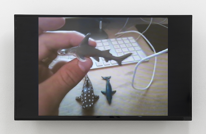 Uri Aran’s video, ‘Untitled (I Love You)’, shows the artist’s hands at a desk picking up small figurines of sea creatures from a shoebox full of maps. Each object is held like a talisman. The artist’s fingertips consider the objects haptically as he divines a meaning intrinsic to each one, which he then names with a word or phrase. The group of plastic animals is lined up and then played like a synthesizer; when touched, its phrase is recited: “I love you,” “Stay,” “I have respect for you and you’re beautiful...” The piece is so intimate and strange; the naming of these plastic toys feels so absurd and nonsensical but also so undeniable and true. I think the intimacy of the work comes from the feeling that we viewers are privy to the very personal space of the artist’s contemplation about a lover slipping away. It feels so candid and uncensored.