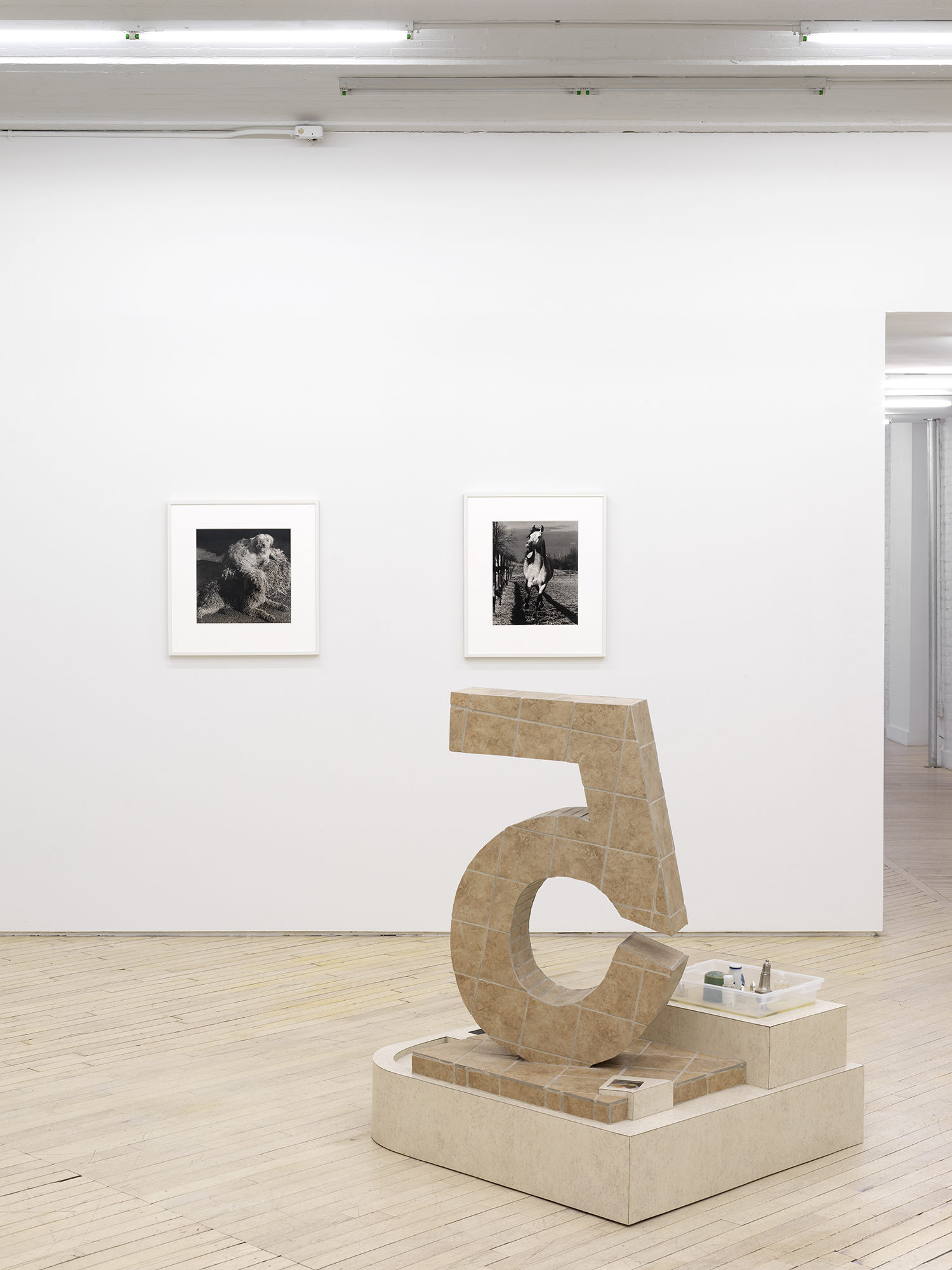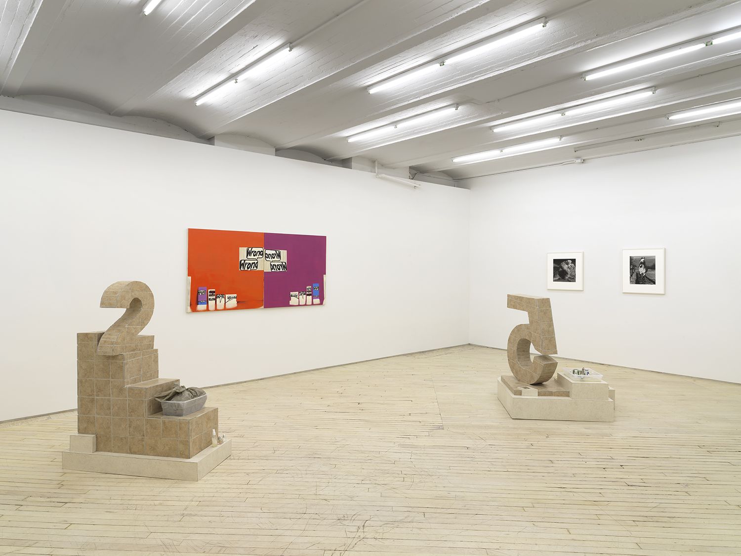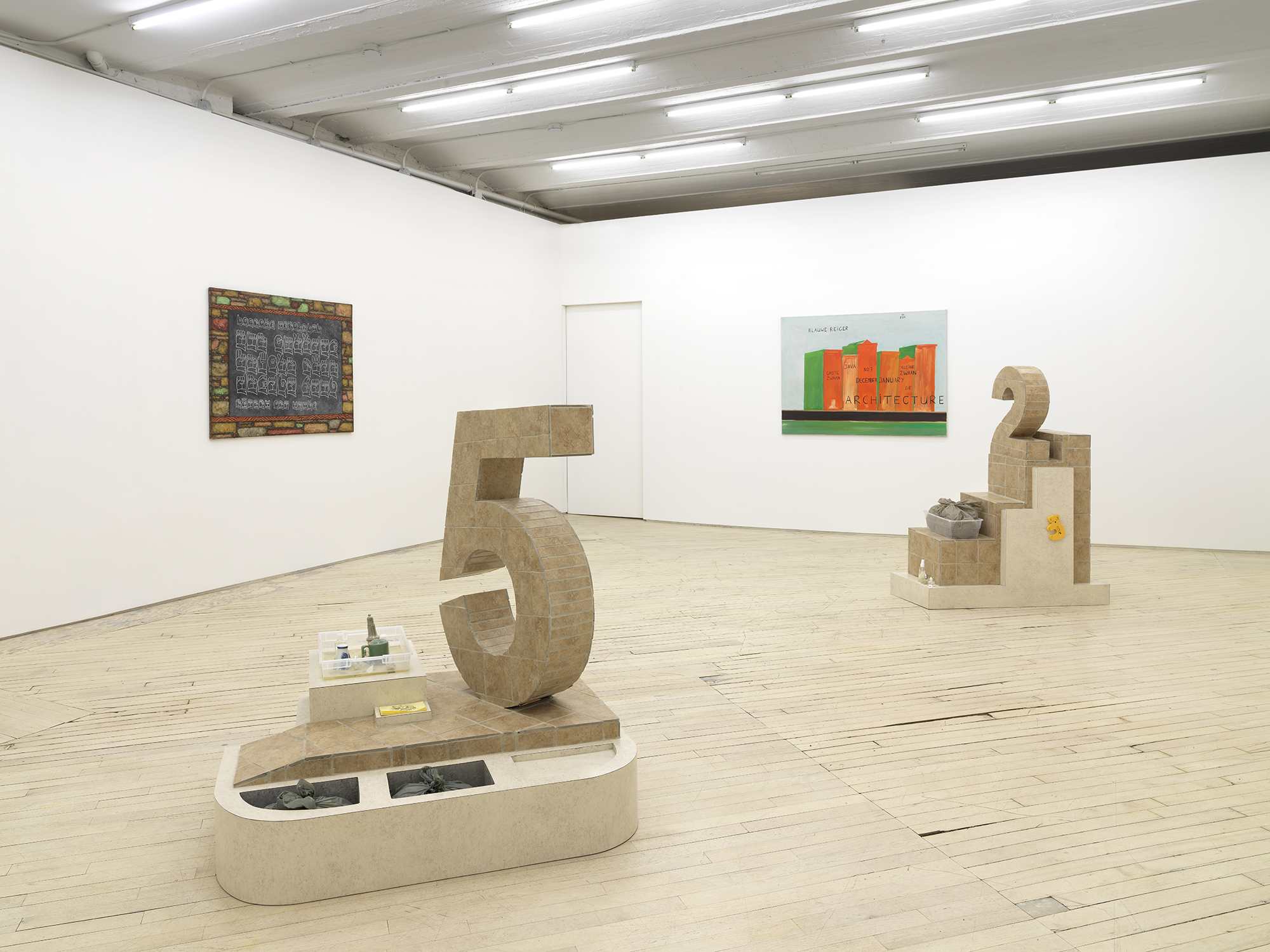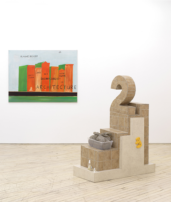 When I talked to Rochelle about Libby Rothfeld’s work, we shared a look of excitement, agreeing that Libby had guts to use the numbers “2” and “5” in her work. We all have deep associations with simple signs, and these numbers – indivisible, abstract, and so real, too – loom large in our minds. Sculpturally, these iconic numbers also have a dominant, central position in the exhibition. Each integer sits atop a stepped, tiled base; each piece a small universe. The sculptures are patinated with the most beige, basic laminate and tiles, as if to suggest a theoretical realm, a constructed possibility, not a depiction of a place. Libby’s work often wrestles with the problematics of taste and how our banal choices construct our identity. What does it mean to place a number in space? We speak numbers, use them, play with them, show signs of them on paper and with our hands, but how do they stand? Her sculptures offer, to me anyway, an expression of how logic feels. We don’t often get to stand next to a number, to a choice, to look concretely at the building blocks of logic.