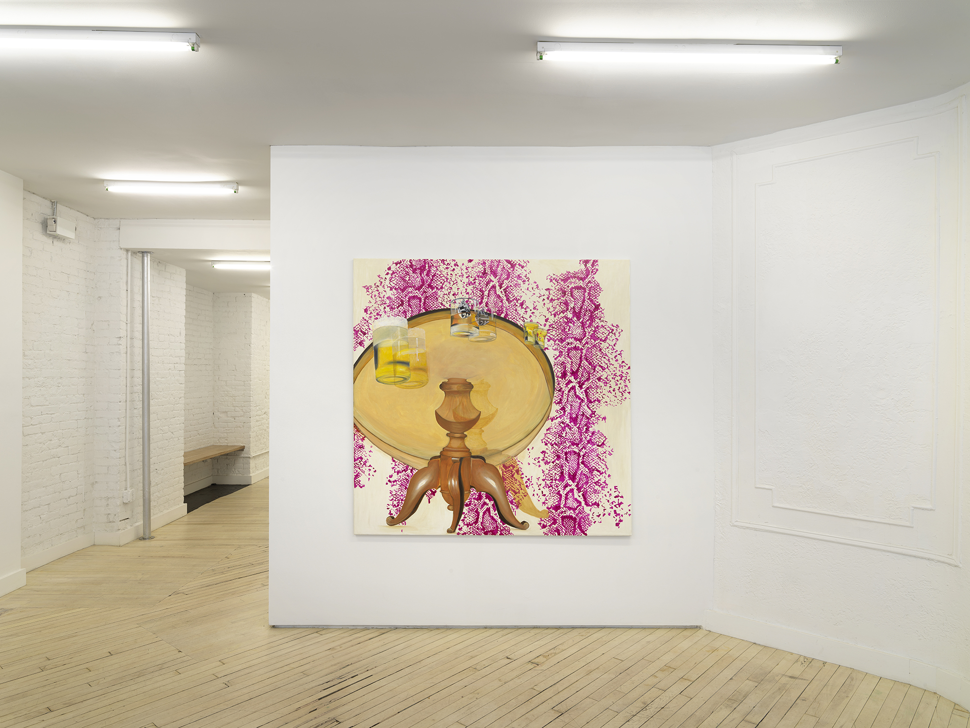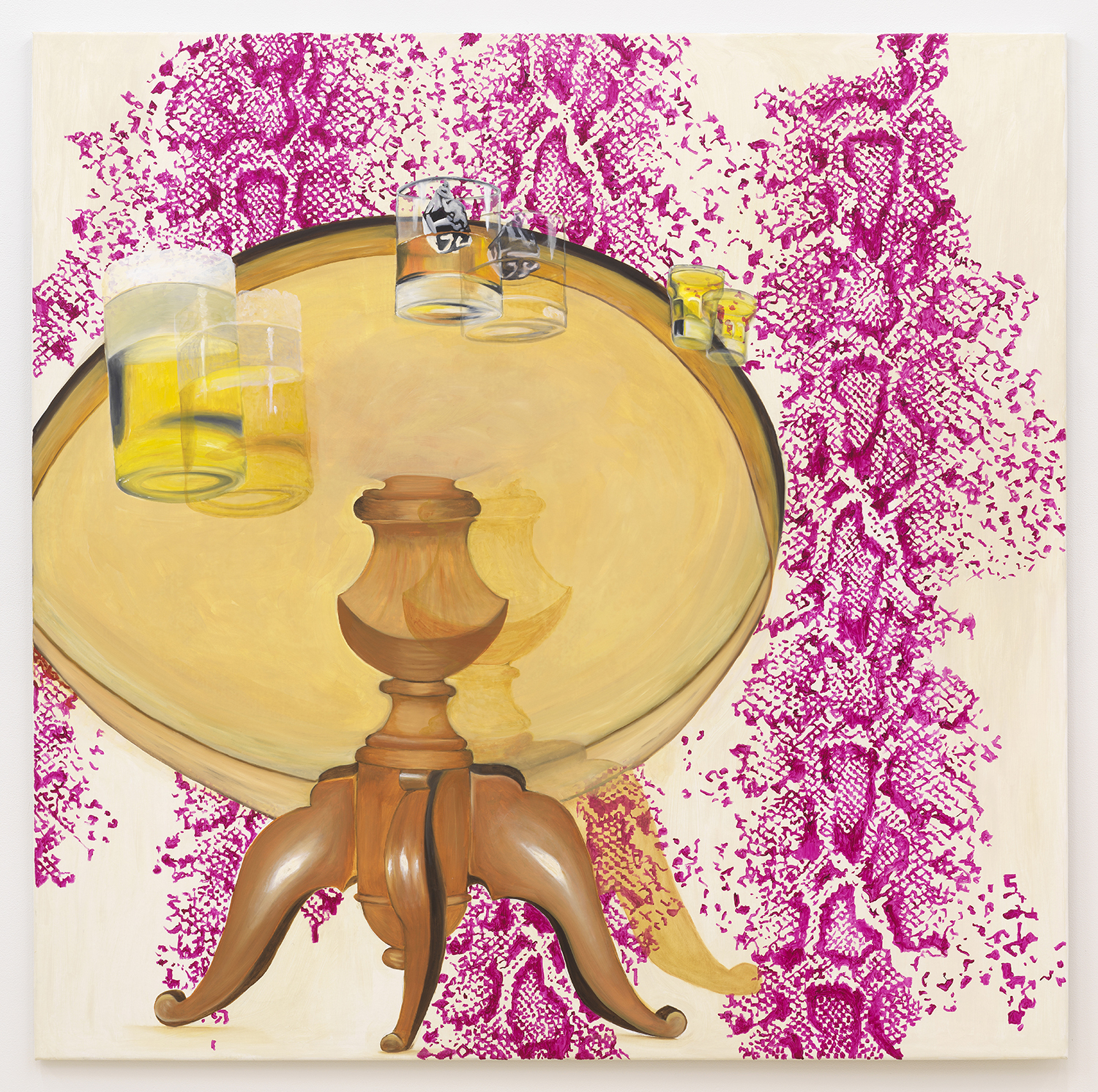 Quintessa Matranga’s painting also considers the ‘wrong’. Rather than using words, the depictions suggest a phrase or state of mind where things do not line up or make sense. The doubling here is our vision: we, the viewer, are together with the painter in an unusually confused perspective from underneath a table, where a trio of beverages hovers dizzyingly at the edge. Perhaps they are revolving in an orbit of choices so seductive when full and so disorienting when nearly empty. Gravity seems to affect things differently on this planet; beer foams out of its pint and a pair of black and white, marbled ice cubes nearly escapes the warm comfort of the whiskey glass(es). The yellowing, lacquered table floats amidst a field of magenta snakeskin. Close in, the woodwork of the central table leg seems utterly clear and stable: a pillar to cling to.