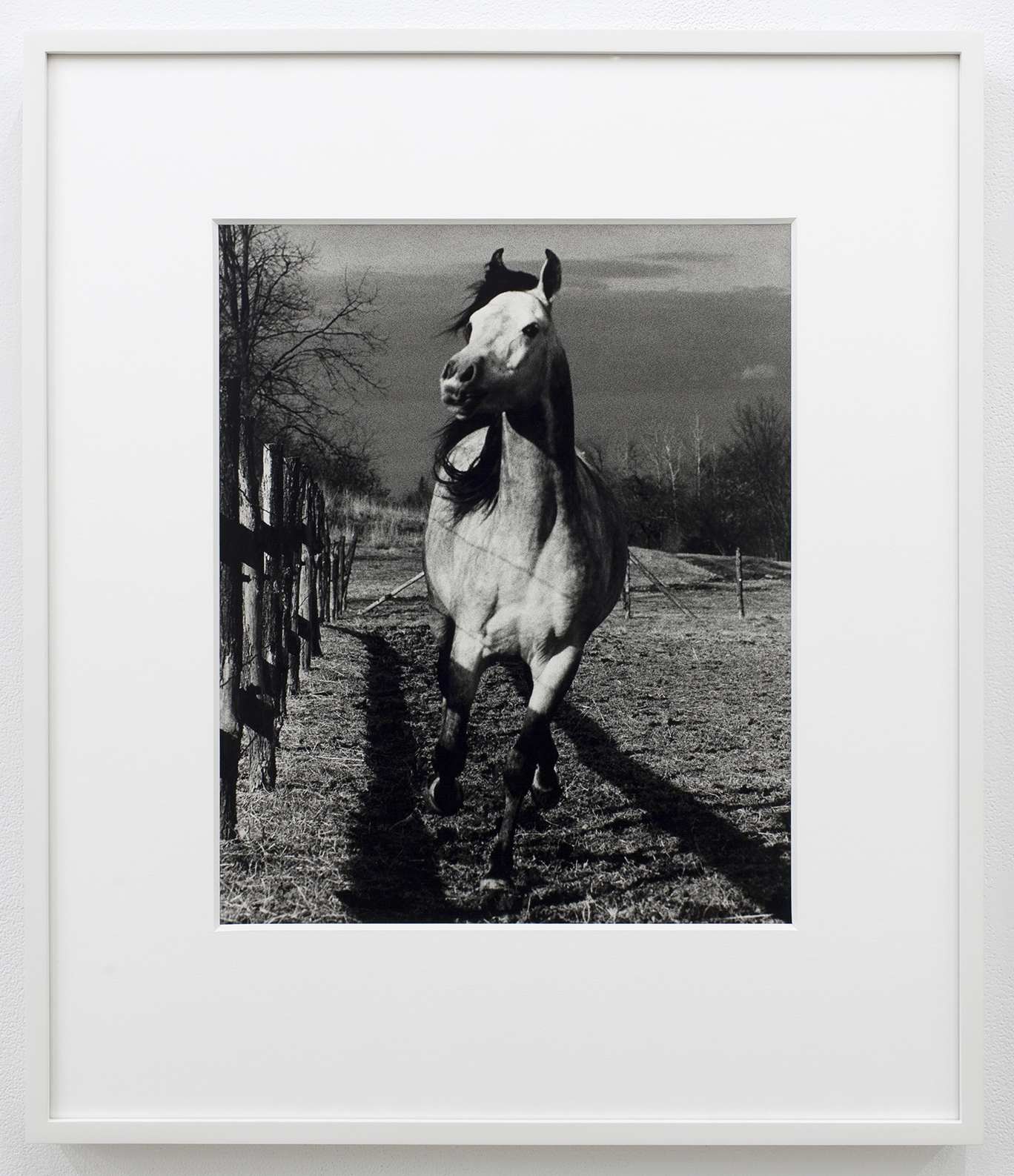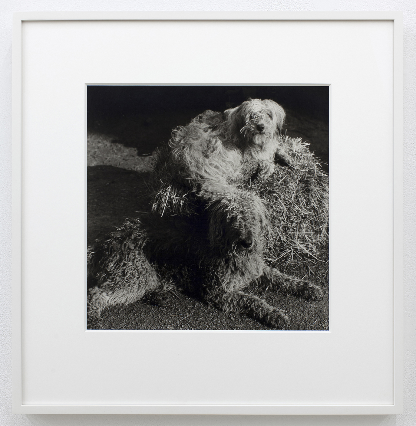 The exhibition is intergenerational and includes painting, sculpture, photography, and video. Two silver gelatin photographs by the late, great Peter Hujar are strange and beautiful outliers in the show. One features two scruffy dogs lying nestled in a dense mess of hay with oblique light streaming in from an out-of-frame source. It looks like a dusty barn in the morning. The other photograph shows an unbridled horse running towards the camera. Hujar is well-known for his portraits of humans – friends, lovers – but his animal portraits share the incredible empathy and pathos with which he captured his subjects. I’m certain that these two pictures of non-verbal beings is a kind of clue to the show. I’m probably projecting onto the animals as “innocent observers” of the mayhem of language found in the other works.