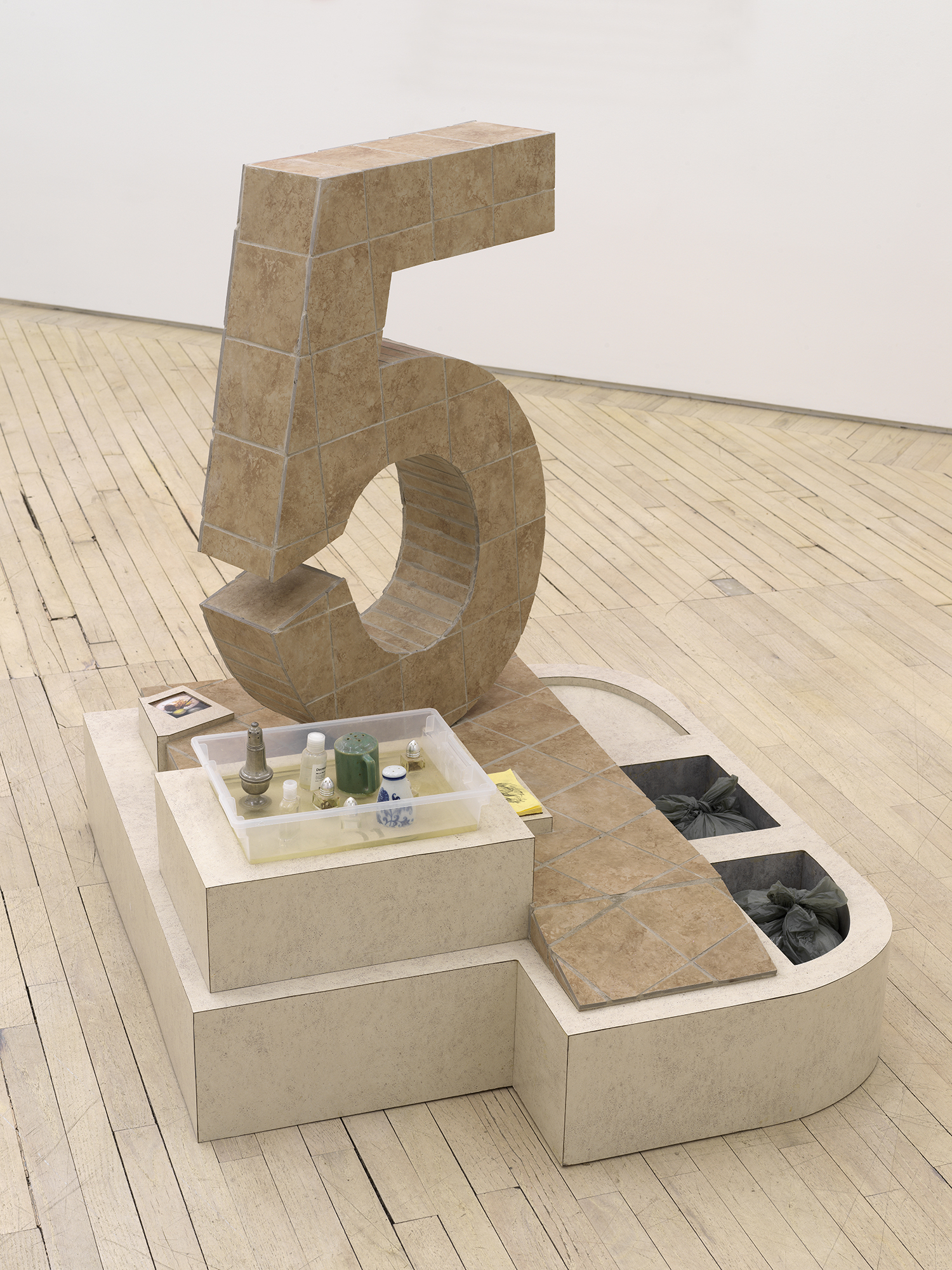 Libby Rothfeld, Who am I? Who am I! (#2), 2020, Laminate, tile, grout wood, plastic bag, plastic storage tub, salt shaker, pepper shaker, resin, spray bottle, ink jet print, plexi, foam koala, 55 × 18 ¼ × 42 ½ in.