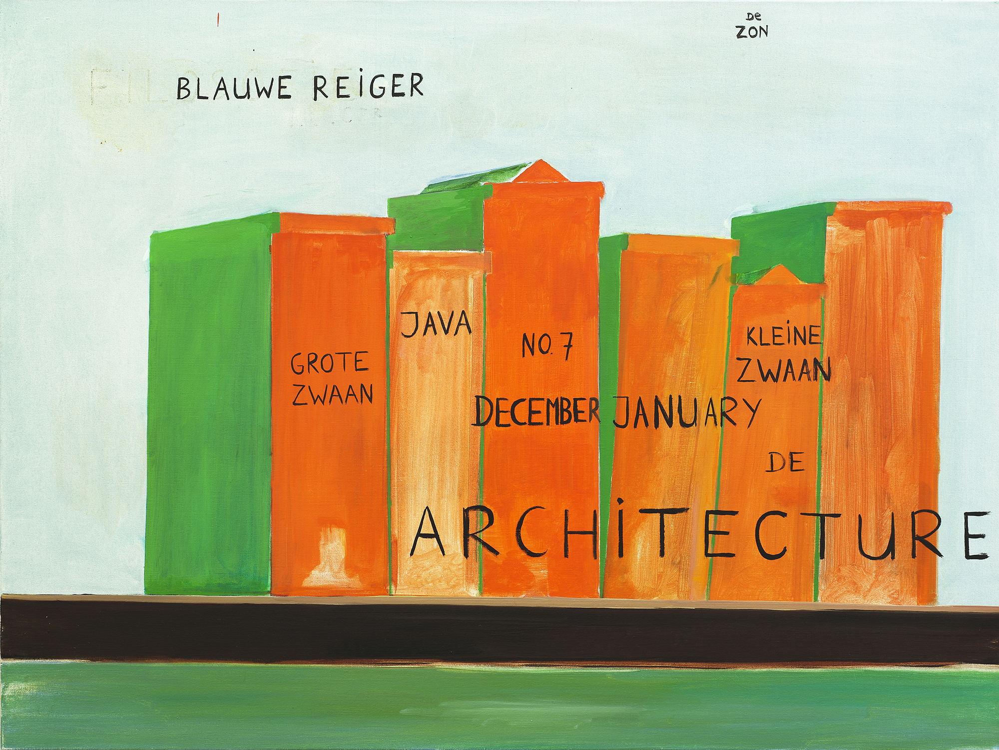 You know Alice and Dada were some of my first loves. I find a joy in the ease with which we can play with words and logic to say things which make no sense. The joy is now less freeing with the dissolution of truth in our current political state, but even more so, there is value in studying how pliable language and meaning can be. René Daniëls’s painting uses words to confuse the image he’s depicting; not in a straightforward non-equation like Magritte’s, but more enigmatic. In the painting, ‘Kades-Kaden’, Daniëls depicts a series of orange-faceted and green-shaded forms in the center of the canvas. Is the light blue background a sky? Is the horizon a shelf or a street? Scale is unclear, so perhaps we are looking at a group of books on a desk, or townhouses on a boulevard. Written over the orange rectangles, the word “Architecture” suggests buildings, but maybe it is a series of books about architecture? One unit is called Grote Zwaan, one Kleine Zwaan, big and little swan, respectively, in the artist’s native Dutch. The painting is, finally, I suppose, undecipherable, but a delight to puzzle over. Daniëls was famous for his mysterious scenarios, challenging the depiction of space and flatness on the picture plane. Flying above, in the cool sky background, is a kind of title, Blauwe Reiger: Great Blue Heron.