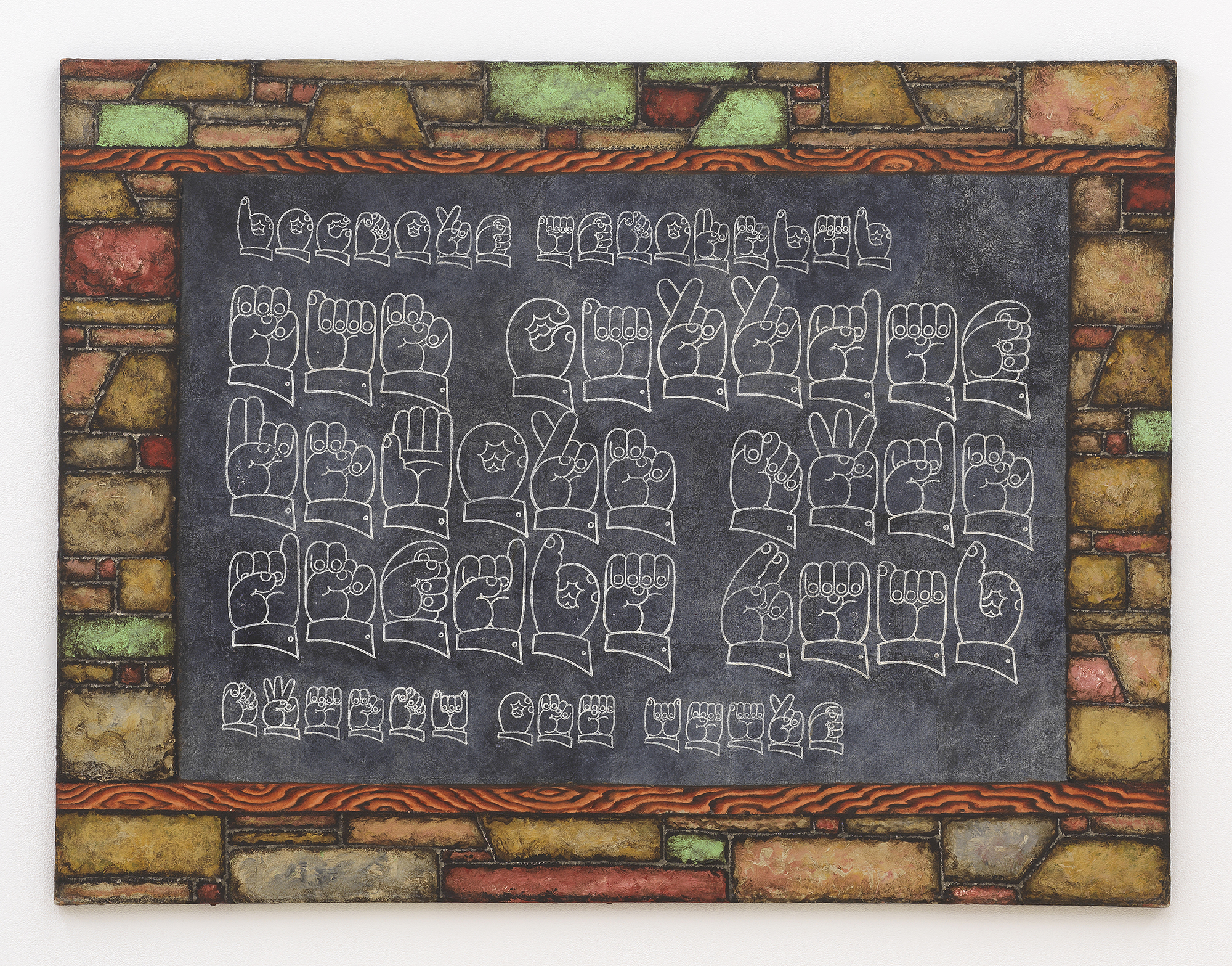 I am really thrilled to be able to show Martin Wong’s work in this context. The painting that we’re showing is one of his sign-language works. It has this incredible trompe-l’oeil tile frame, which I am excited to see in the same room as Libby’s work. I love the way Wong used bricks as a kind of repeating texture in so many of his works - within these patterned, crowded structures, intimate spaces and hidden identities emerge. Wong was obsessed with codes and language, too. Some of his paintings showed the zodiac, a system invented to make sense and stories of the stars. Taken from what was probably a tabloid paper, this painting shows a series of hands spelling out a headline in ASL: “doctors astounded / man carries / unborn twin / inside head / twenty one years.” What an idea: to draw hands spelling in ASL. Written words or a picture would have sufficed for a deaf person, but Wong wanted to employ a code to translate his subject and make it more obscure. Anneliis, who works on Wong’s estate at his gallery, also mentioned that he was really interested in the constellation of Gemini in particular and the nature of twins as the poetic potential of a perfect genetic match but an imperfect mirror.