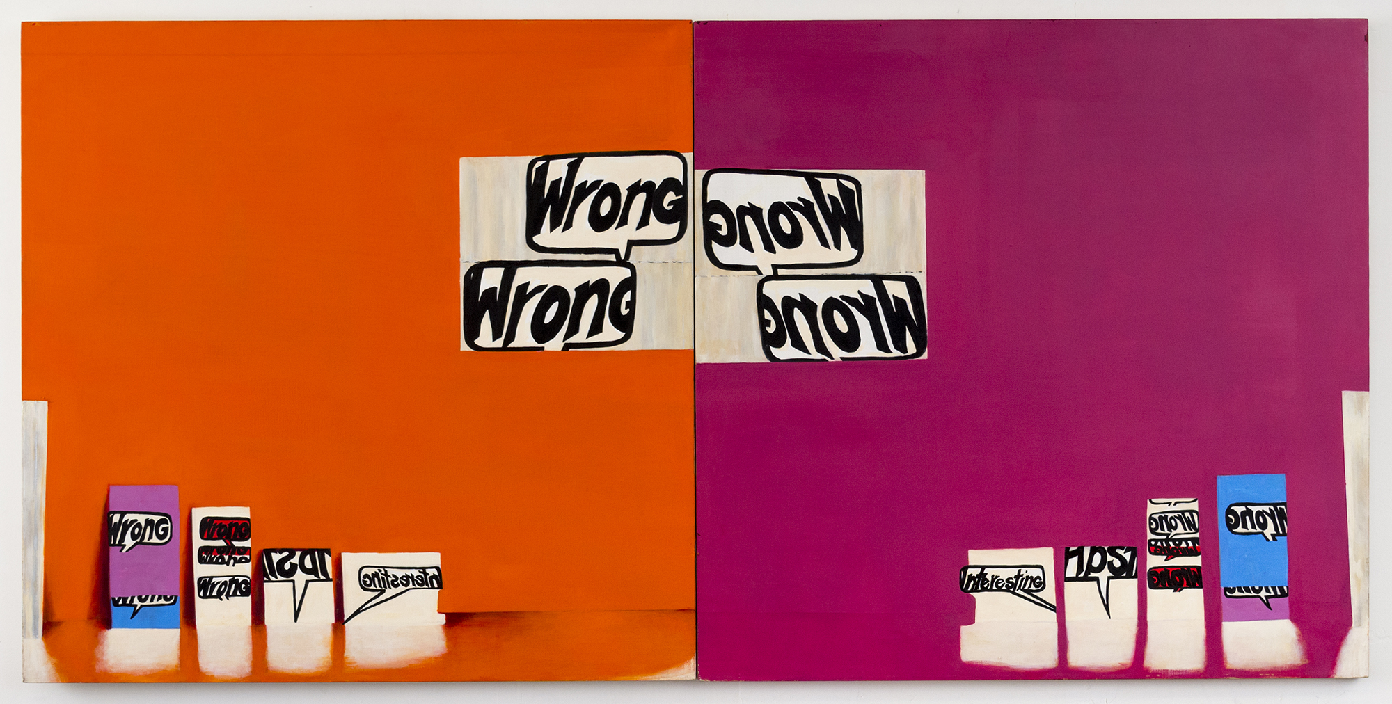 In a painting, a word can fly like a bird, or it can speak as the mouthpiece for the painting itself. In Rochelle Feinstein’s diptych, ‘Wrong Wrong’, the eponymous word appears multiple times: contained within comic speech bubbles and drawn out in the artist’s own hand-written font against stark and bright monochromes. The painting’s central axis, where the two canvases meet, serves as a mirror - the looking glass through which orange reflects as fuchsia. On the left, where there is a slight suggestion of an illusionistic space, the words are written forward, on the right they are mirrored in reverse. Wrong Wrong. It’s a chorus of criticism, but the painting anticipates it and thus beats its detractors. The repetition brings a rhythm and humor to the word, an absurd mantra of incorrectness, a delight in just never being right. This painting makes it feel ok to rest our minds in a place without certainty because forwards or backwards, it’s always wrong, and that’s that.