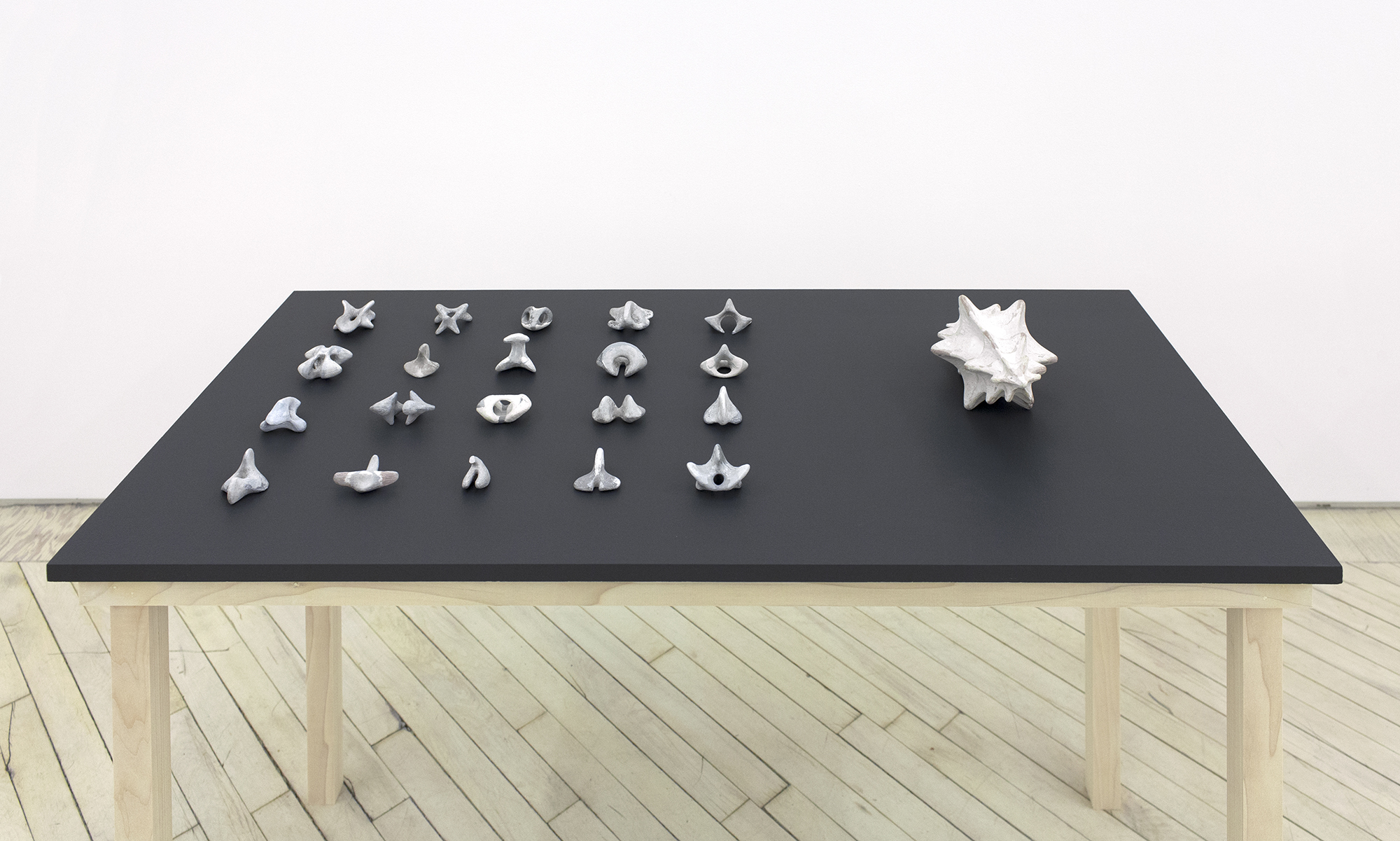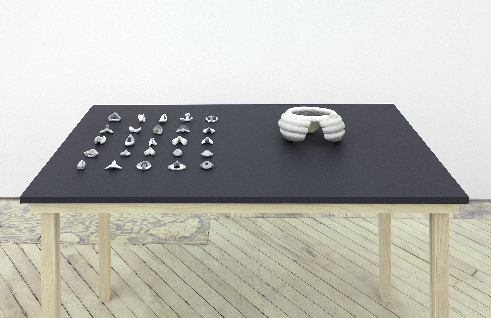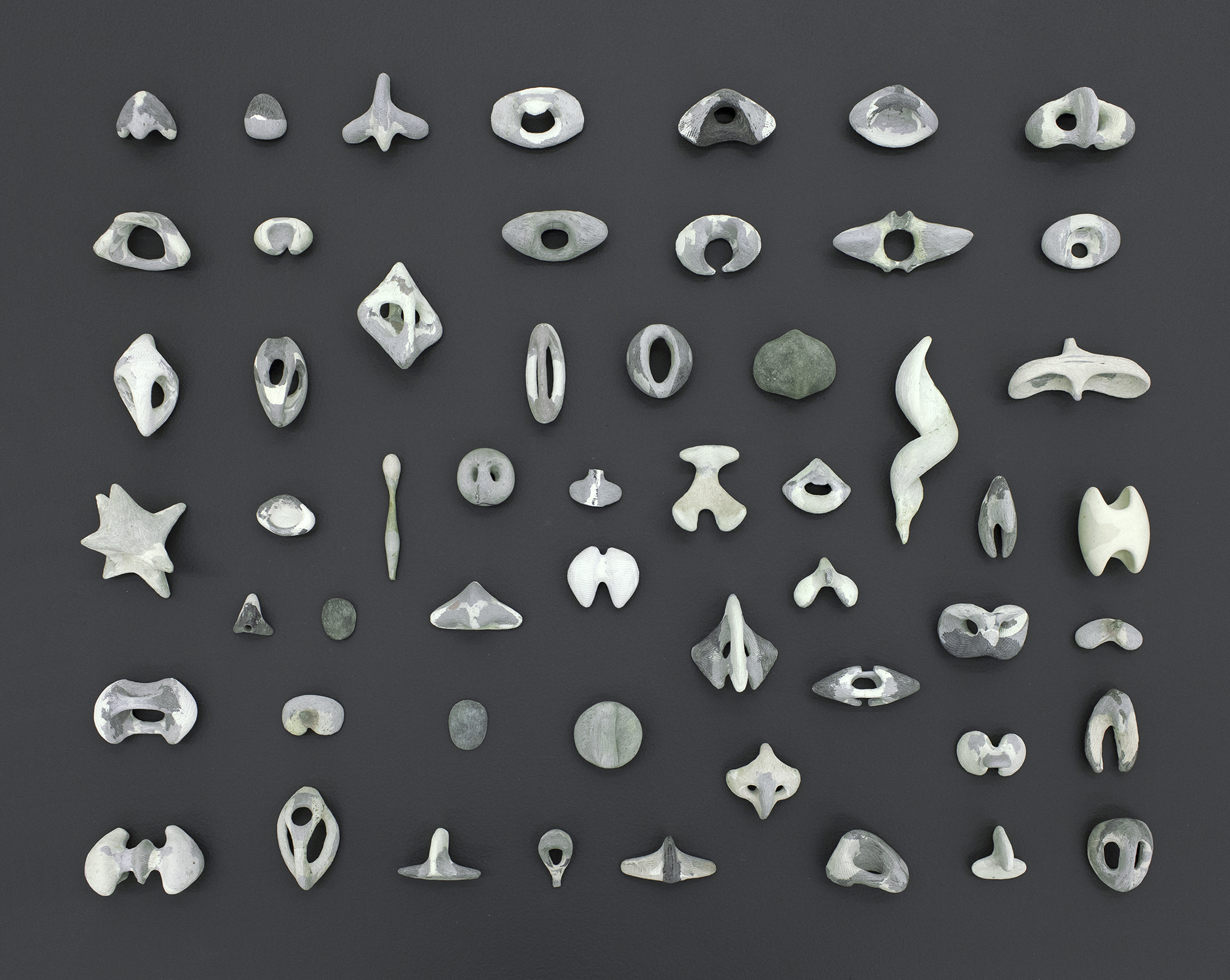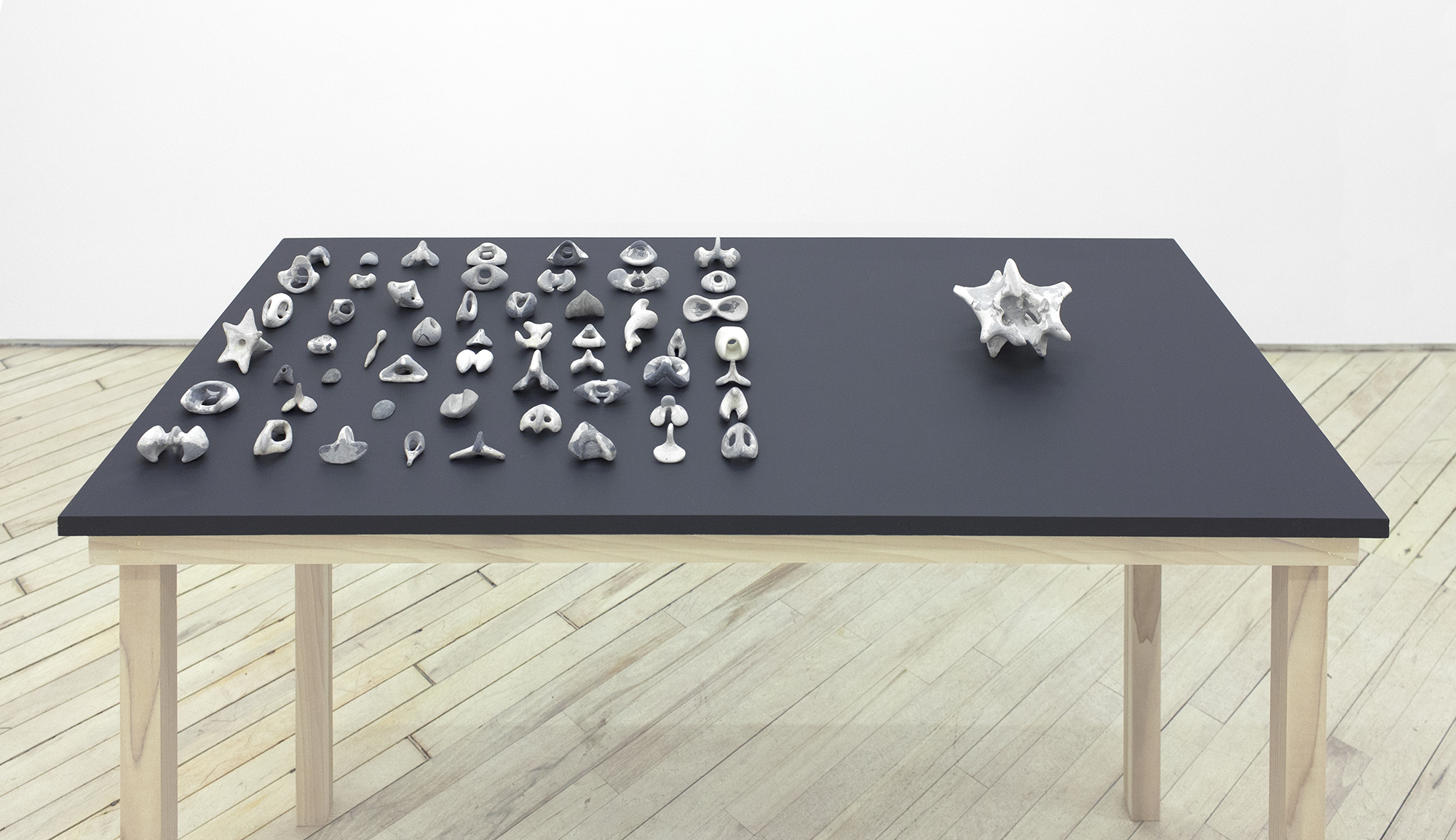 For nearly two decades Matt Hoyt has been shaping a bevy of hand-made objects out of various clays and putties. The majority of his works are very small, shaped by devoted hands, subtly surfaced and worked over extensive periods of time. The pieces seem to hold a locked potential, willed into a kernel of physicality by the artist’s concentrated mental attention. Over the last two years he has seldom started a work from scratch, instead he refers back to a dense archive of previously initiated objects which exist in various states of completion. The reason for this, other than a simple desire to finish what was started, is a deliberate attempt to introduce further complexity into his process: tangling each object’s story through a daily activity of cutting, mending, scraping and filling. Sometimes returning to a piece years later, the original intention may be completely lost on the artist, requiring him to listen and respond only to the metaphysical history encoded in the form to prompt the succeeding steps. The works inhabit a state between the recognizable and peculiar, and their diminutive size begs a close look, imposing an intimate experience of a flickering between familiarity and strangeness. They might resemble organic forms such as vertebrae, exoskeletons, mollusks and sea pods or inorganic things like rocks, stone-age tools and architectural miniatures. The larger forms stand solemnly alone, while smaller forms cohere in arrangements of many: a multitude of innies and outies, slopes and spikes. These arrays imply a kind of animation from one piece to the next: an eruption of minute alterations that echo the artist’s practice. The adjustments imprint a complex time signature onto each piece, as a slow geological evolution washes over the work.