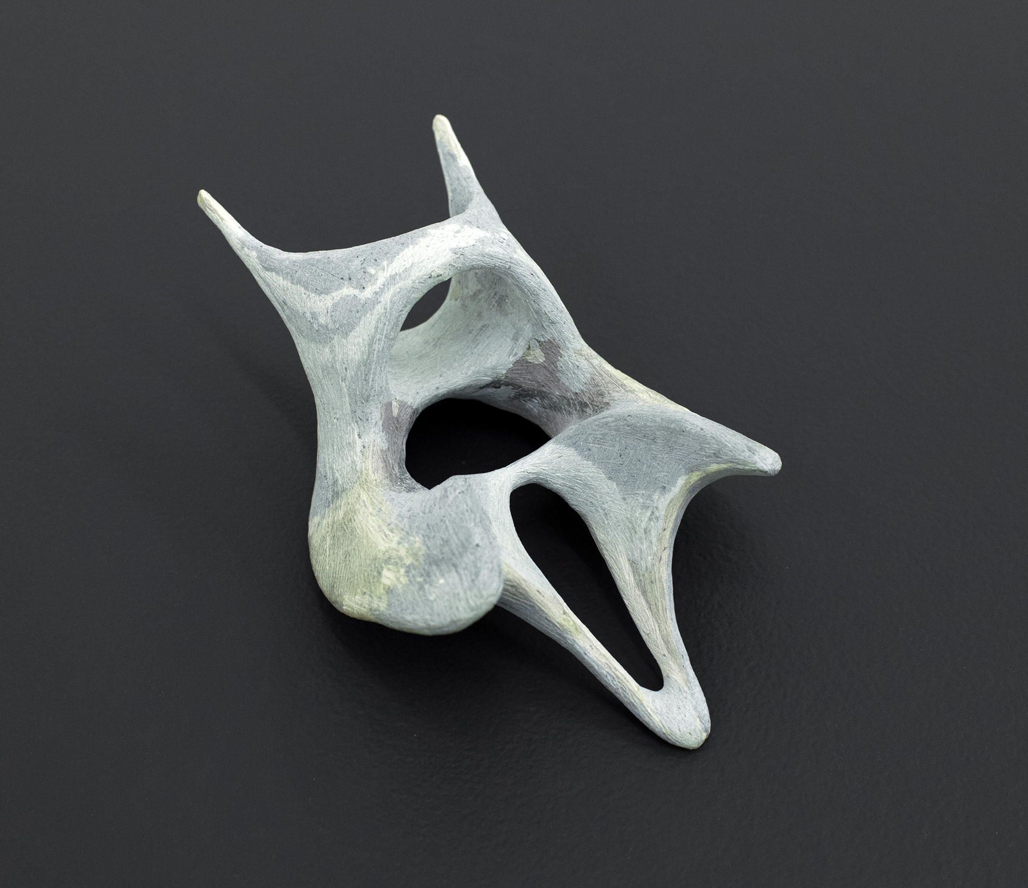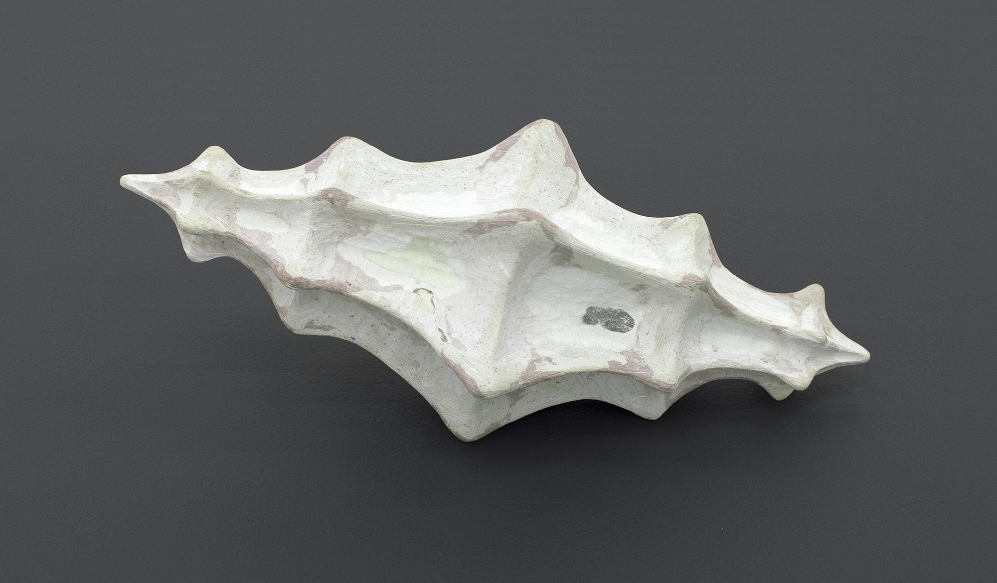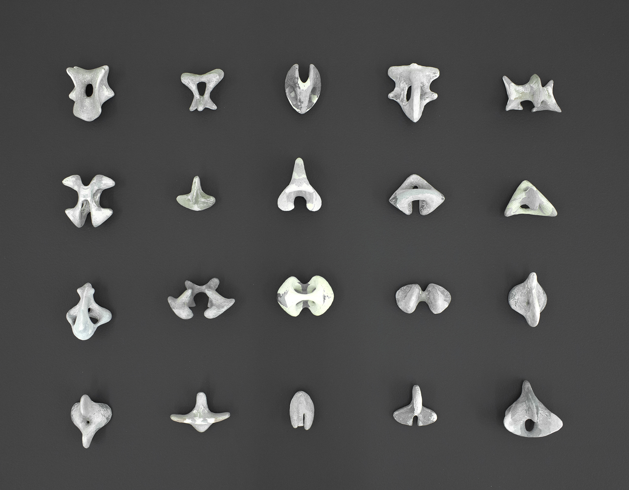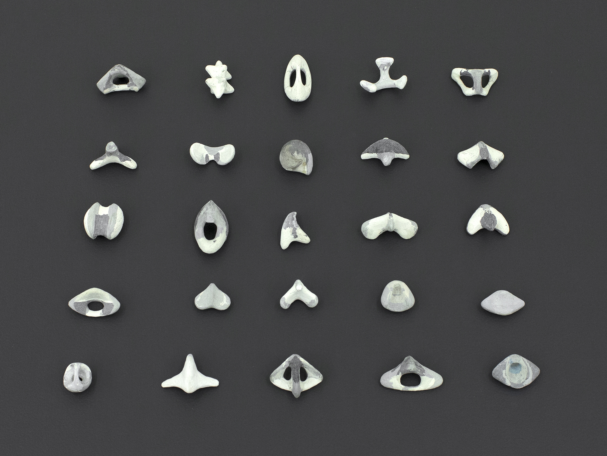For nearly two decades Matt Hoyt has been shaping a bevy of hand-made objects out of various clays and putties. The majority of his works are very small, shaped by devoted hands, subtly surfaced and worked over extensive periods of time. The pieces seem to hold a locked potential, willed into a kernel of physicality by the artist’s concentrated mental attention. Over the last two years he has seldom started a work from scratch, instead he refers back to a dense archive of previously initiated objects which exist in various states of completion. The reason for this, other than a simple desire to finish what was started, is a deliberate attempt to introduce further complexity into his process: tangling each object’s story through a daily activity of cutting, mending, scraping and filling. Sometimes returning to a piece years later, the original intention may be completely lost on the artist, requiring him to listen and respond only to the metaphysical history encoded in the form to prompt the succeeding steps. The works inhabit a state between the recognizable and peculiar, and their diminutive size begs a close look, imposing an intimate experience of a flickering between familiarity and strangeness. They might resemble organic forms such as vertebrae, exoskeletons, mollusks and sea pods or inorganic things like rocks, stone-age tools and architectural miniatures. The larger forms stand solemnly alone, while smaller forms cohere in arrangements of many: a multitude of innies and outies, slopes and spikes. These arrays imply a kind of animation from one piece to the next: an eruption of minute alterations that echo the artist’s practice. The adjustments imprint a complex time signature onto each piece, as a slow geological evolution washes over the work.