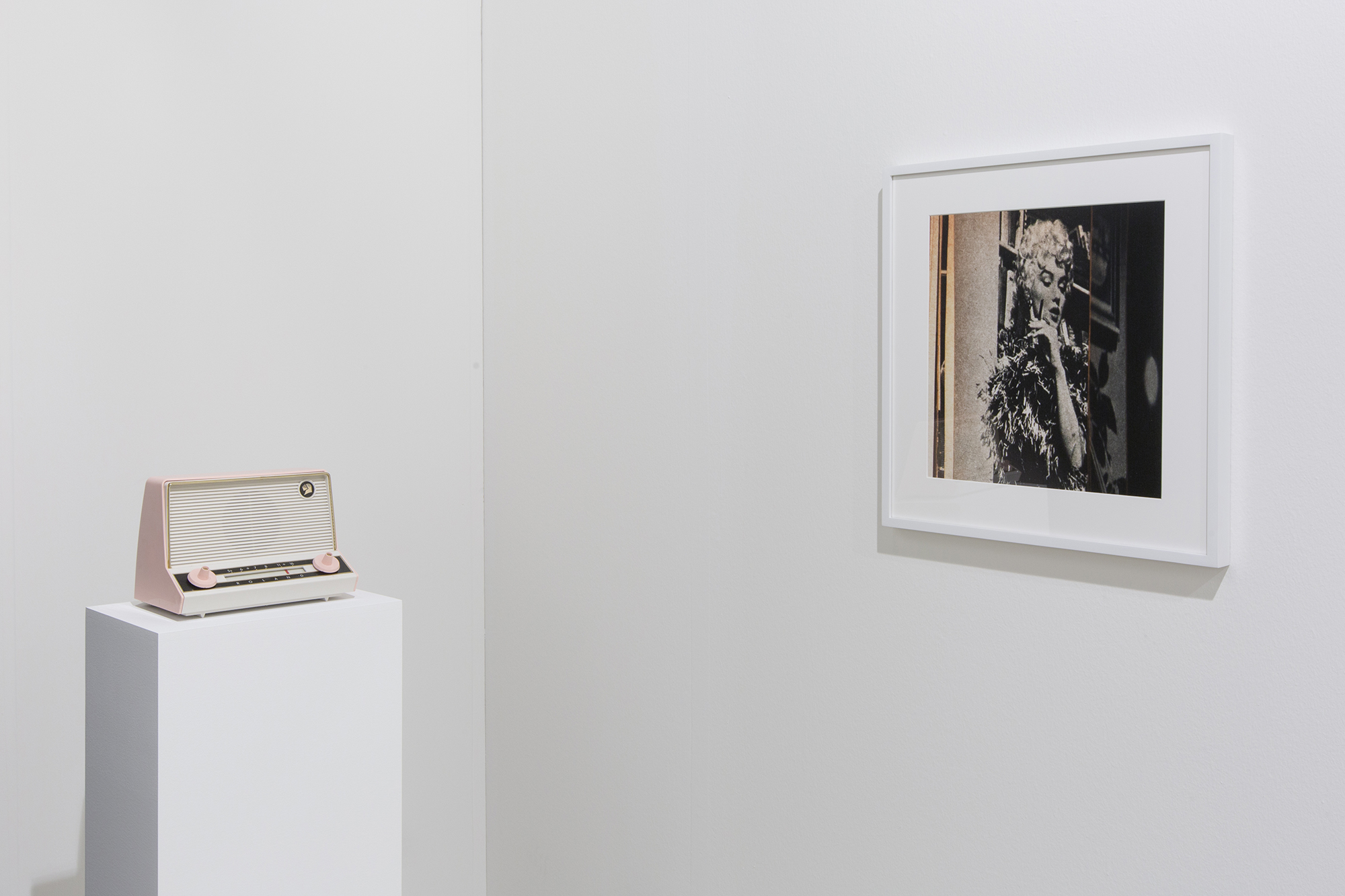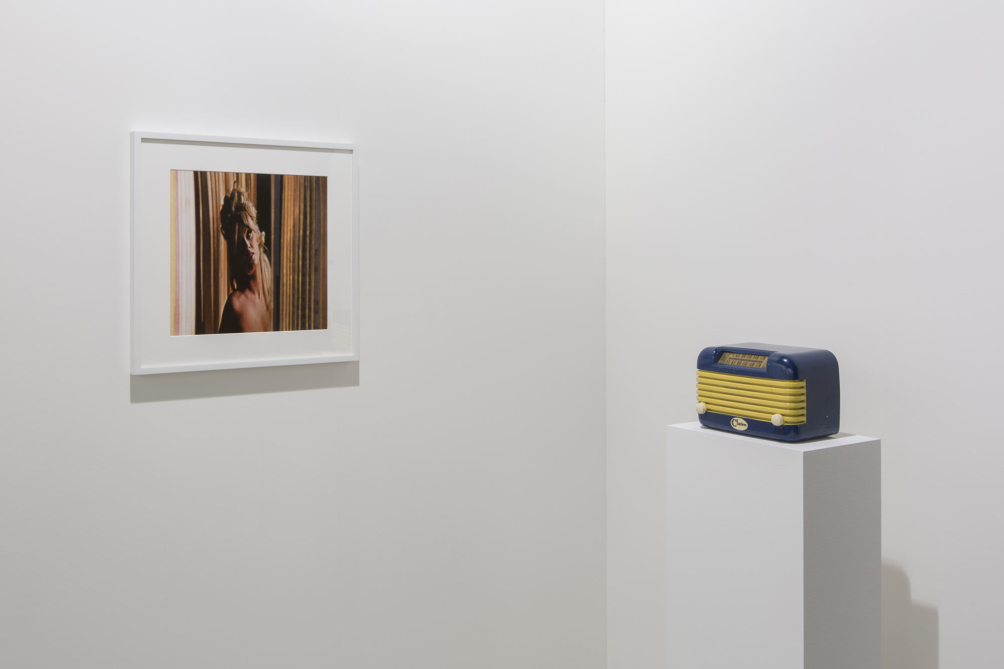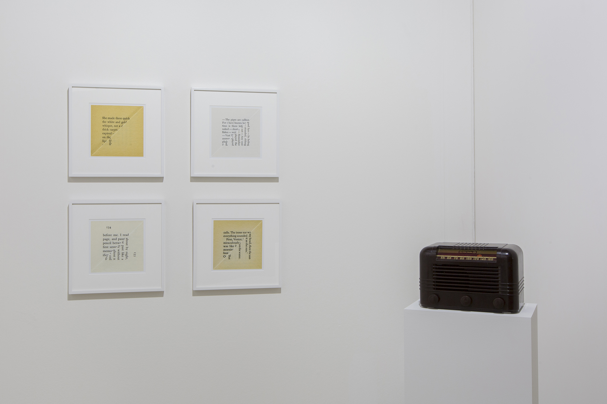 Baum’s “Naked Eye” series features fanned out pages of paperback books, spread open to reveal isolated figures. Anonymous women and iconic movie stars peek through brightly-colored page edges as if spied through parted curtains. These seductive images are accompanied by appropriated text works: gelatin silver prints from Baum’s historic "Card Catalogue" series and poetic verses from her more recent "Dog Ear" work. DeJong is a writer and performer working for over three decades on narrative within the context of avant-garde music and contemporary art. DeJong’s densely descriptive work, written for her own transporting voice, is here transmitted through modified vintage radios. She leads a meandering chronicle through myriad environments: a bustling Madison Avenue, a log cabin warmed by a crackling wood fire, a tour of a dusty apartment and its guest room revenants. The radio serves as the portal to complex worlds described by DeJong’s disembodied voice as Baum stitches fragmented stories together through captured slices of image and text.