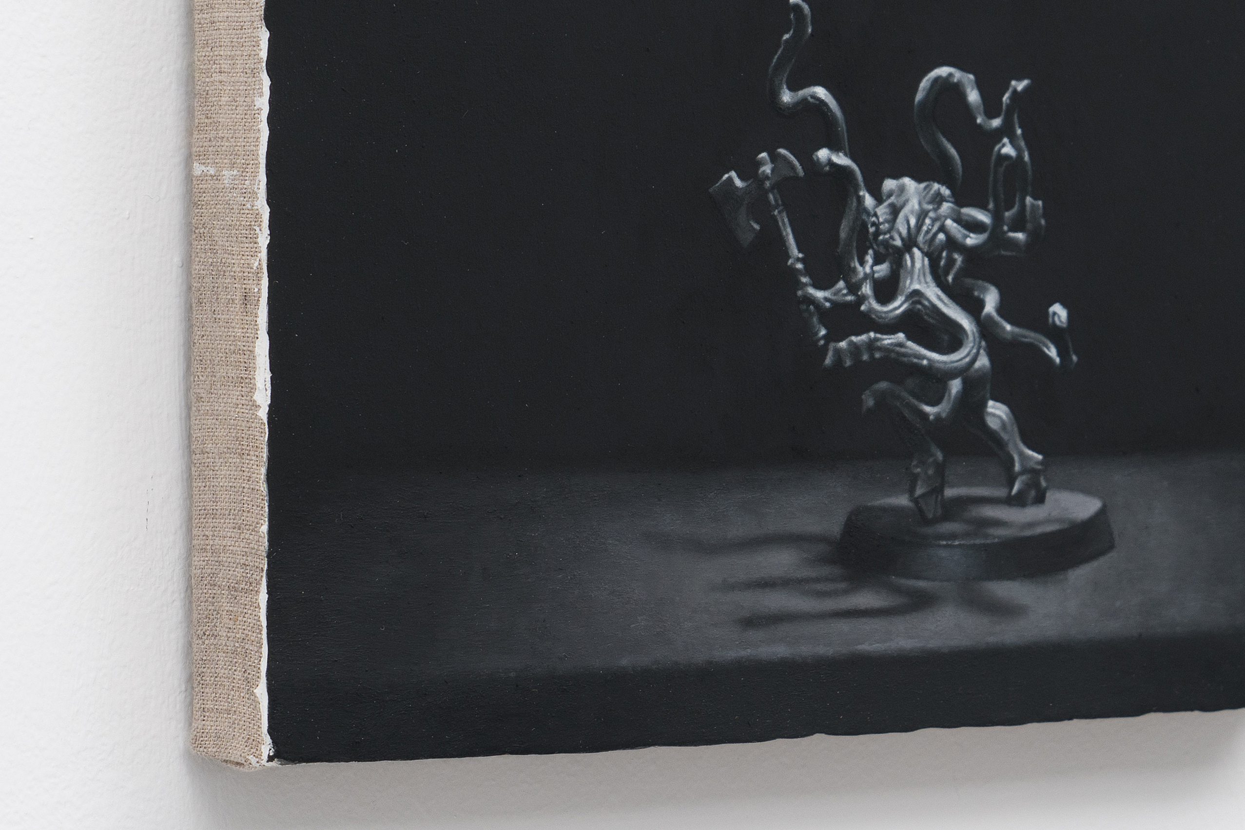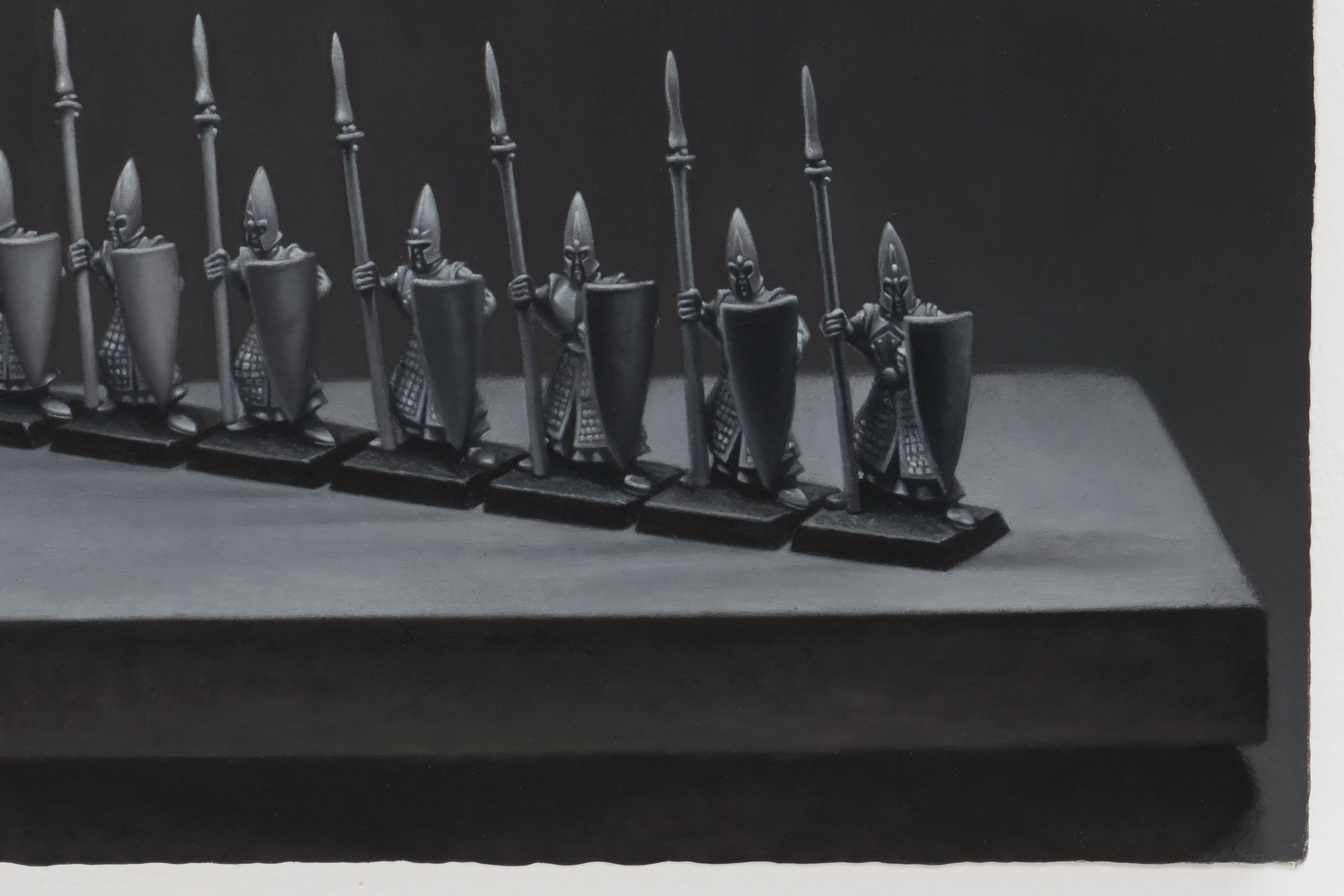 seven high elf spearmen in gradient formation, 2024, Oil on linen over panel, 5 ½ × 8 ¾ in. (13.97 × 22.23 cm)