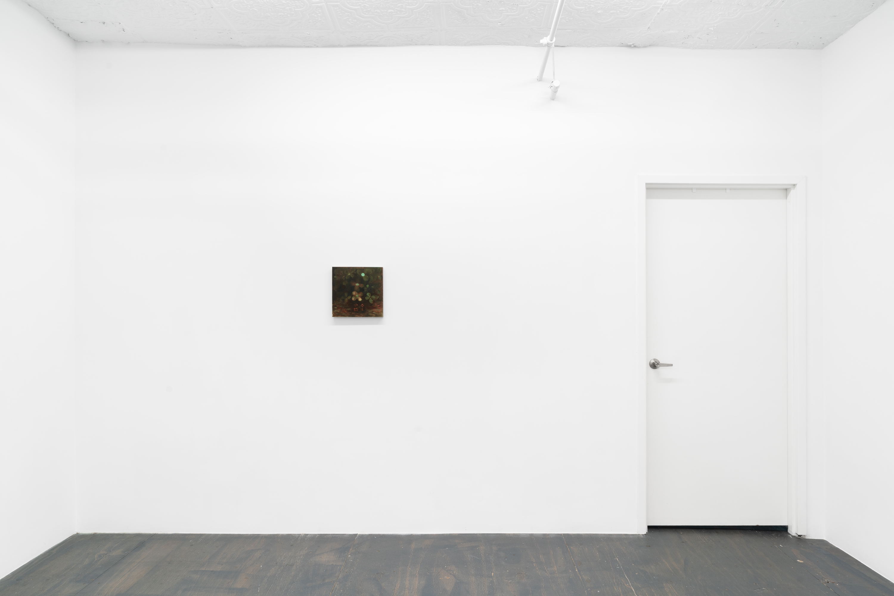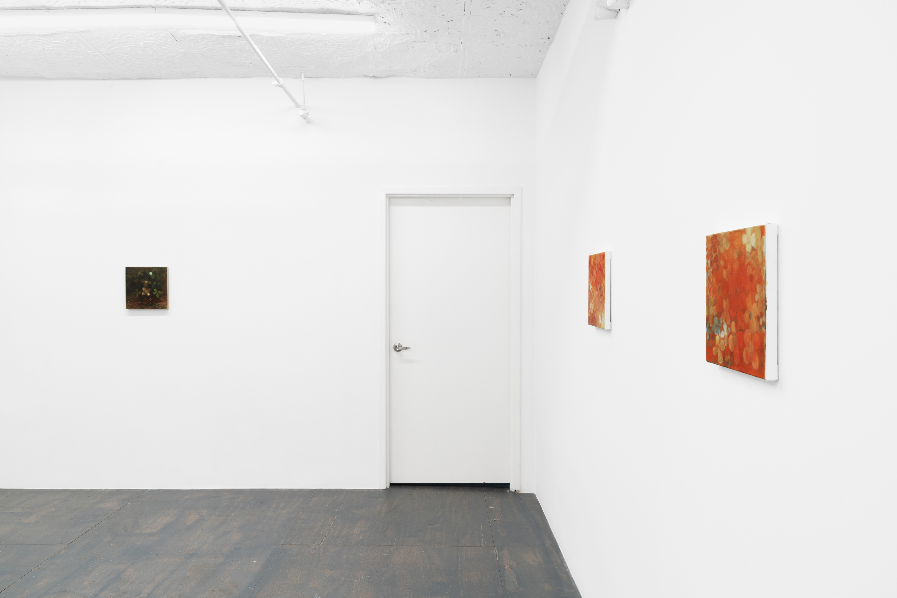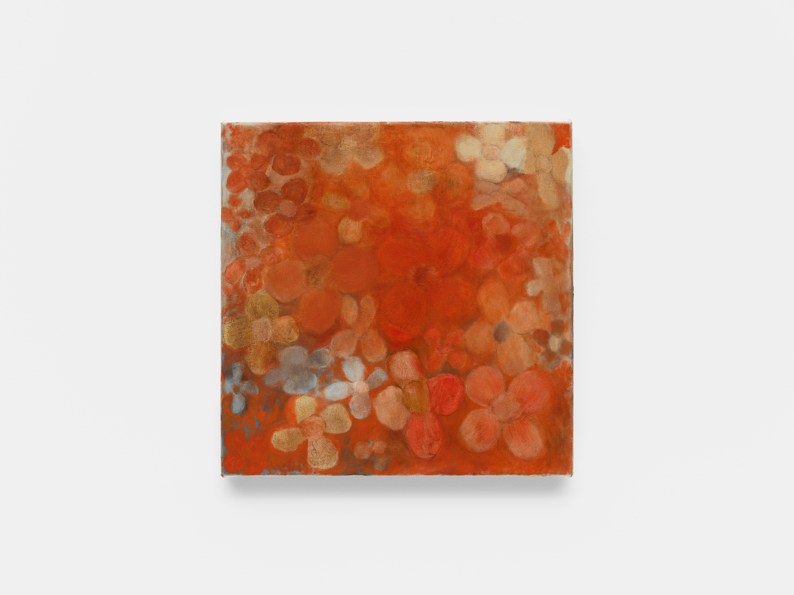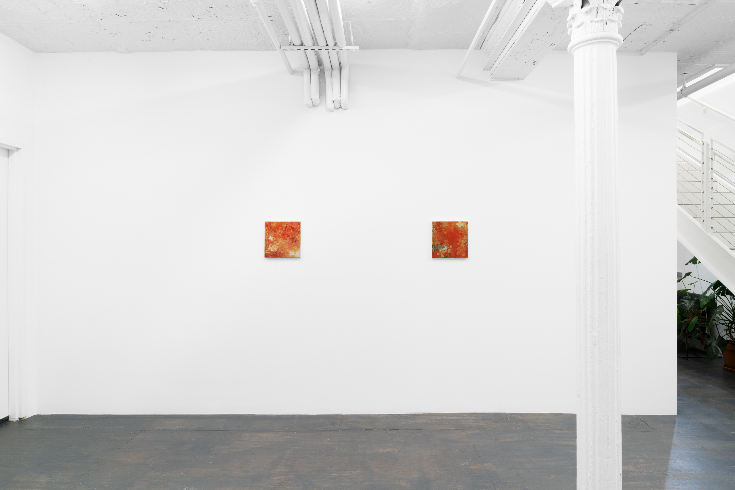 Downstairs, a collection of small flower paintings acts as a counterpoint to the abstract works above. Each presents a proliferation of generic flower forms, the motif composed of four simply drawn petals which rotate and brush up against each other. The shapes recall Gothic quatrefoils or crosses, evoking historical and symbolic precedents while remaining provisional and brutally blunt. Blooms compress and spread across the surfaces in patterns that reaffirm their inherent flatness, signaling an agnostic attitude towards figurative portrayal. In the studio they develop alongside the other works as meditations on accuracy and color, serving as a pressure valve against the intensity of abstraction. Each work is singular yet contributes to an evolving web of poetics.