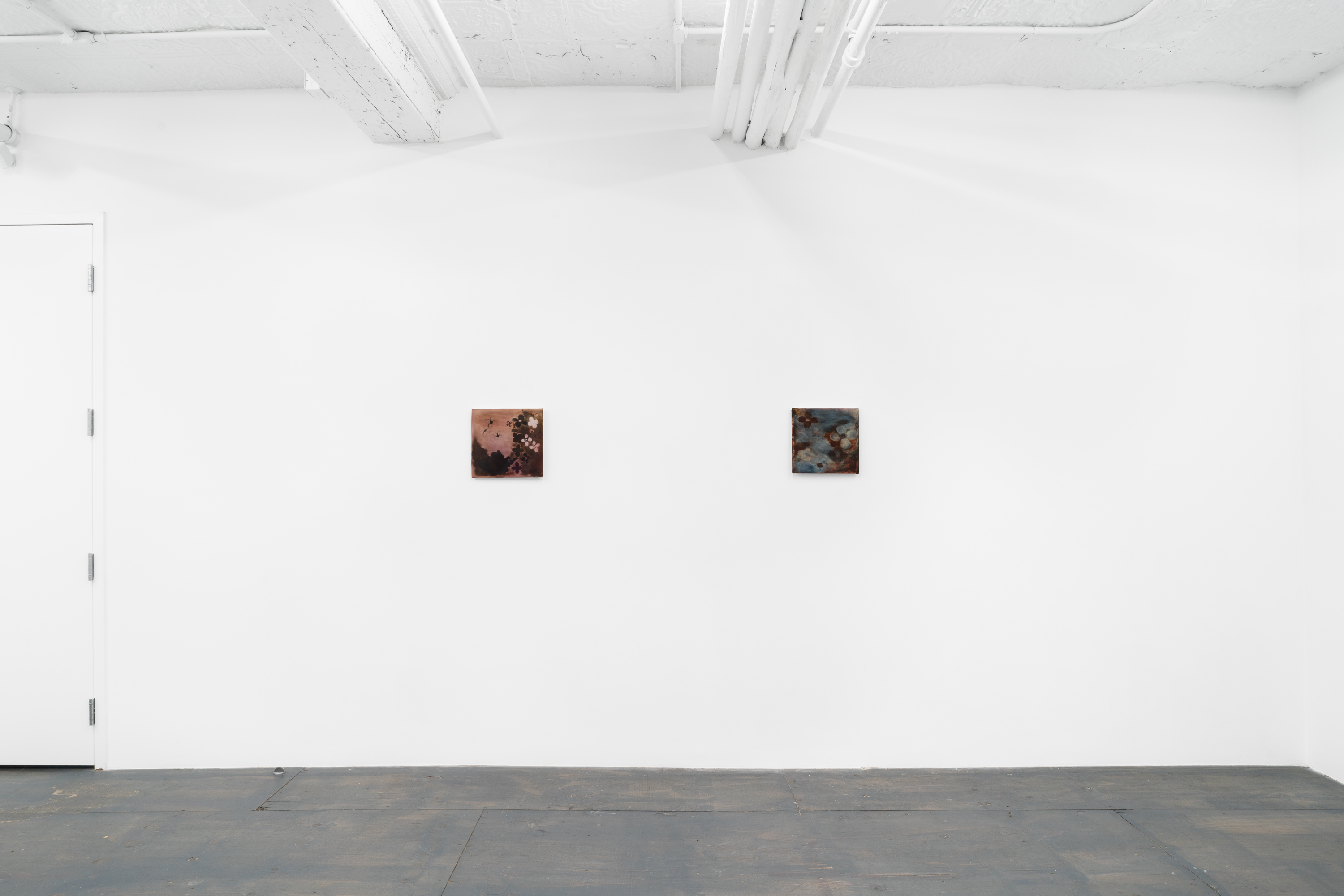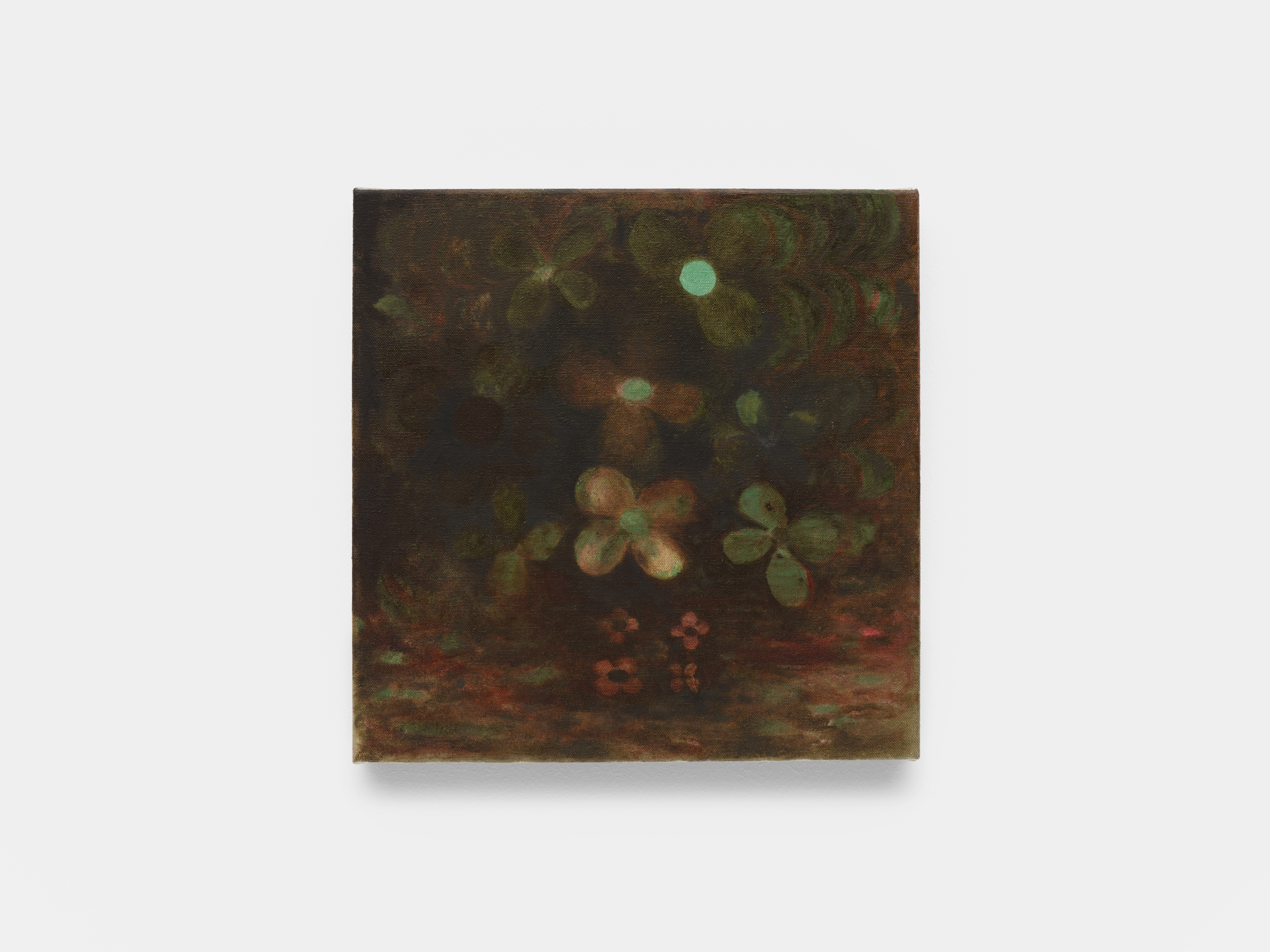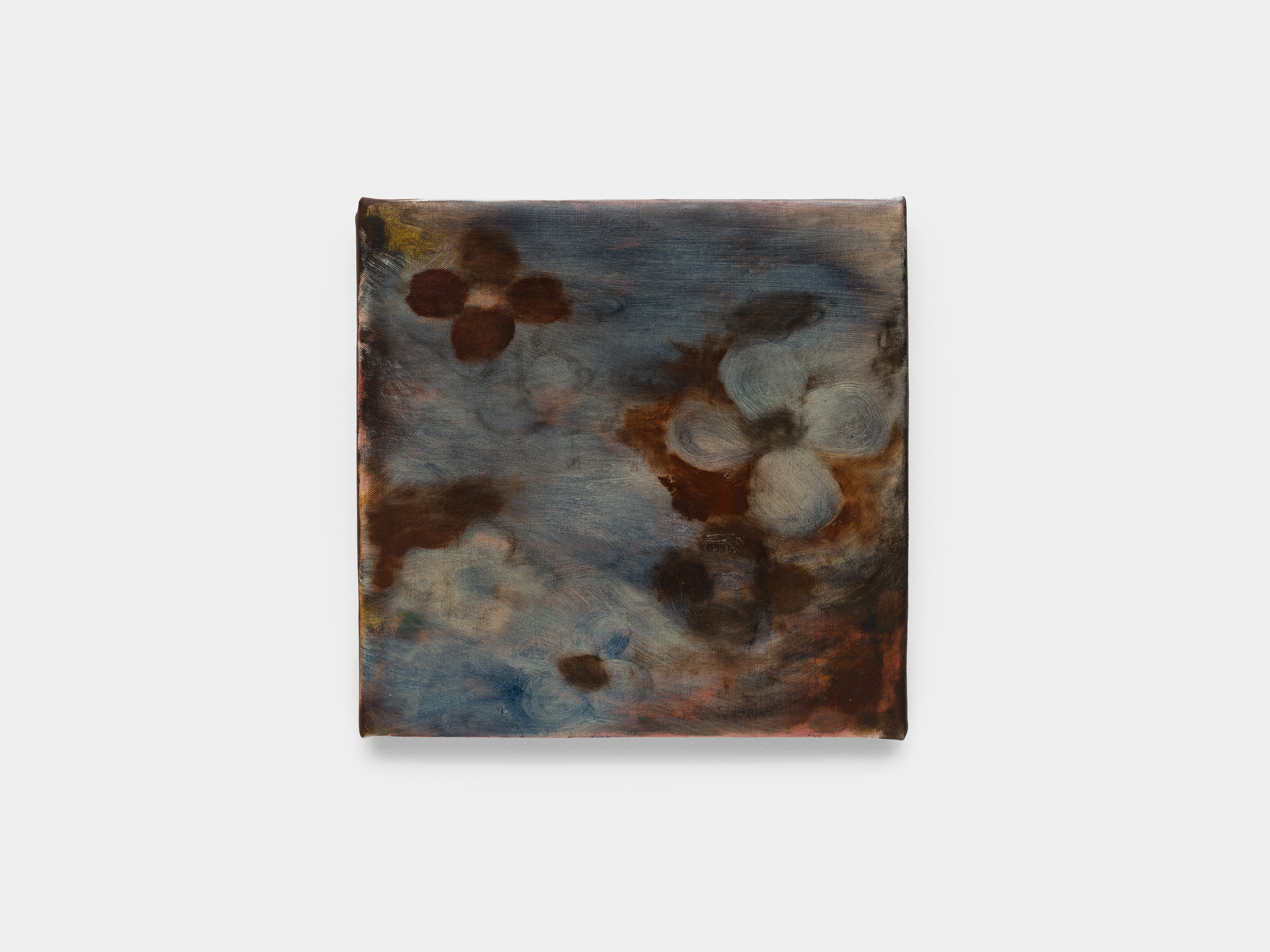 Bureau is pleased to present Couplet, Kate Spencer Stewart’s second solo exhibition with the gallery. Its title references the poetic form in which two lines with the same meter complete one another, a structure echoed throughout the show in a mirrored composition: six large-scale atmospheric abstractions above and six intimate flower paintings below. Within a consistent square format, the paintings converse through subtle formal affinities and abrupt deviations in fugue-like correspondences. Painting, for Stewart, is an act of surrender and devotion: each work develops through cycles of repeated actions and careful observation, negotiated within a prolonged engagement of escalating material interactions.