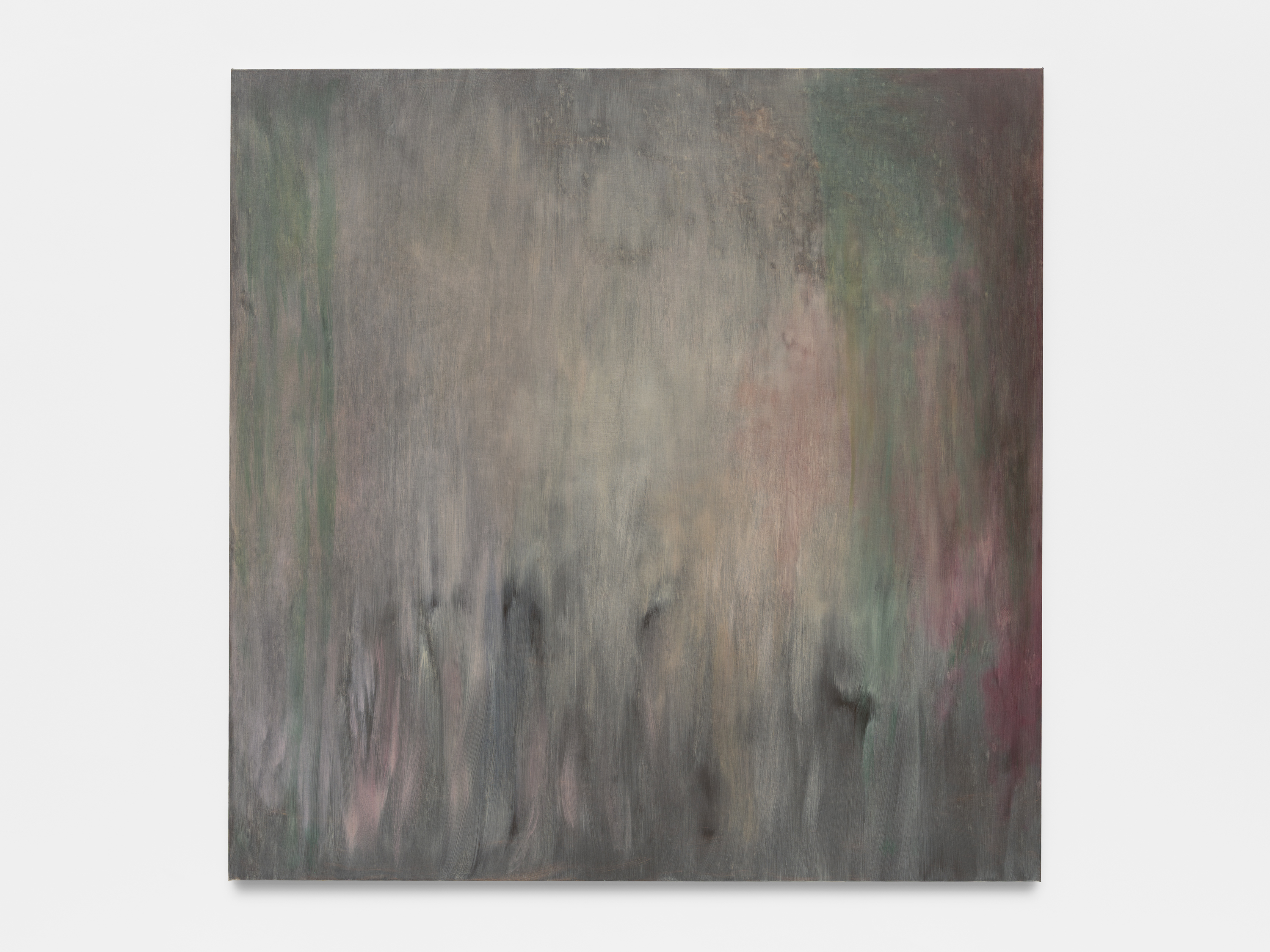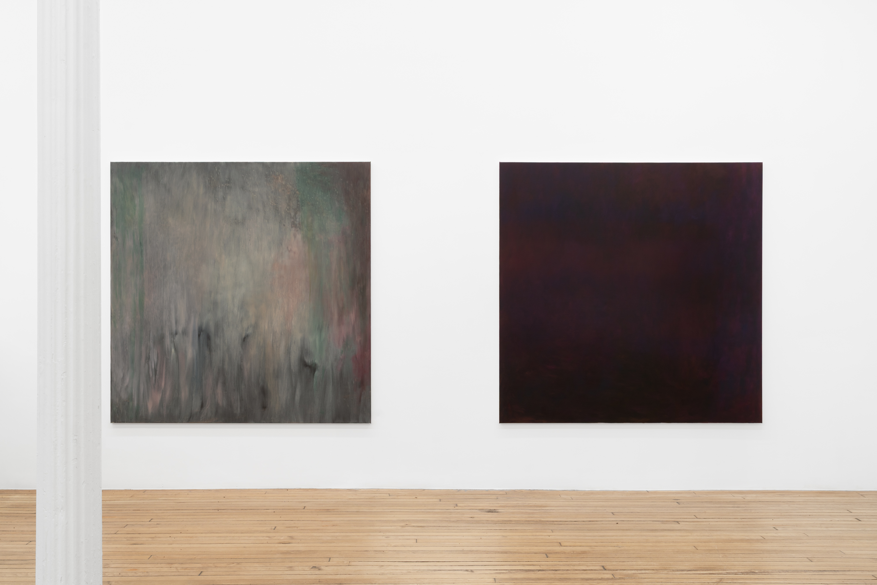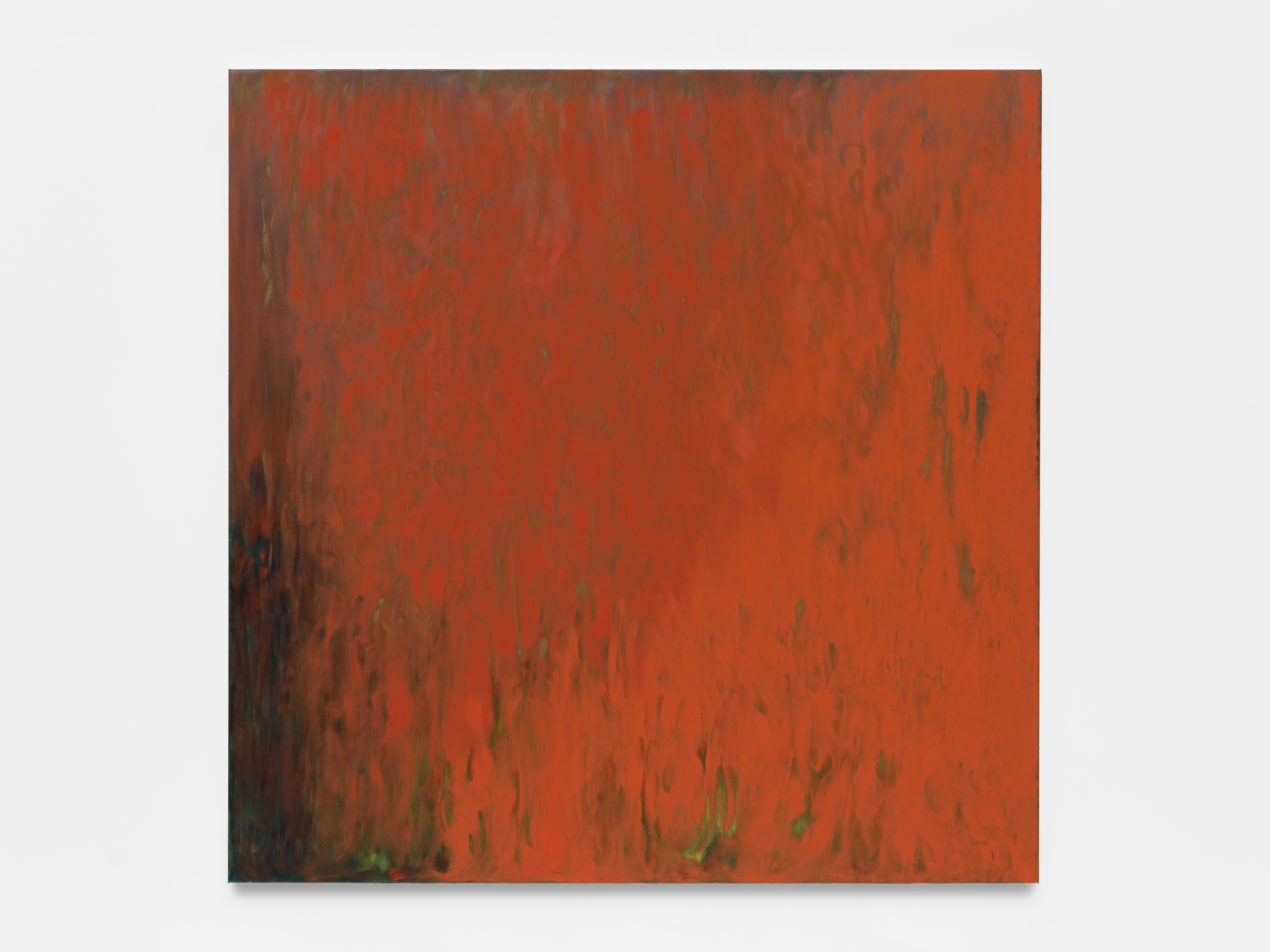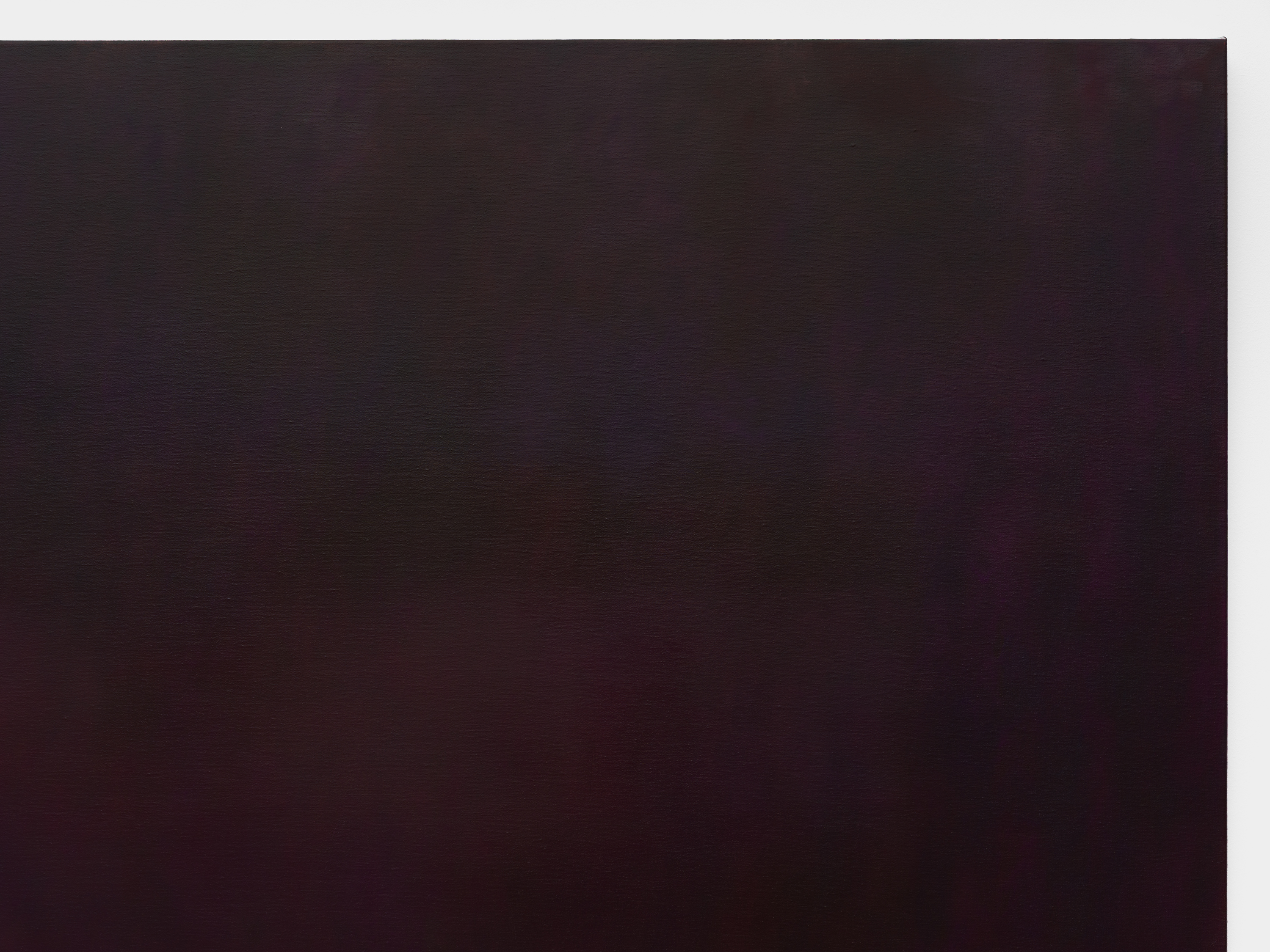 Her paintings are made up of traditional pigments in oil, layered over underpaintings either as pentimento or fields of near-obliteration. Conceived as pairs in different studios, first during summer in upstate New York and later upon returning to Los Angeles, her works trace a process of divergence, carrying echoes of their counterparts while developing their own attributes. In the large paintings, vertical and horizontal gestures recur across this suite, along with a compositional acknowledgement of the canvas’s edge. Ritual (all works 2025) rises sharply in strokes of red and green that seep into a dappled, muted pink, while Verily Verily builds a dense vermillion field amongst looping figure-eights of green. Morning Star evokes a vast sky of Venusian clouds that coalesce and concentrate near the bottom, distorting under their own gravity. Sovereign glows purple from glazes of lapis lazuli, bright reds and deep violets, unifying a still and contemplative plane within its surface.