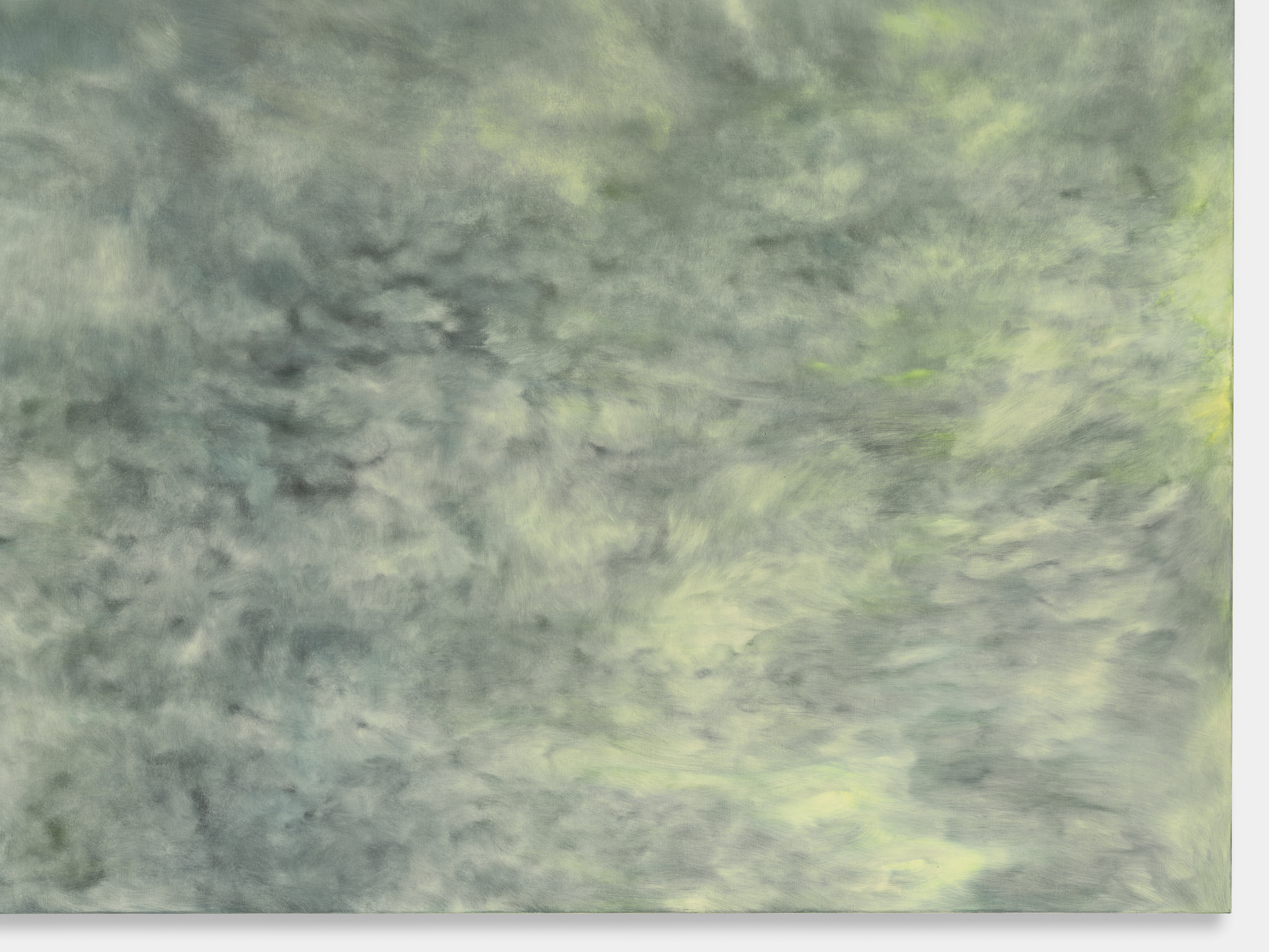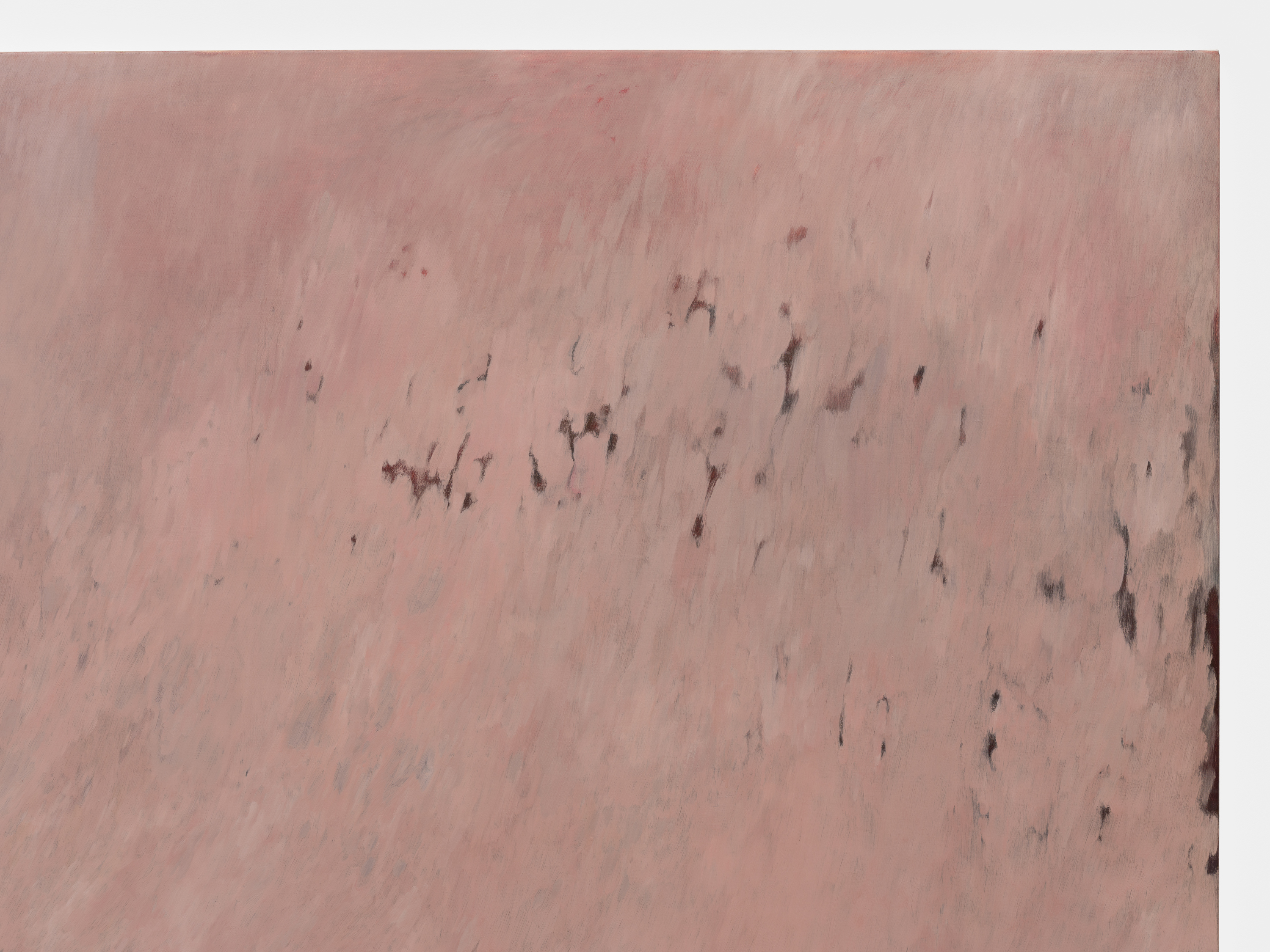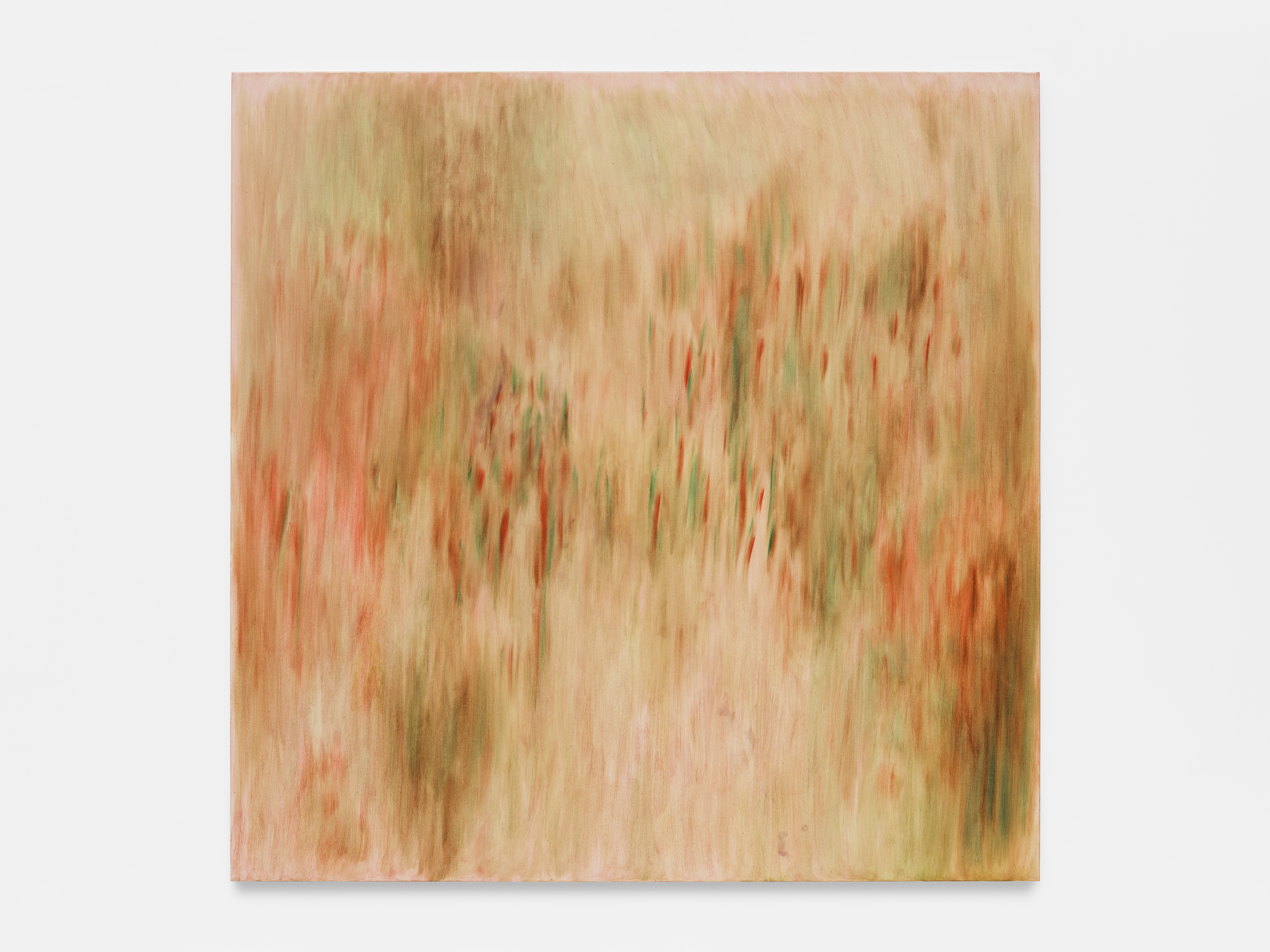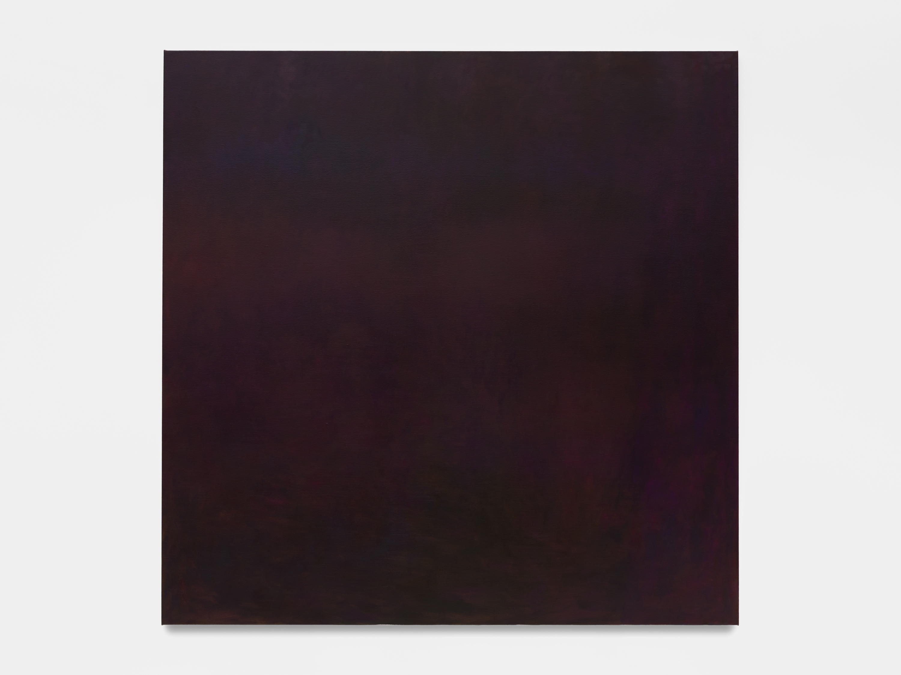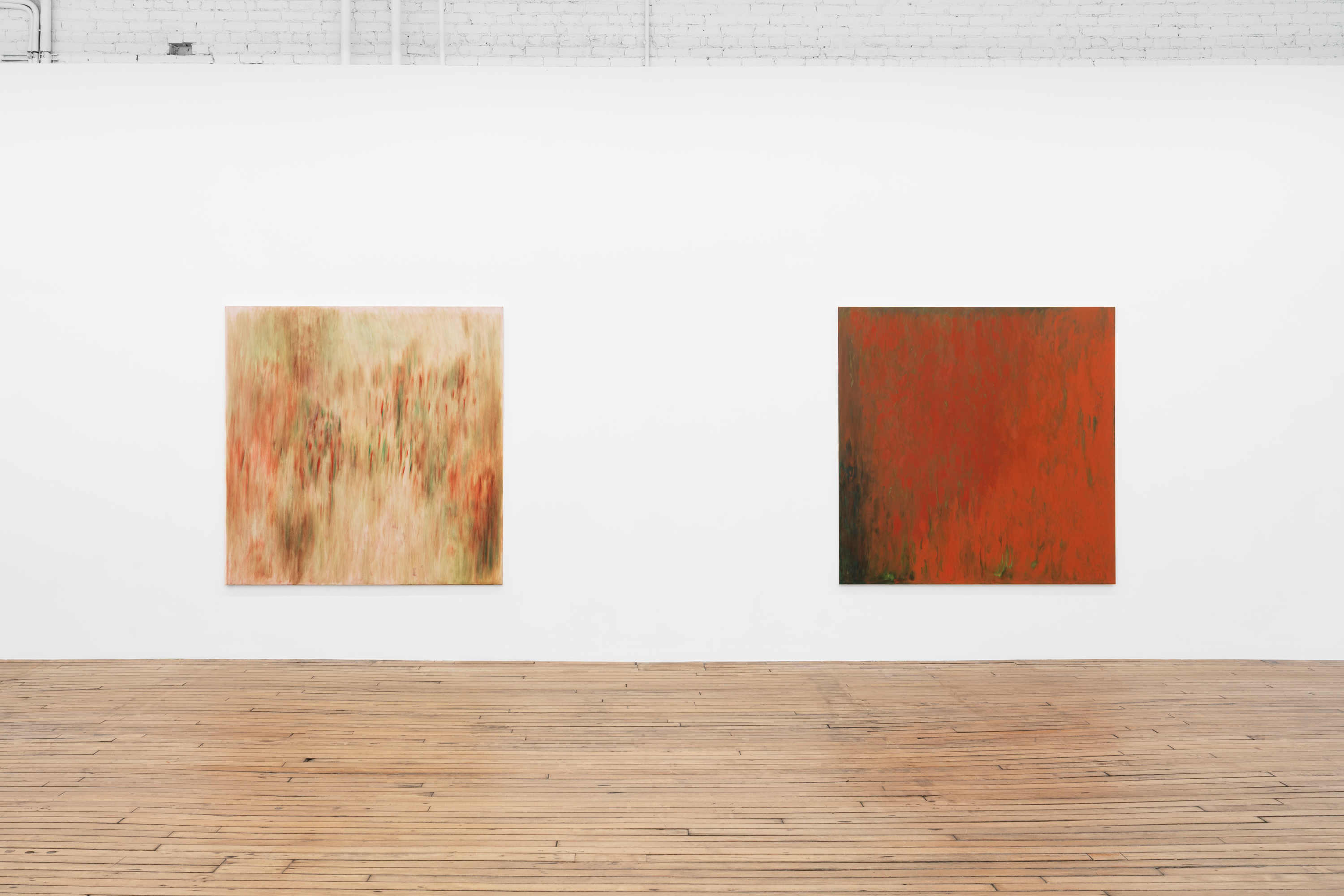 Her paintings are made up of traditional pigments in oil, layered over underpaintings either as pentimento or fields of near-obliteration. Conceived as pairs in different studios, first during summer in upstate New York and later upon returning to Los Angeles, her works trace a process of divergence, carrying echoes of their counterparts while developing their own attributes. In the large paintings, vertical and horizontal gestures recur across this suite, along with a compositional acknowledgement of the canvas’s edge. Ritual (all works 2025) rises sharply in strokes of red and green that seep into a dappled, muted pink, while Verily Verily builds a dense vermillion field amongst looping figure-eights of green. Morning Star evokes a vast sky of Venusian clouds that coalesce and concentrate near the bottom, distorting under their own gravity. Sovereign glows purple from glazes of lapis lazuli, bright reds and deep violets, unifying a still and contemplative plane within its surface.