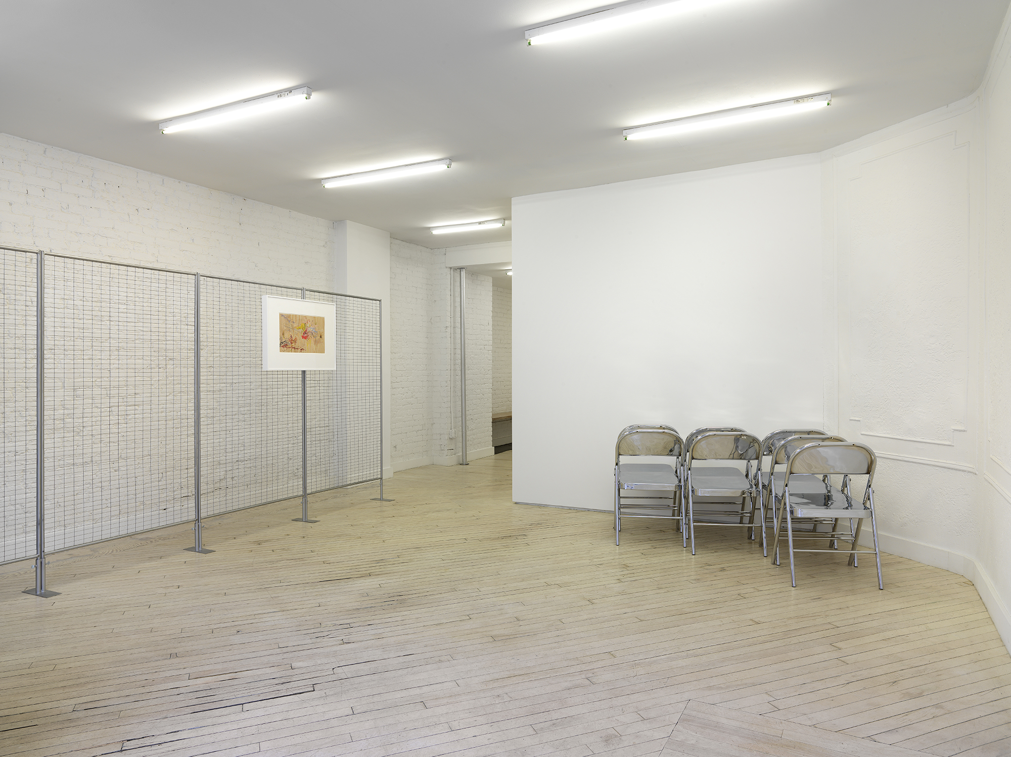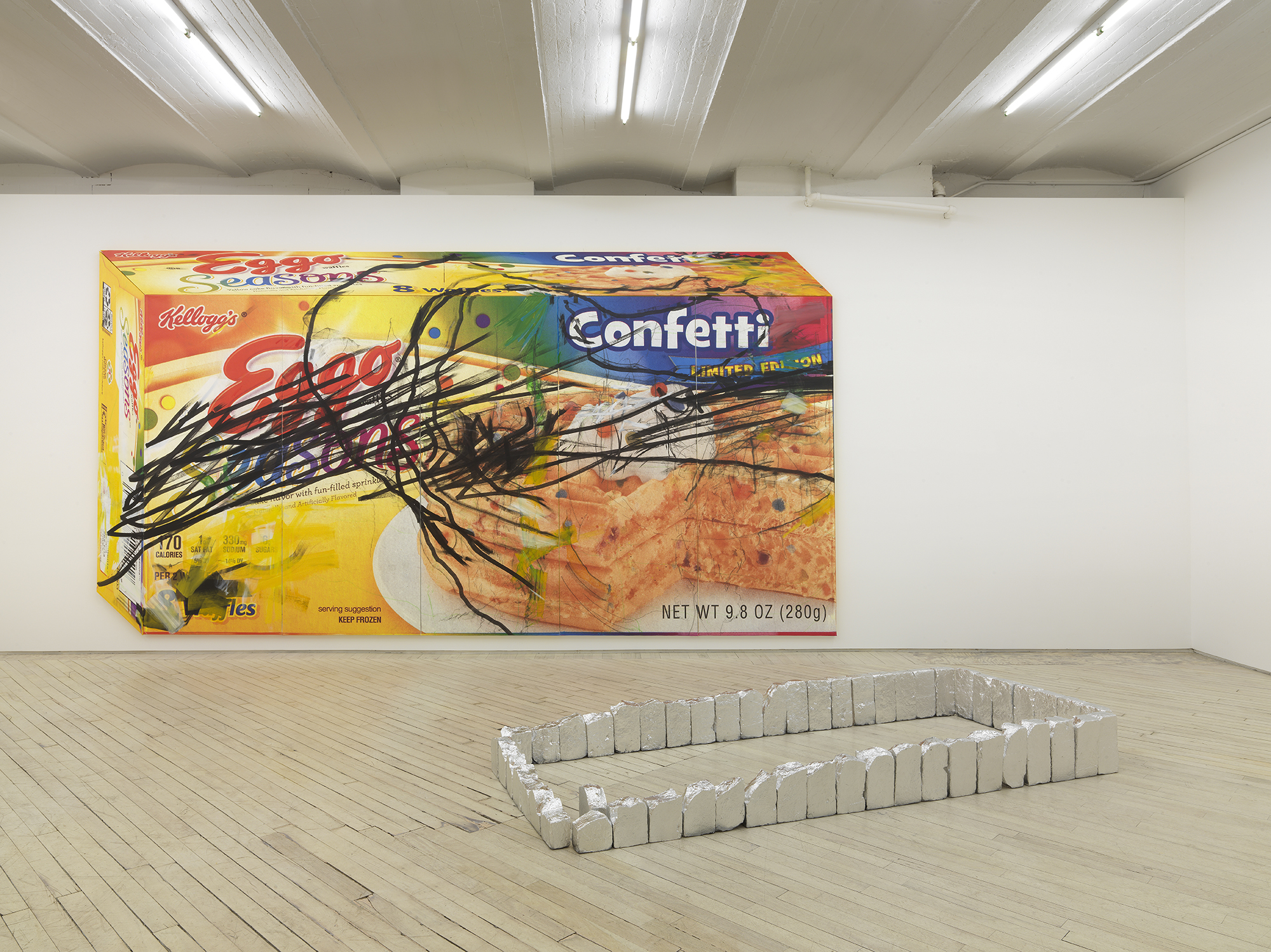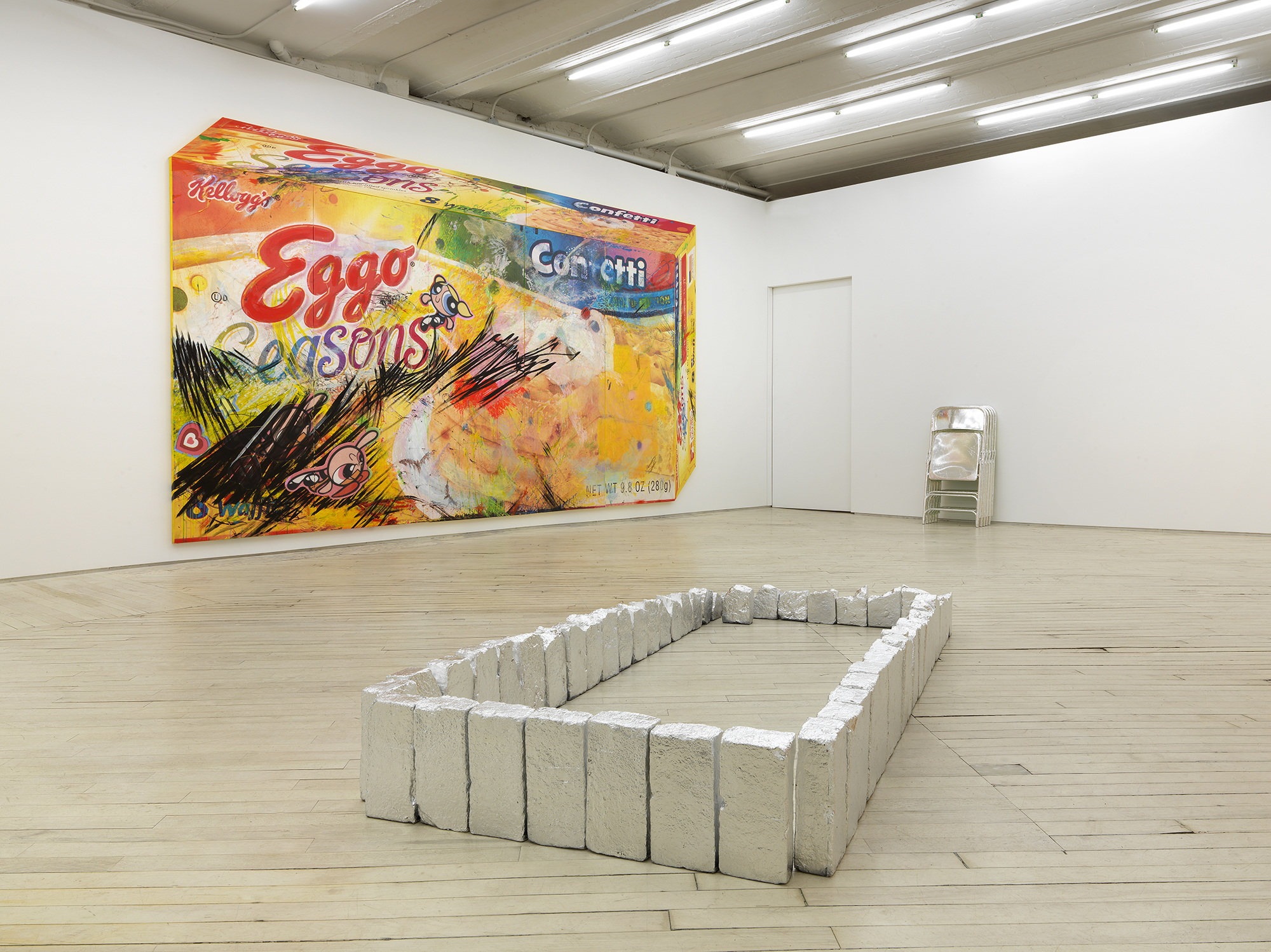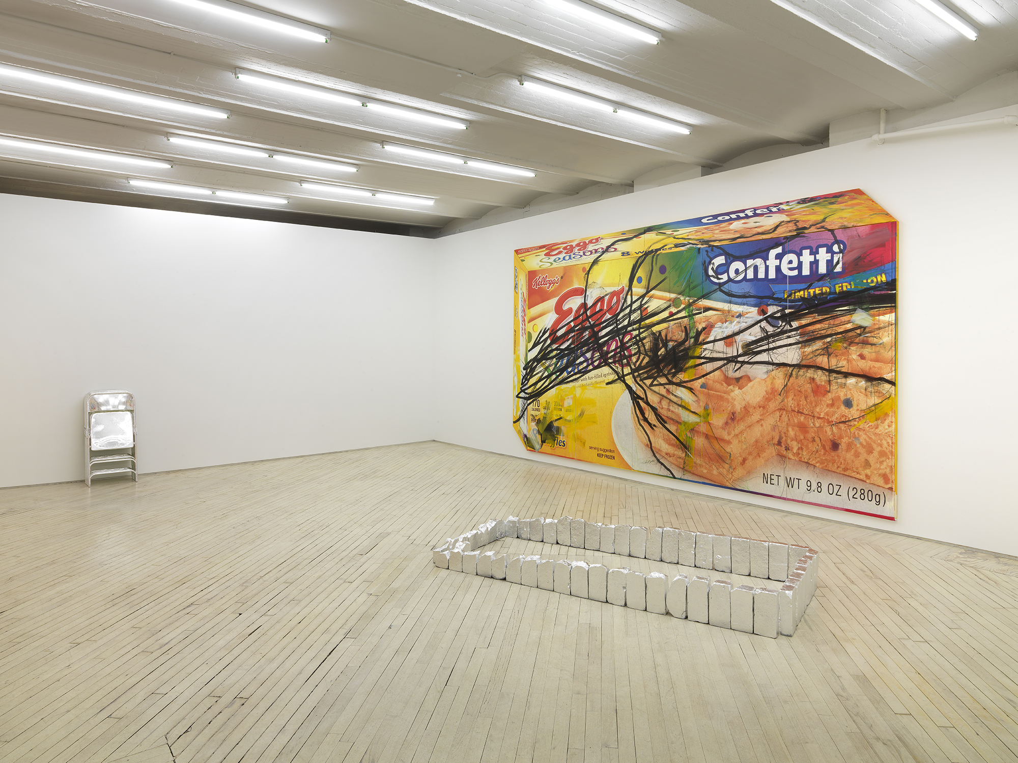 Bureau is pleased to announce Tom Holmes’s exhibition, L’Eggo My Eggo®, his third solo at Bureau. The exhibition collides two distinctly American vernacular iconographies of saccharine pop and austere minimalism and introduces the artist’s recent interest in automatic drawing. Two monumental paintings dominate the gallery walls, their expressive, sweeping and jagged gestures buzzing atop the smooth graphic of Eggo® waffle boxes. The day-glow eruption of color and frenetic movements are reflected in the cool, metallic surfaces of foiled rectangular brick grave plots and disquieting formations of chromed metal folding chairs.