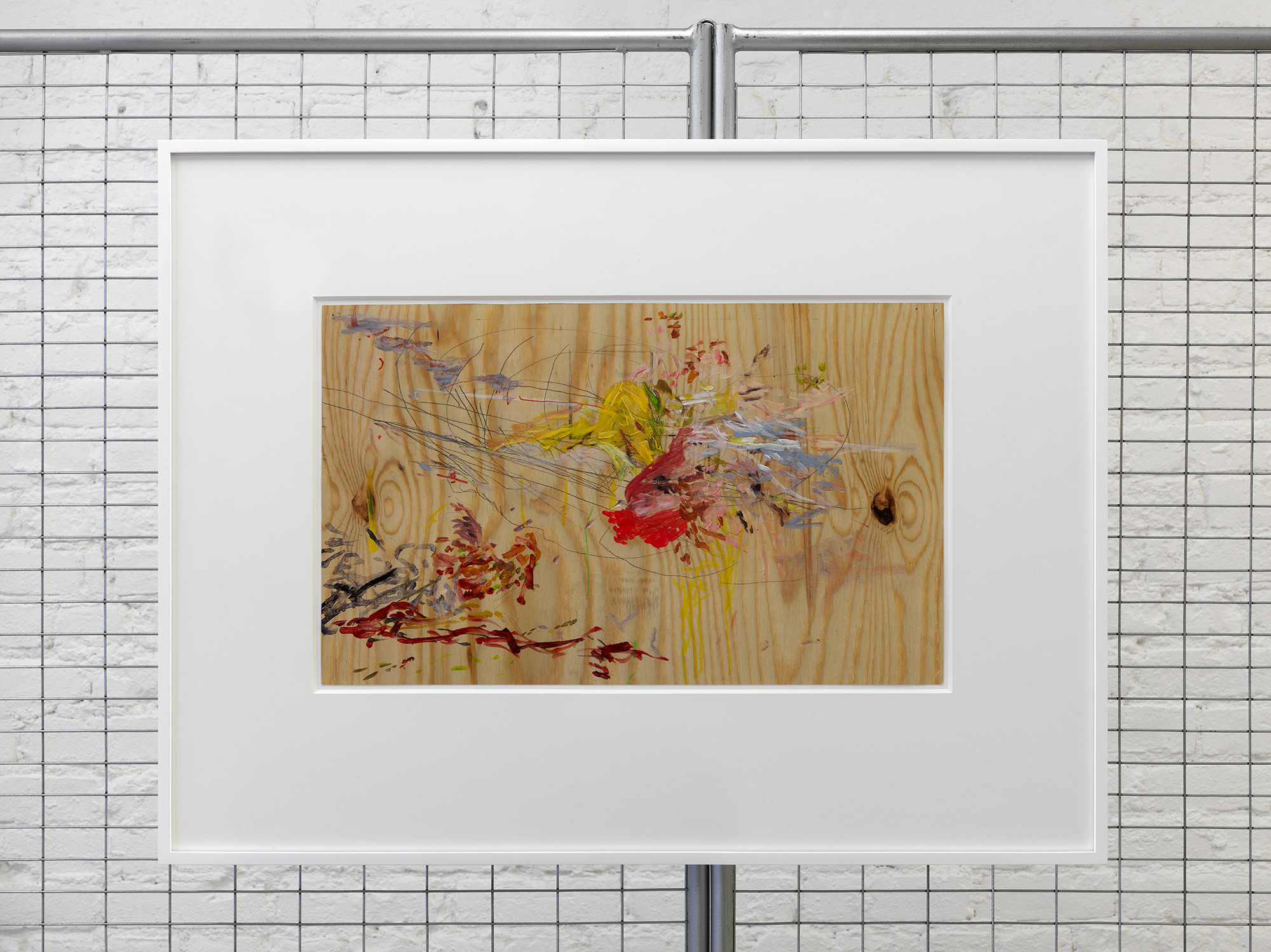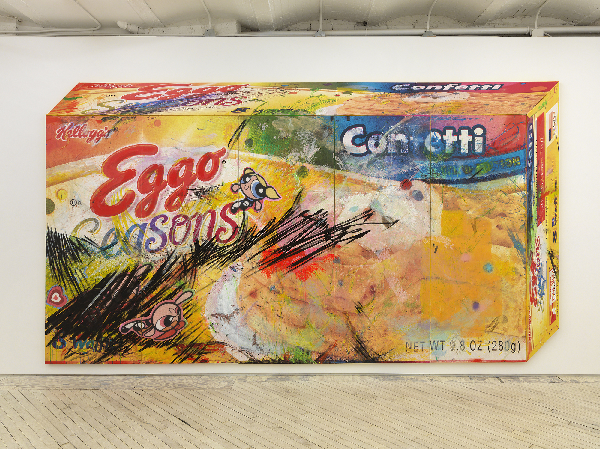 Consumables geared towards the supple minds of children have engrossed Holmes for many years, compelled by the complexity of desire and dread they inspire. His first Trix® cereal box urn of 2010 introduced his incisive and heart-rending blend of funerary pop at his show Silly Rabbit: a gravestone and an urn at Dispatch. In these boxes full of promise and plenty Holmes recognizes a locus of control and fear: a mirage of candy-pop force fed to us en masse as the innocently complacent subjects of corporate ego and violence. Fear eats us as we children swallow the sugar coated fantasies of our first man-made substance-induced reveries. Holmes’s new paintings – two shown here of a suite of four – feature a vastly scaled-up and flattened waffle box announcing an explosive fantasy of infantile breakfast joy. The box’s graphic finish serves as ground for a flurry of abstract marks of expanded automatic drawing. Over the past two and a half years, working with a hypnotist, Holmes has sought to excavate the expressive potential of the subconscious mind through automatism, connecting a deep anxiety and fear of the inevitable with the pure communicative potential of the hand. The movement of the pen vigorously and subtly transcribes the non-verbal. In one composition comic heroines surf the sprawling lines and colorful passages ushering routes between mind and body; pop and expressionism.