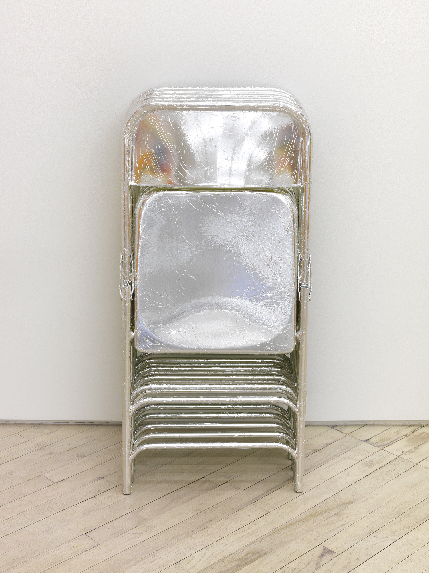 If the paintings mine the abstract mind, Holmes’s sculpture delineates the limits of the physical body: bodies in formation, barricaded and at rest. In gleaming chrome and silver, these forms impose geometry on the body. For many years, Holmes has implemented the architecture of the funerary in his work. Gravestone, reliquary, urn and plot sculptures assert the power of that final, permanent application of architecture on the body. Here the rectilinear plot, composed of jaggy foiled bricks holds a poetic space of beauty and modesty. The reflective finishes of these new sculptures stresses that of surface and optical over the spatial and weighty, deepening the metaphysical nature of the show. Tom Holmes was born in Ozona, Texas, lives in Jackson Co. and works in Putnam and Cannon Co. Tennessee. Selected solo exhibitions include ‘Piss Yellow / Bars and Stars’, Bureau New York; ‘Temporary Monument’, Kunsthalle Bern; ‘Part of This Complete Breakfast: objects for a wake’, Galerie Catherine Bastide, Brussels; ‘Painted Bones - some reliquaries’, Bureau New York; ‘Noisy Bottom’, Exile, Berlin. His work has been included in group exhibitions at the Atlanta Contemporary Art Center; Freymond-Guth Fine Arts Ltd, Zurich; Palais de Tokyo, Paris; Malmö Konstmuseum, Sweden and The Whitney Museum at Altria, New York. He has been awarded grants and residencies from The Pollock-Krasner Foundation; The Joan Mitchell Foundation; Ox-Bow and The Edward F. Albee Foundation. His work is in the public collections of the Tang Museum of Skidmore College; Stiftung Kunsthalle Bern, Switzerland and FRAC Bourgogne, France.