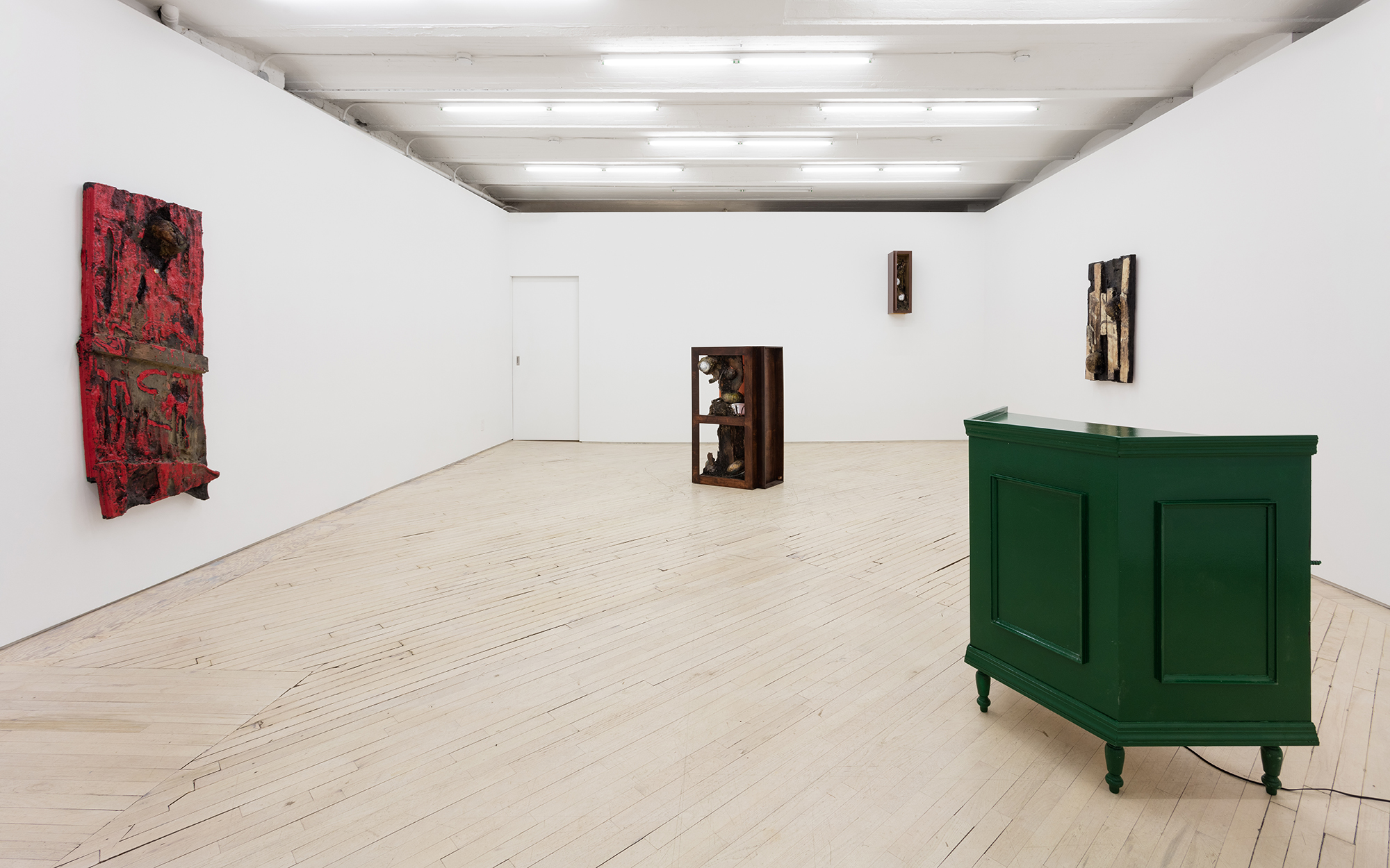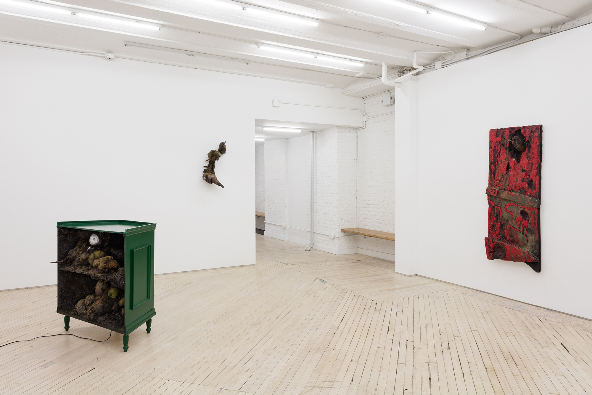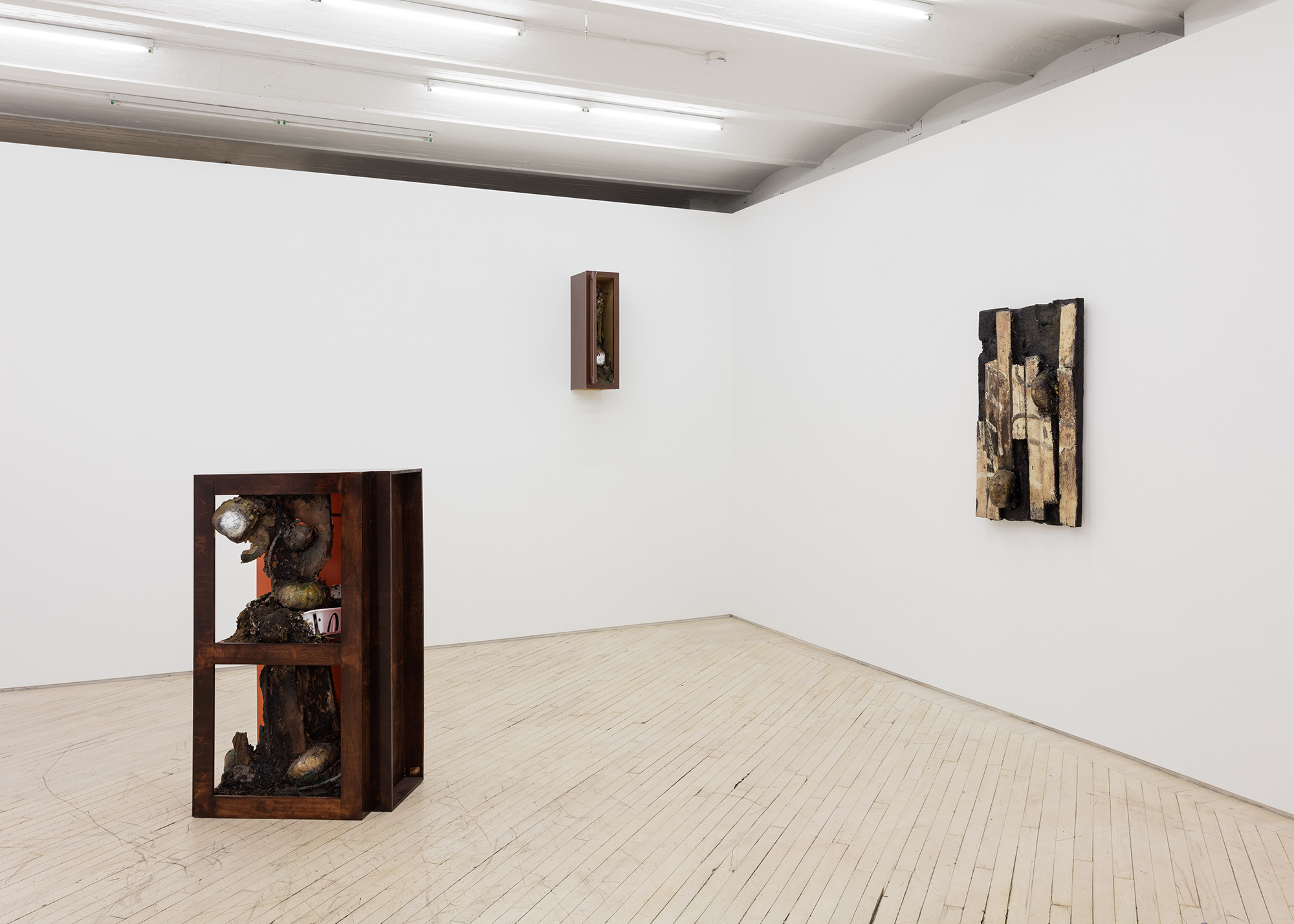 Bureau is thrilled to present MY ZONE, Brandon Ndife’s first solo exhibition at the gallery. MY ZONE features a suite of floor and wall-based sculptures composed from built furniture units overrun with abundant decay. Drawers and cabinets reveal cast vegetal forms and decomposed dioramic landscapes. The artist conjures environments where the familiar has become host to a new life or may be in the process of a terrific metamorphosis. Ndife’s work aptly offers an unsettlingly beautiful of vision of post-disaster regrowth.