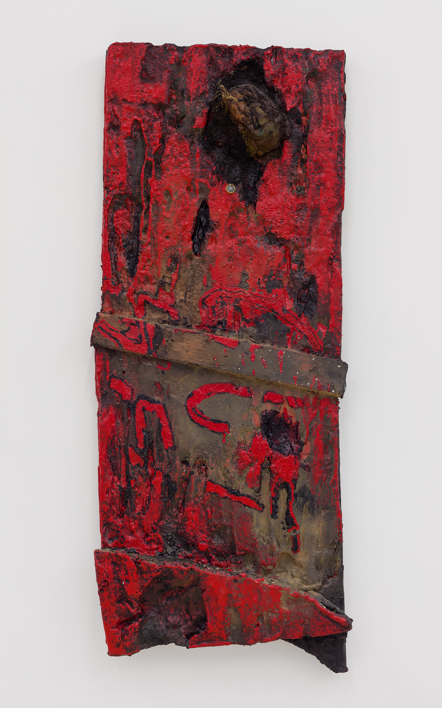 Öffnung, 2020, Corn husk, resin, AquaResin, earth pigment, enamel, wood, aluminum, 28 ½ × 15 × 15 ½ in.
