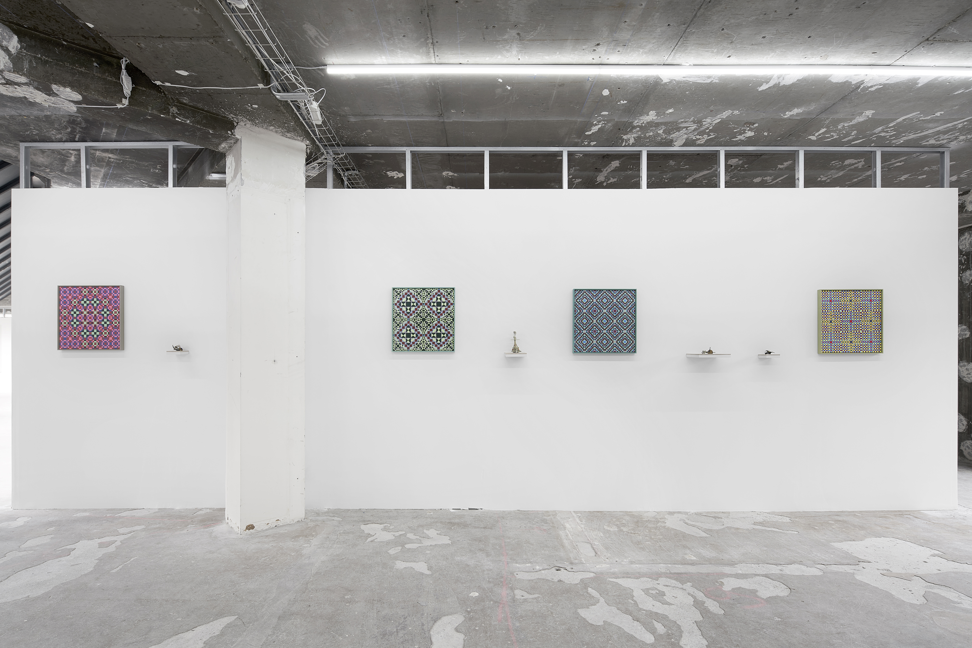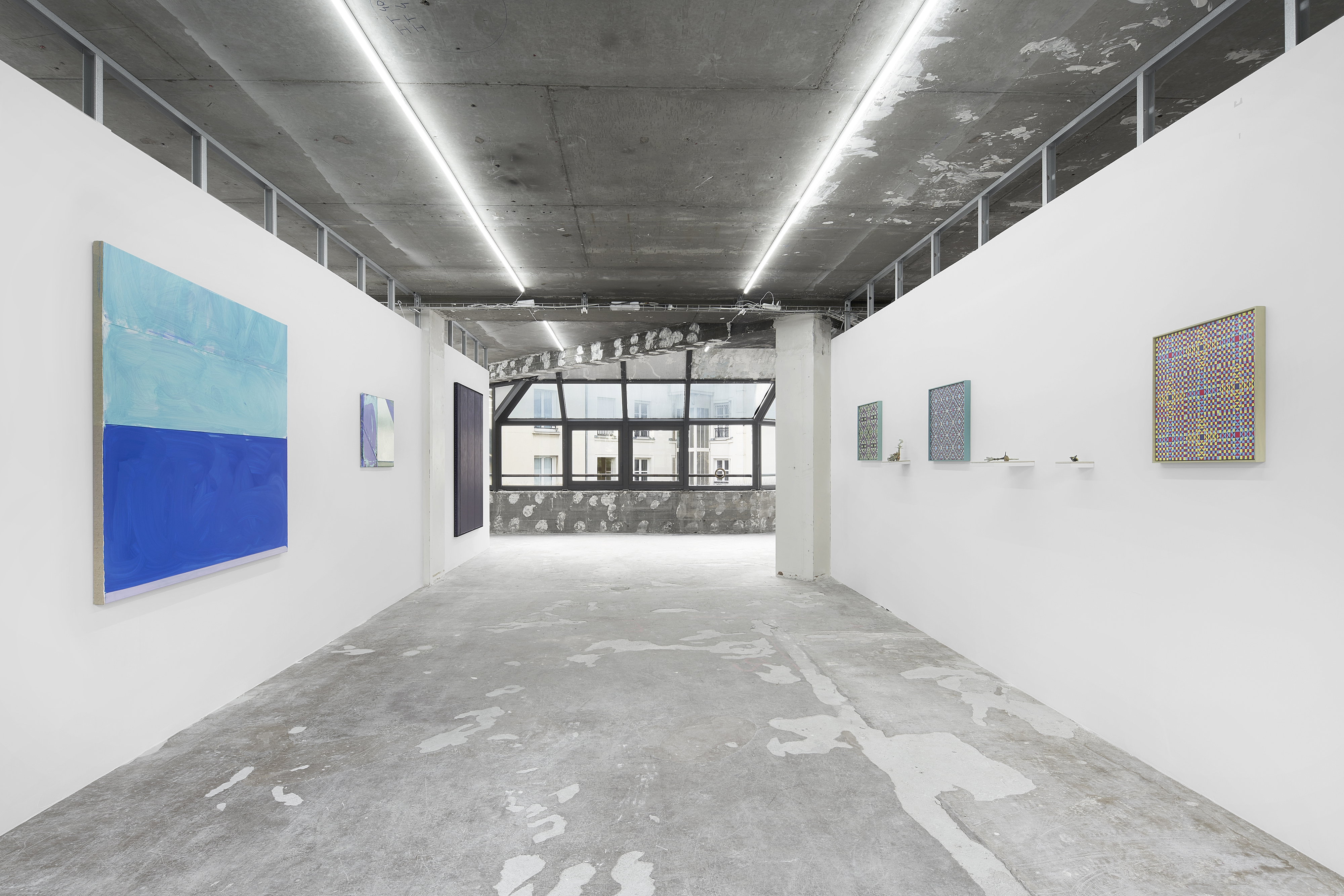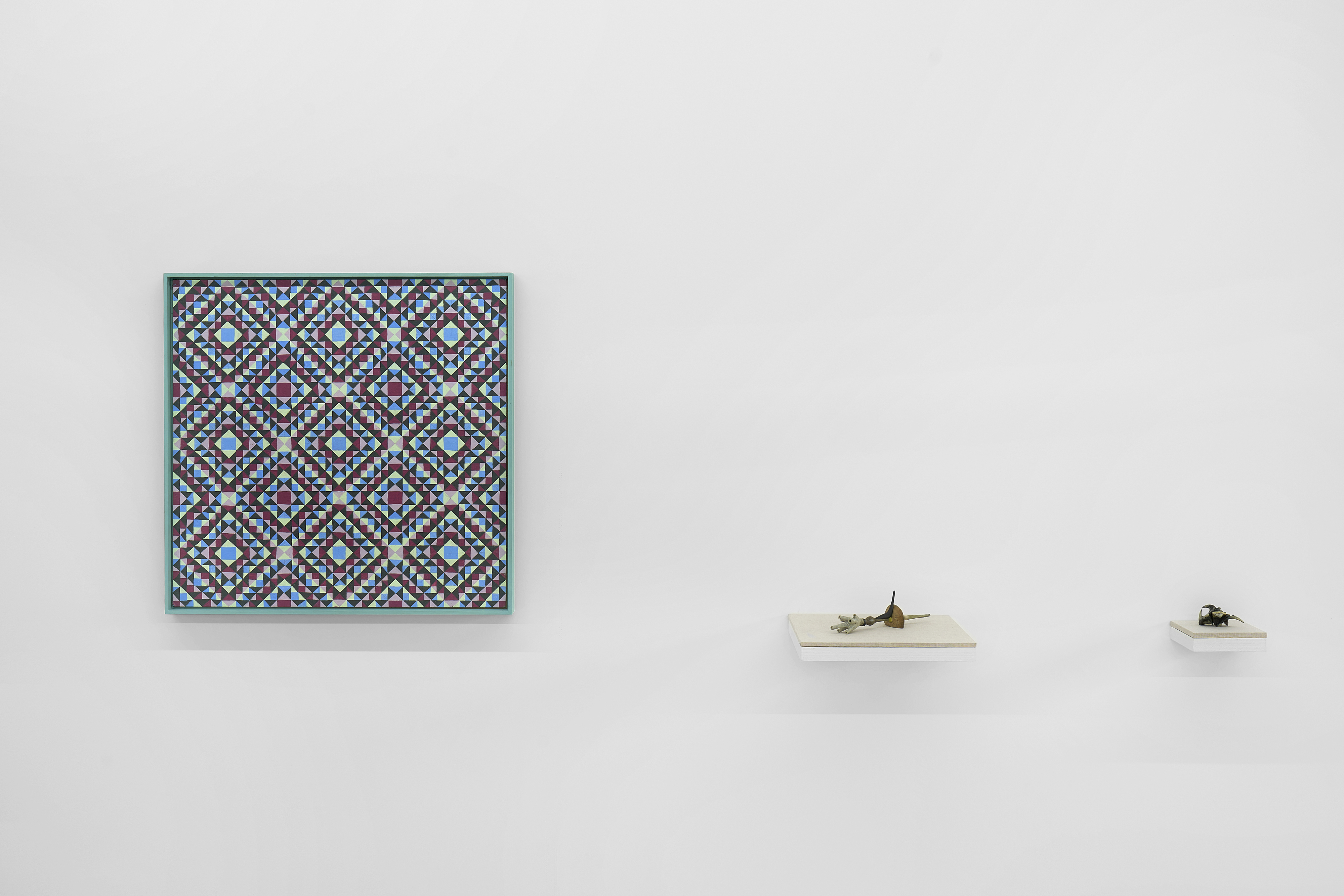 Bureau is pleased to present two longstanding artists of the gallery, Matt Hoyt and Julia Rommel. Each will have an autonomous presentation on facing walls. Hoyt will show a suite of grid-patterned paintings alongside recent small sculptures. Hoyt’s handmade objects are strange and fascinating, conjuring many forms from variously tinted spikes, spheres and many as-yet unnamed shapes from an imagined future or alternate past. Hoyt’s paintings provide a rhythmic presence grounded in geometry, pattern and order, however they bear the delicate traces of imperfection from the artist’s hand. Hoyt cites the primary inspiration and influence for the paintings as the archetypal power of the grid as employed by many cultures, particularly Latvian folk designs, Navajo weaving and American barn quilts, and likely going back to prehistoric times. Rommel will present three new paintings in shades of blue. One powerful, vertical work, Bride revisits Rommel’s formative dark monochrome paintings, in an inky, almost-black indigo. A horizontal work, Zanzibar banded with turquoise and lapis could suggest a seascape horizon. There is a structural, pragmatic quality to Rommel’s paintings. We see how they are built, layered, rubbed, smoothed, folded, unfolded and stapled together, bearing the traces that have become Rommel’s signature style. The traces of construction are inscribed into each painting’s surface: the deep grooves and creases describe the complex history of each work’s making.