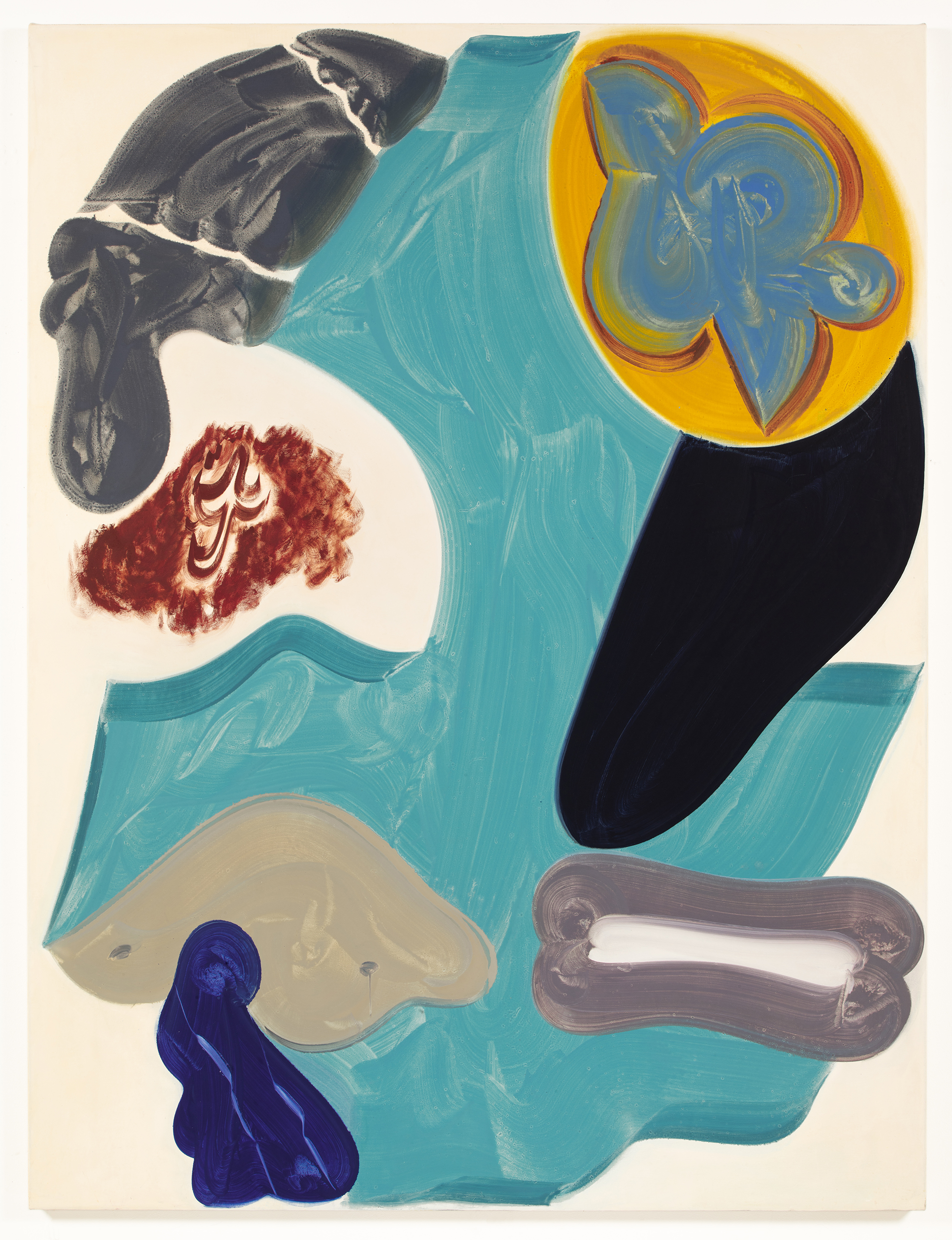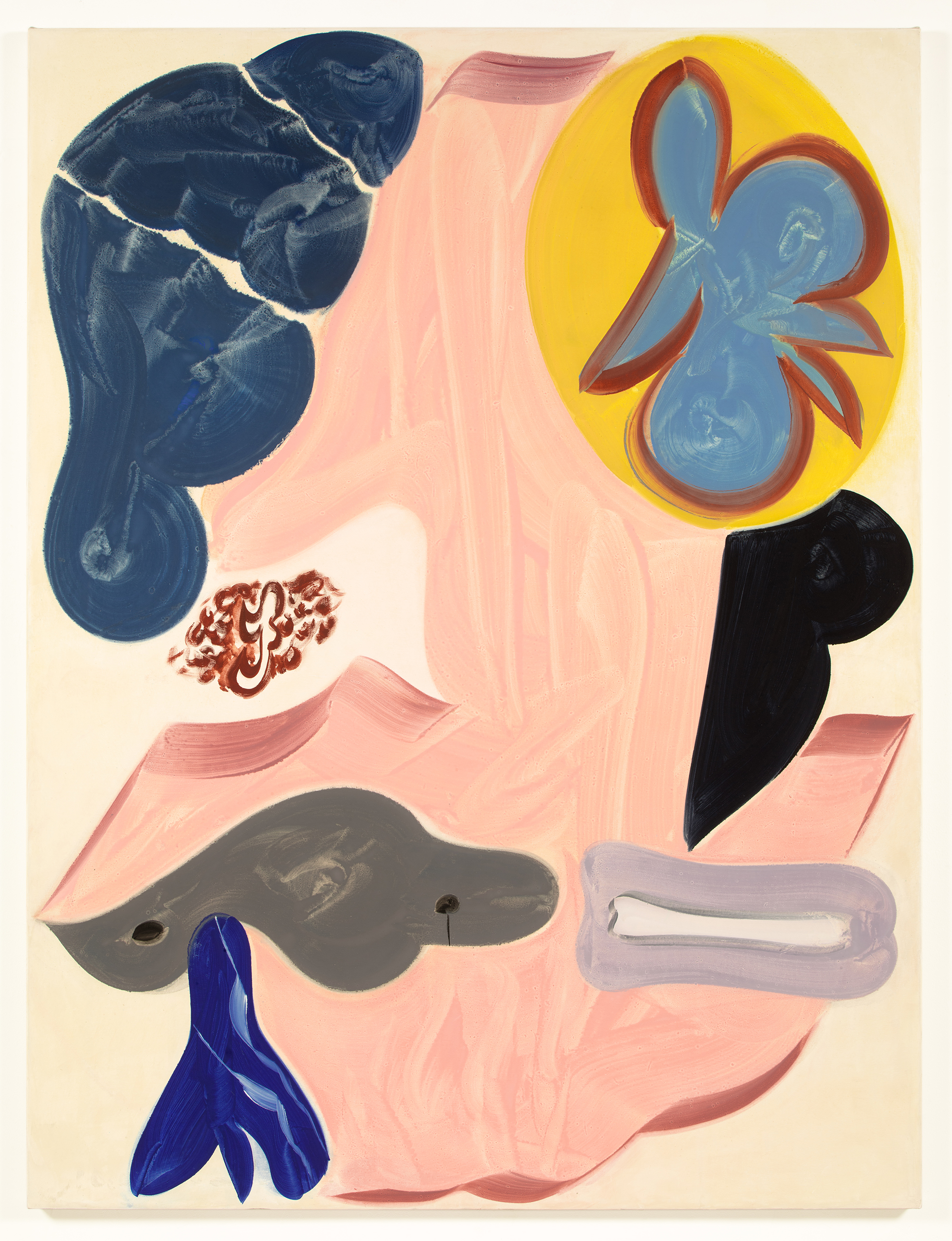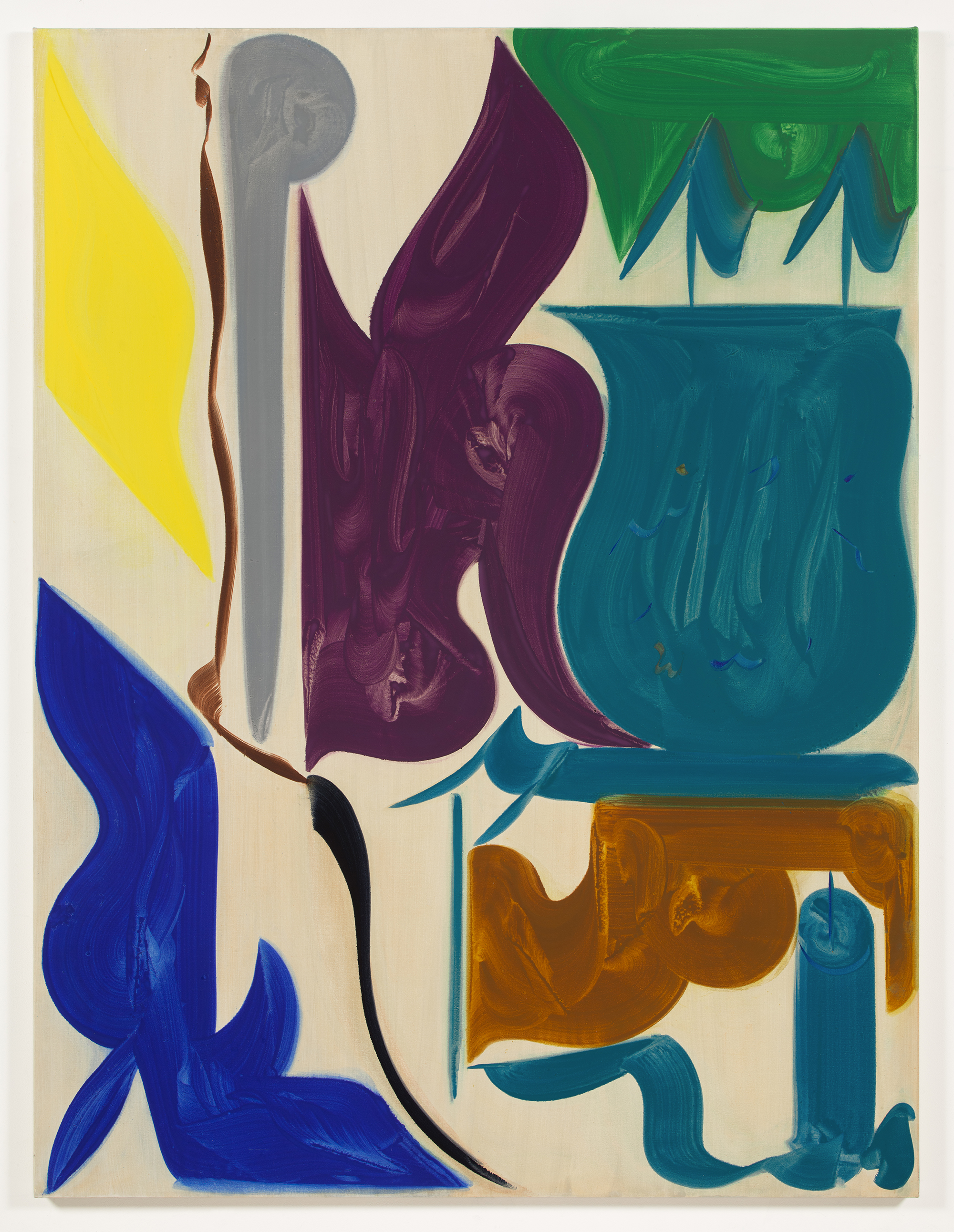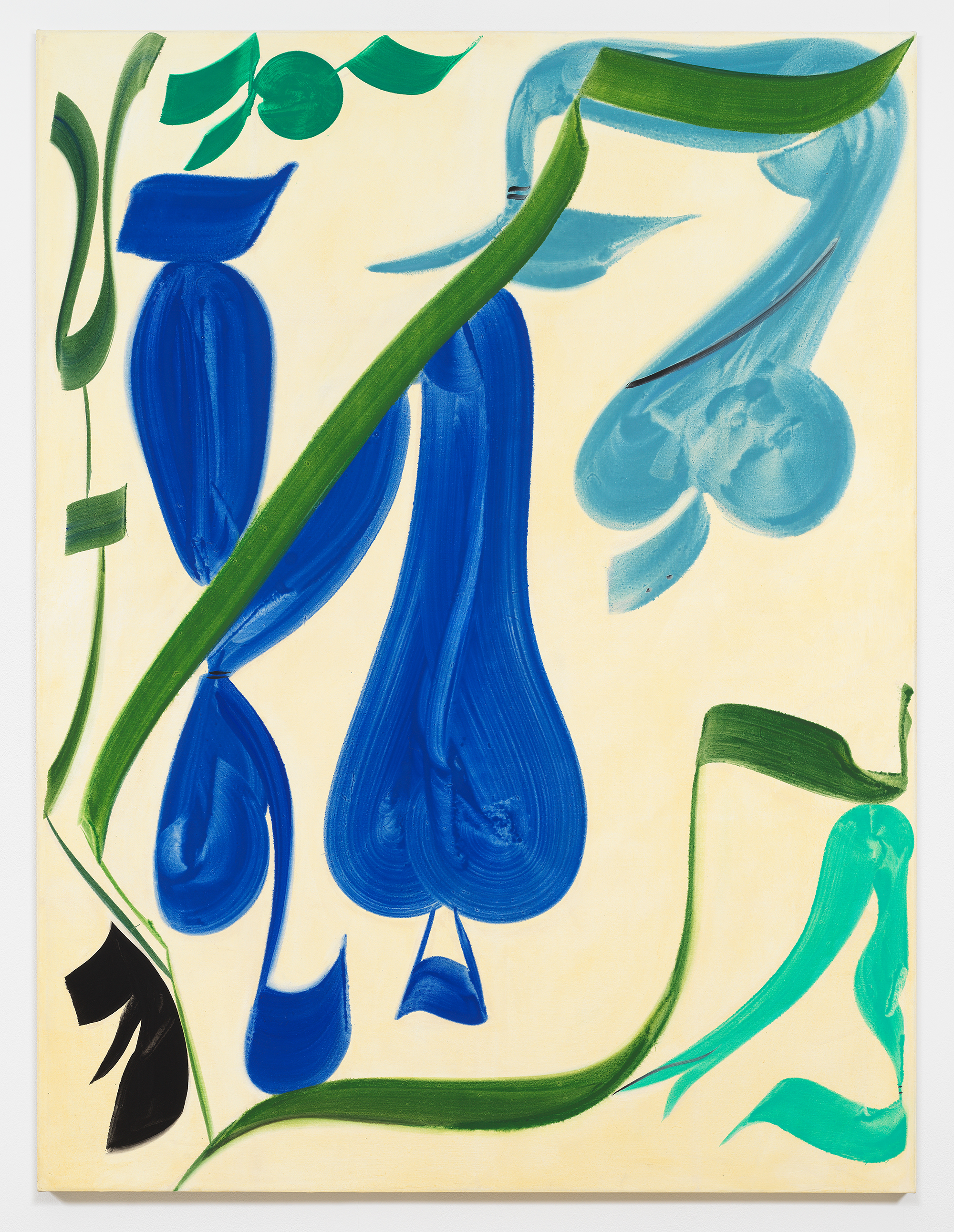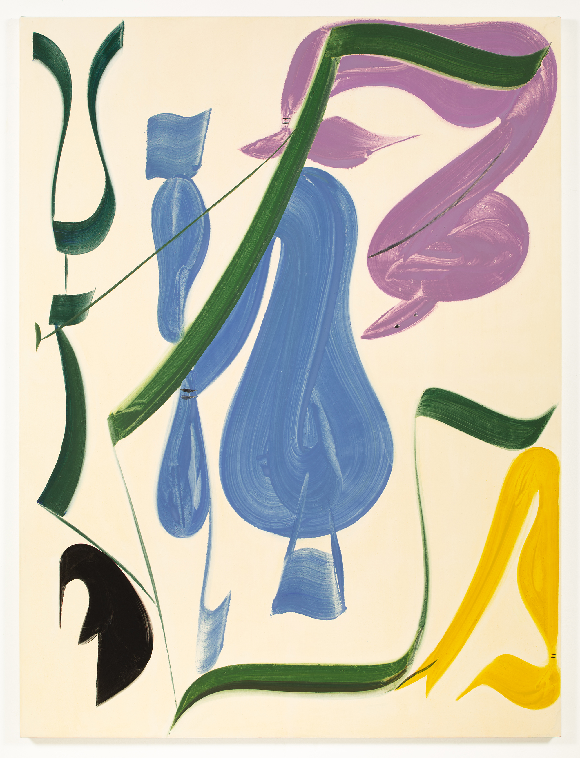 Treib works at an immersive scale, one that feels closer to the size of a bed than a door. You enter these paintings rather than pass through them. Nearly all are executed in the span of a single day. Working quickly but deliberately, Treib lays the canvas on the floor and then uses wide hake brushes to sweep paint over the surface, wiping out a gesture and then repeating it until each trace appears fluent and precise. These gestures appear as supple as her forms are mobile. With a turn of the brush, a contour line pools into a field of limpid color, which then divides into rhythmic strokes—contour, figure, and ground, all unified in a continuous mark. A soft skein of color can be flipped and pleated like a ribbon; a giant blue blot can be broken by the fluttering motion of a brush weaving through it. Just as the vibratory arrangement of forms in her paintings invokes the relation of the body to what it sees, these strokes suggest a mode of seeing through contact with the world, like the blind sculptor described by Roger de Piles, whose eyes were at the tips of his fingers. Treib thins her paints slightly so that they appear saturated yet translucent, and this gives her forms neither the solidity of still life nor the atmospherics of landscape. Instead of imagining that you might manipulate these figures or transport yourself into their midst, you are enjoined to follow the movements that produced them—the hand that wimpled or smoothed a shape, just as the body might sculpt a bed sheet.