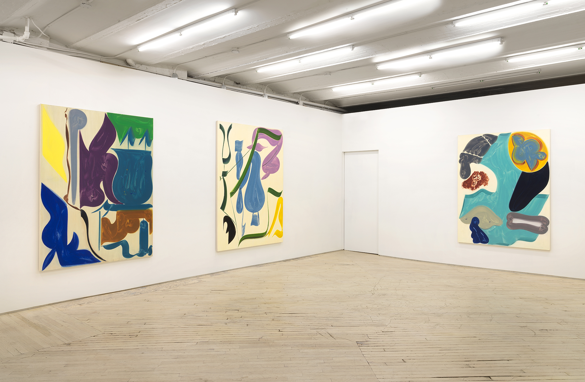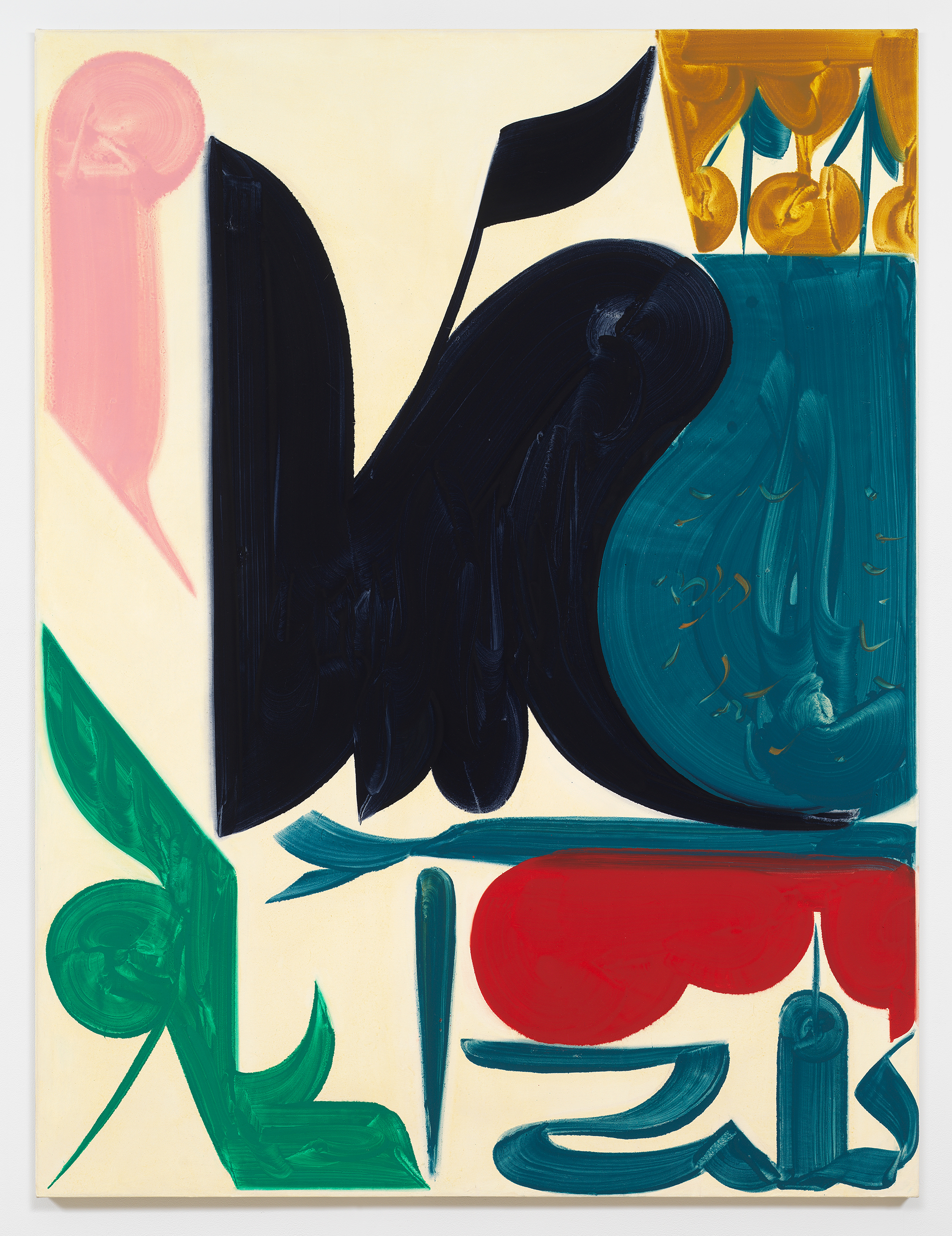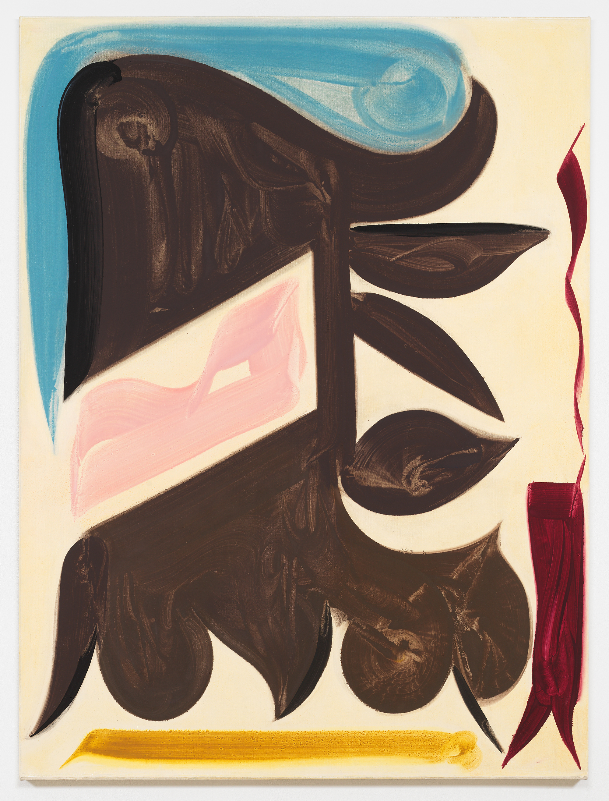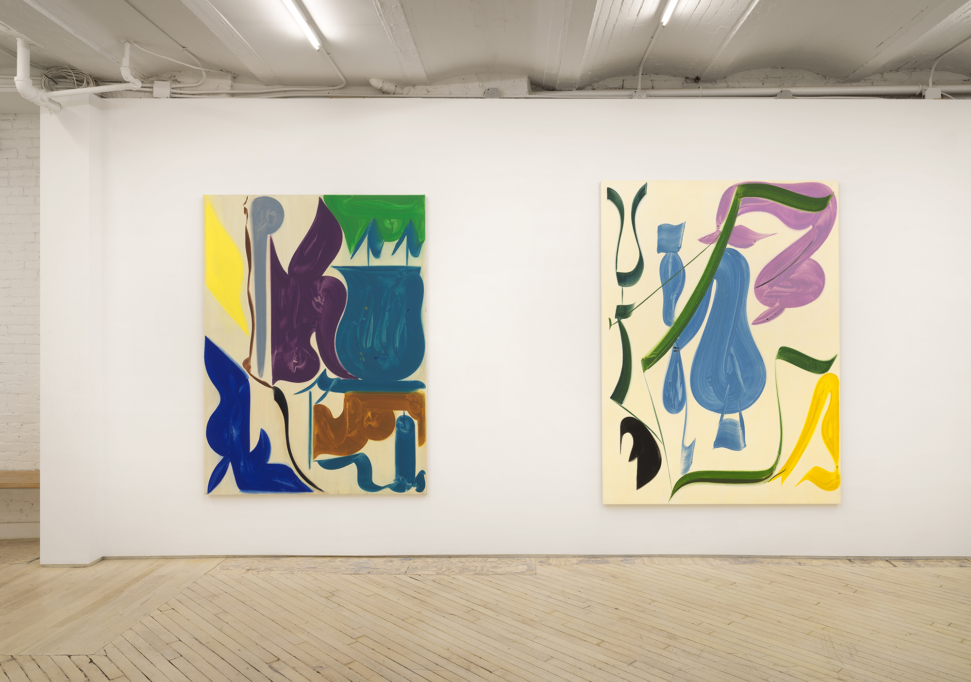 Treib works at an immersive scale, one that feels closer to the size of a bed than a door. You enter these paintings rather than pass through them. Nearly all are executed in the span of a single day. Working quickly but deliberately, Treib lays the canvas on the floor and then uses wide hake brushes to sweep paint over the surface, wiping out a gesture and then repeating it until each trace appears fluent and precise. These gestures appear as supple as her forms are mobile. With a turn of the brush, a contour line pools into a field of limpid color, which then divides into rhythmic strokes—contour, figure, and ground, all unified in a continuous mark. A soft skein of color can be flipped and pleated like a ribbon; a giant blue blot can be broken by the fluttering motion of a brush weaving through it. Just as the vibratory arrangement of forms in her paintings invokes the relation of the body to what it sees, these strokes suggest a mode of seeing through contact with the world, like the blind sculptor described by Roger de Piles, whose eyes were at the tips of his fingers. Treib thins her paints slightly so that they appear saturated yet translucent, and this gives her forms neither the solidity of still life nor the atmospherics of landscape. Instead of imagining that you might manipulate these figures or transport yourself into their midst, you are enjoined to follow the movements that produced them—the hand that wimpled or smoothed a shape, just as the body might sculpt a bed sheet.