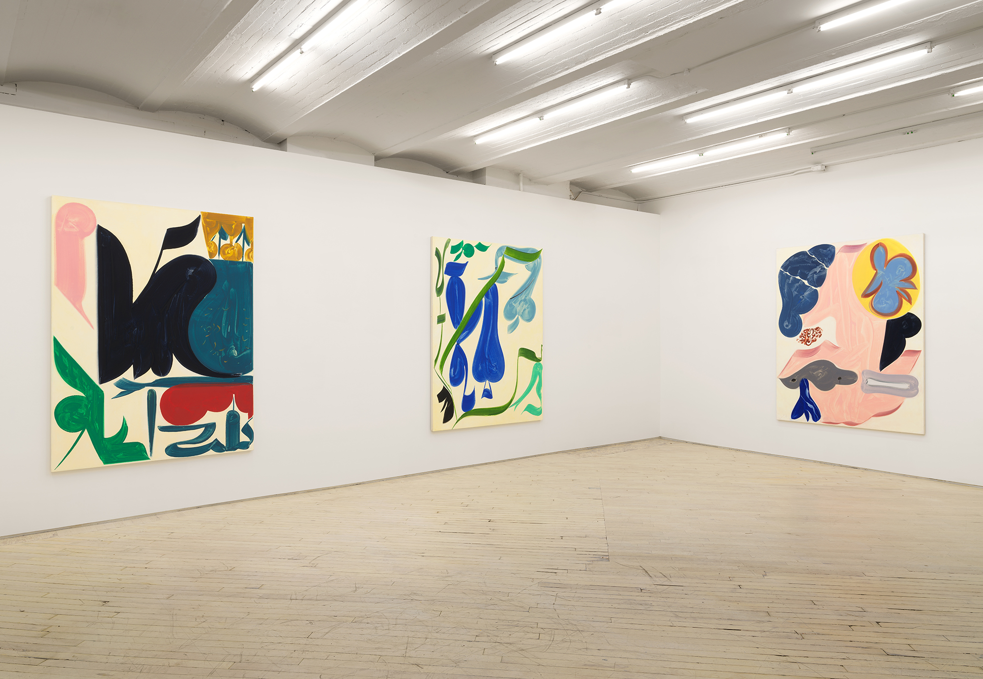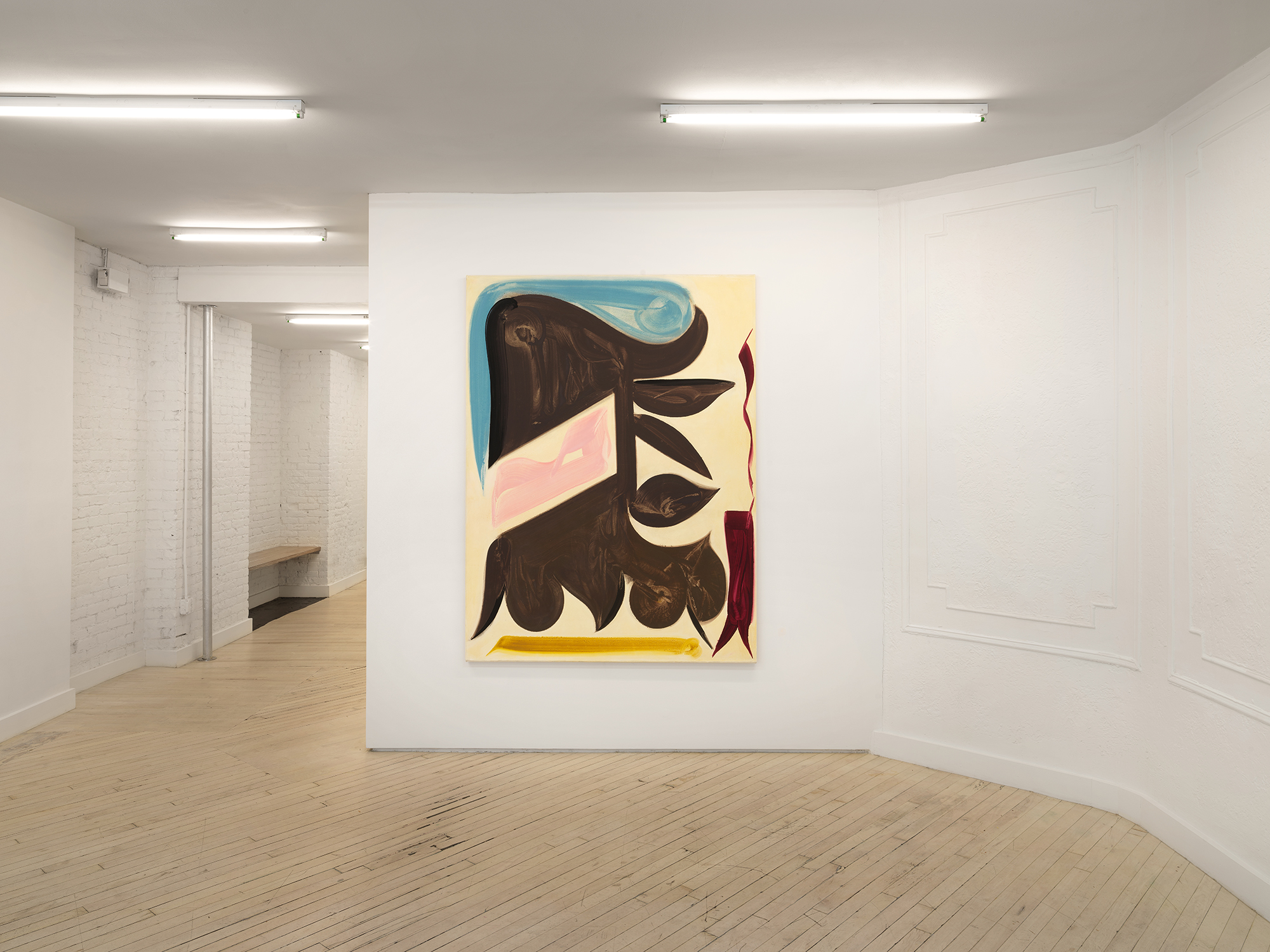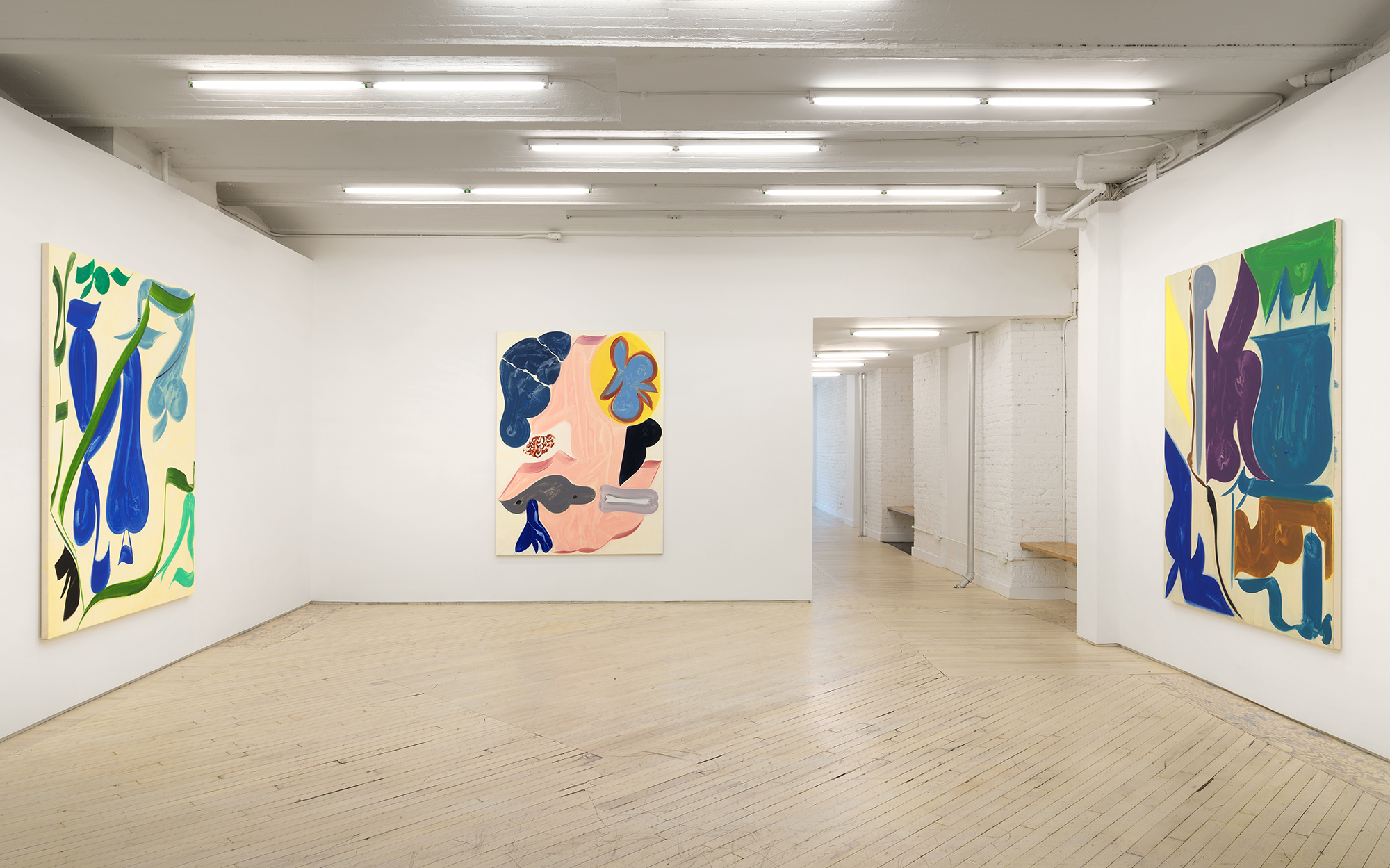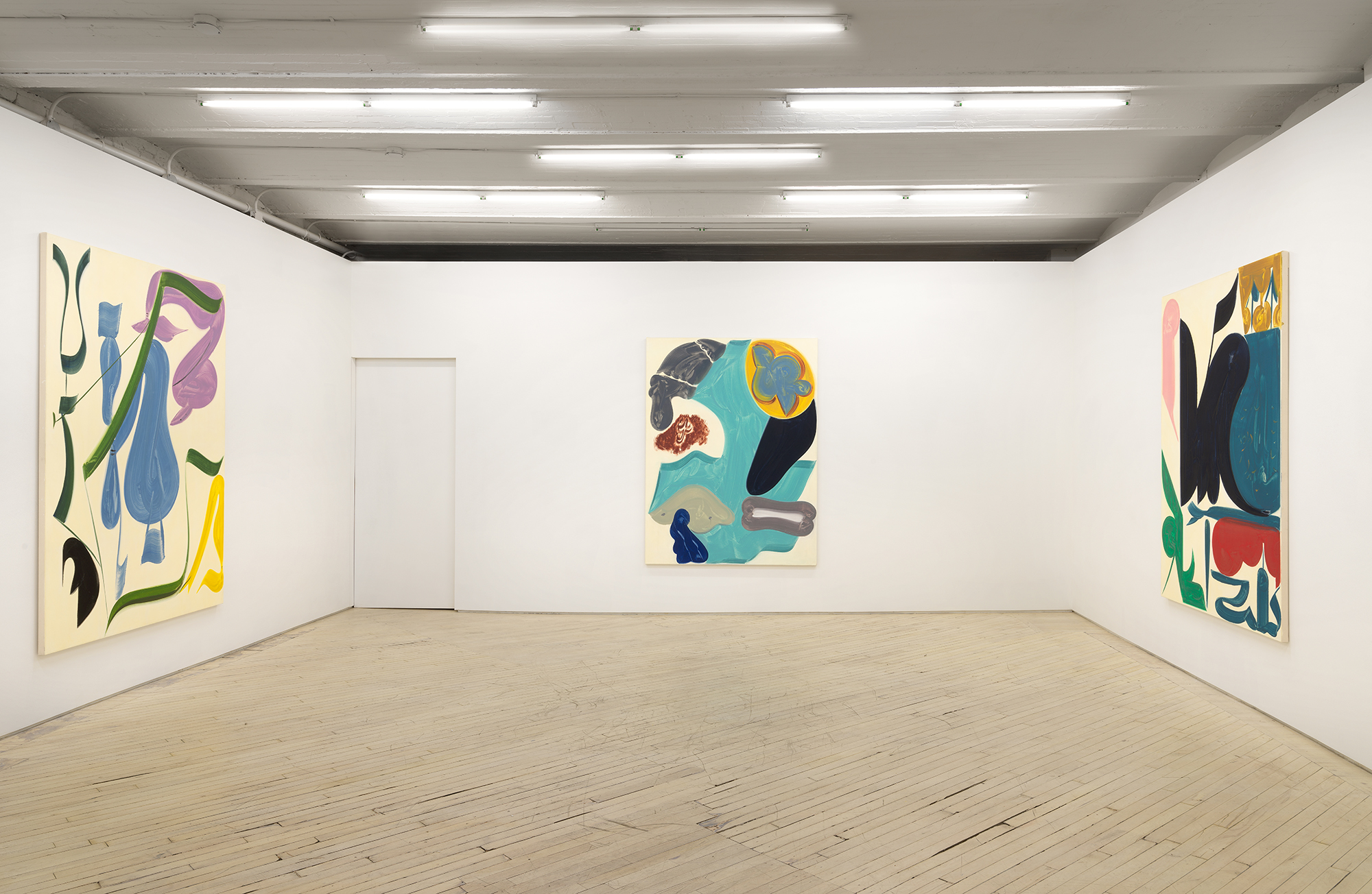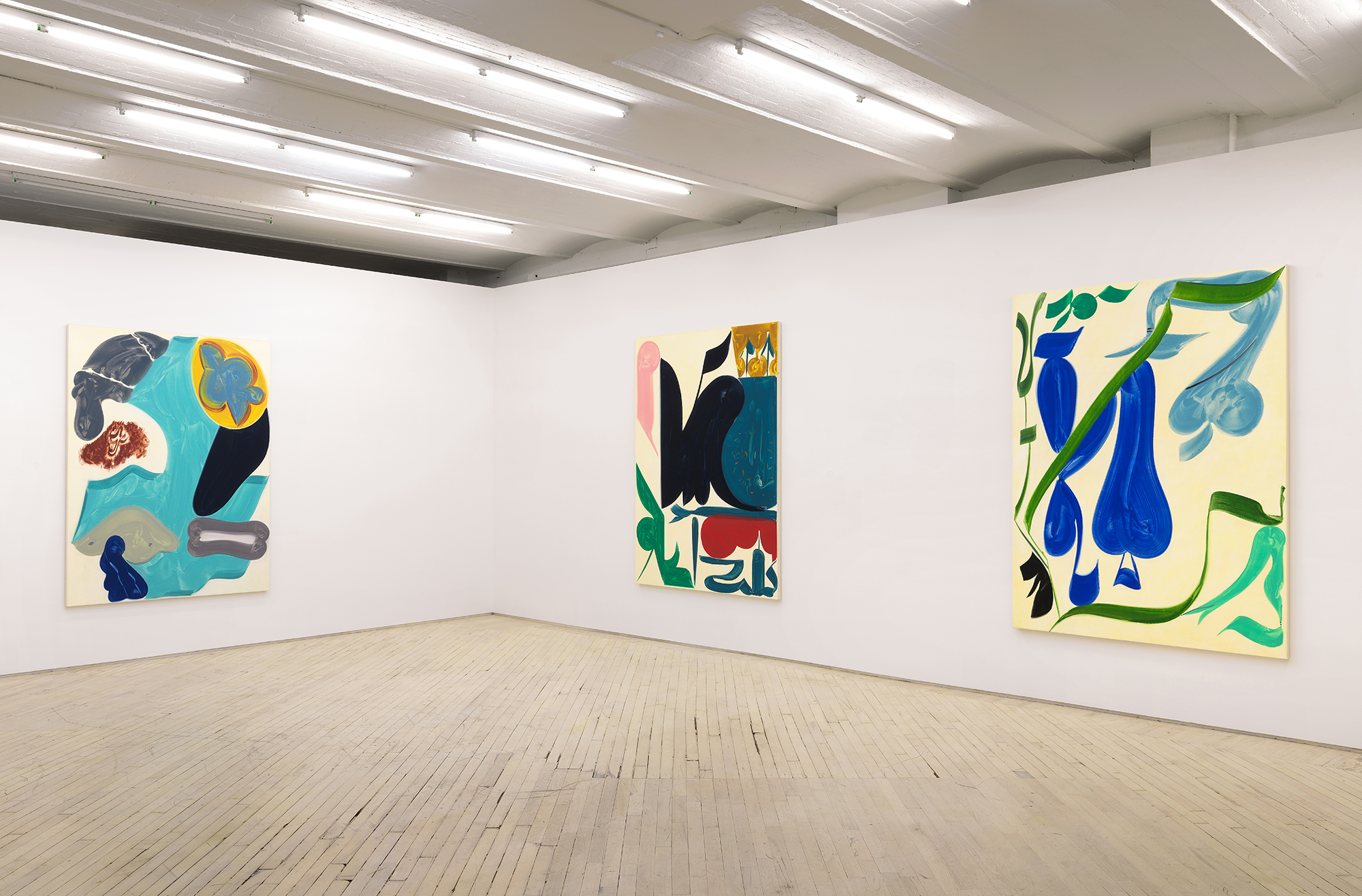 Treib works at an immersive scale, one that feels closer to the size of a bed than a door. You enter these paintings rather than pass through them. Nearly all are executed in the span of a single day. Working quickly but deliberately, Treib lays the canvas on the floor and then uses wide hake brushes to sweep paint over the surface, wiping out a gesture and then repeating it until each trace appears fluent and precise. These gestures appear as supple as her forms are mobile. With a turn of the brush, a contour line pools into a field of limpid color, which then divides into rhythmic strokes—contour, figure, and ground, all unified in a continuous mark. A soft skein of color can be flipped and pleated like a ribbon; a giant blue blot can be broken by the fluttering motion of a brush weaving through it. Just as the vibratory arrangement of forms in her paintings invokes the relation of the body to what it sees, these strokes suggest a mode of seeing through contact with the world, like the blind sculptor described by Roger de Piles, whose eyes were at the tips of his fingers. Treib thins her paints slightly so that they appear saturated yet translucent, and this gives her forms neither the solidity of still life nor the atmospherics of landscape. Instead of imagining that you might manipulate these figures or transport yourself into their midst, you are enjoined to follow the movements that produced them—the hand that wimpled or smoothed a shape, just as the body might sculpt a bed sheet.