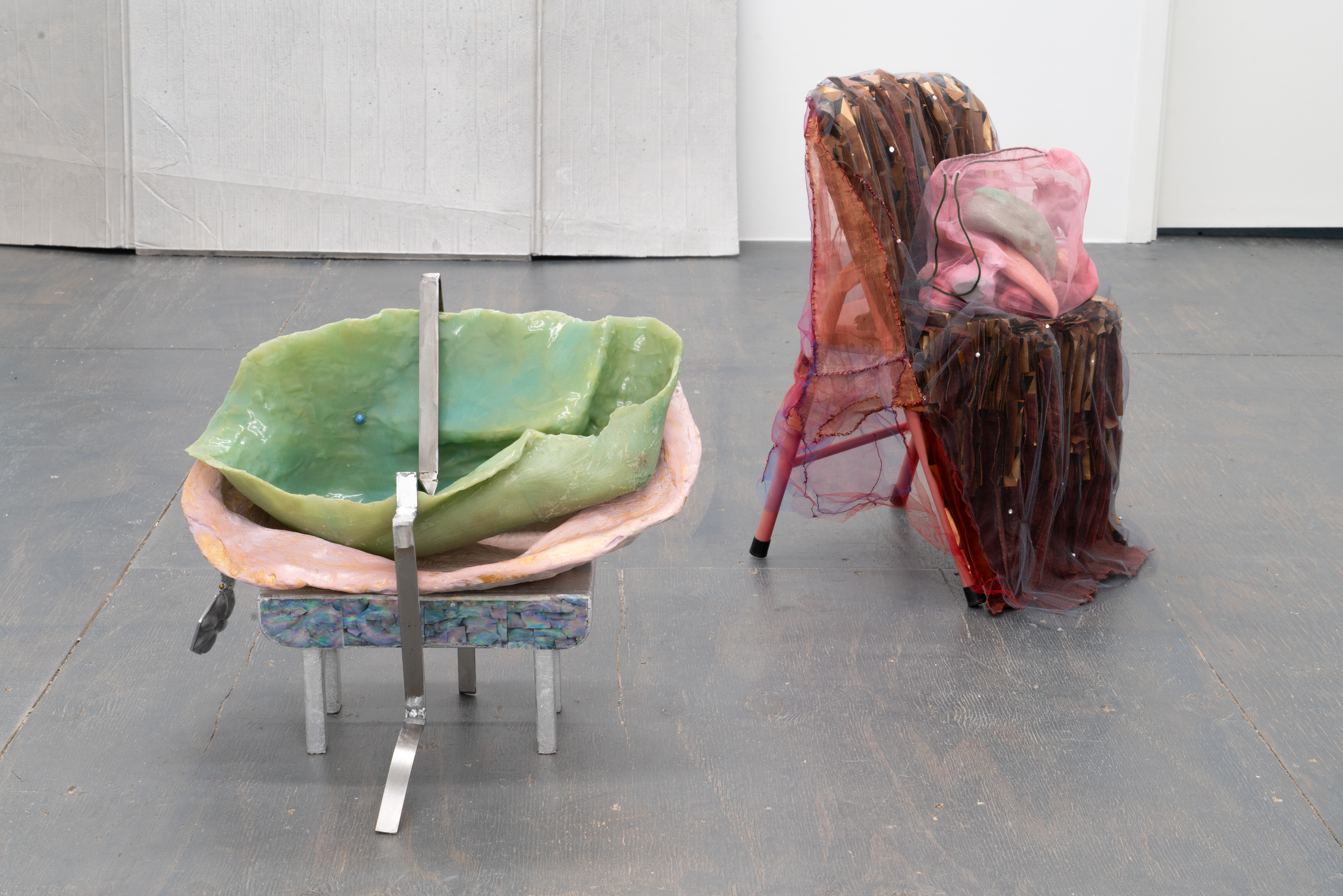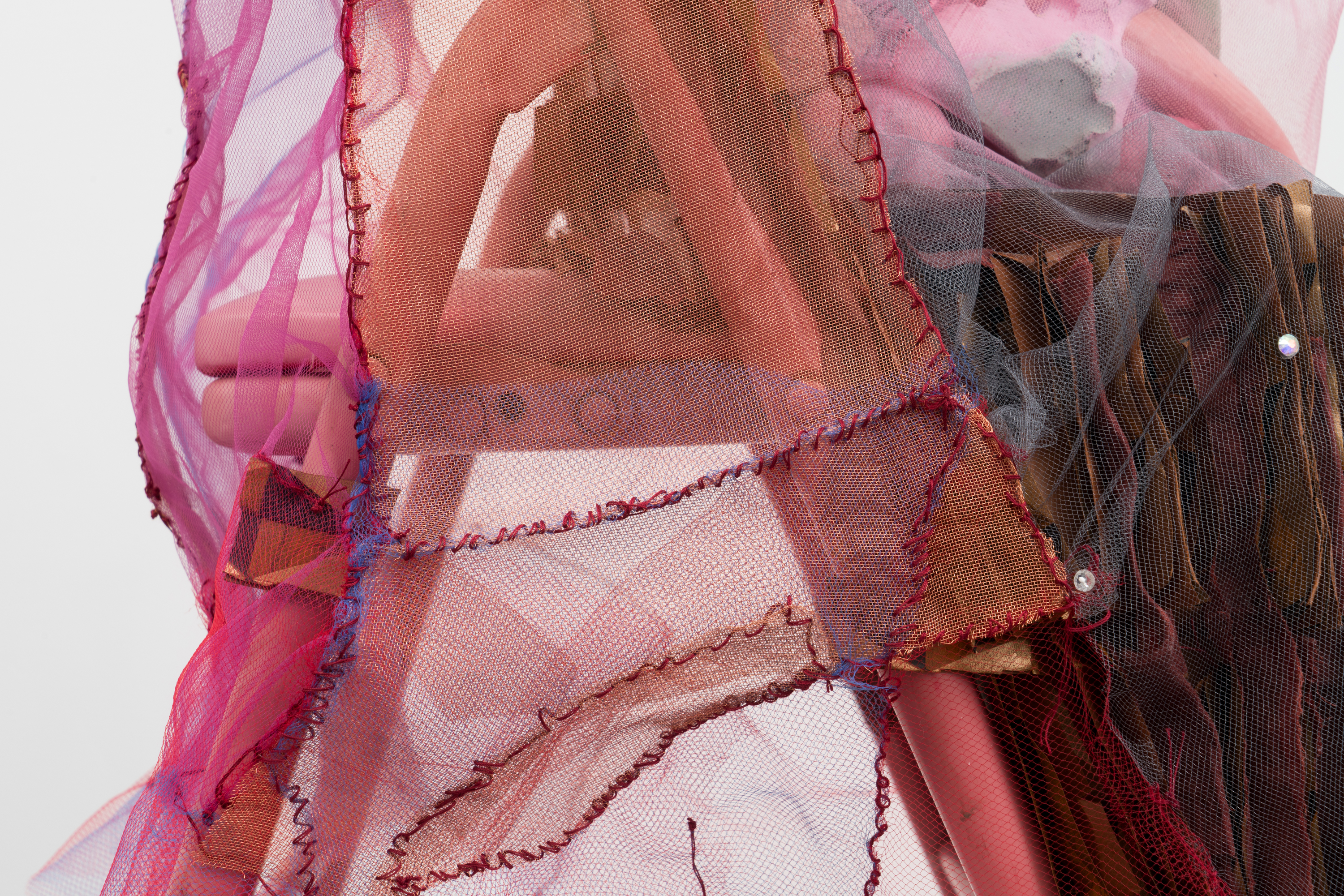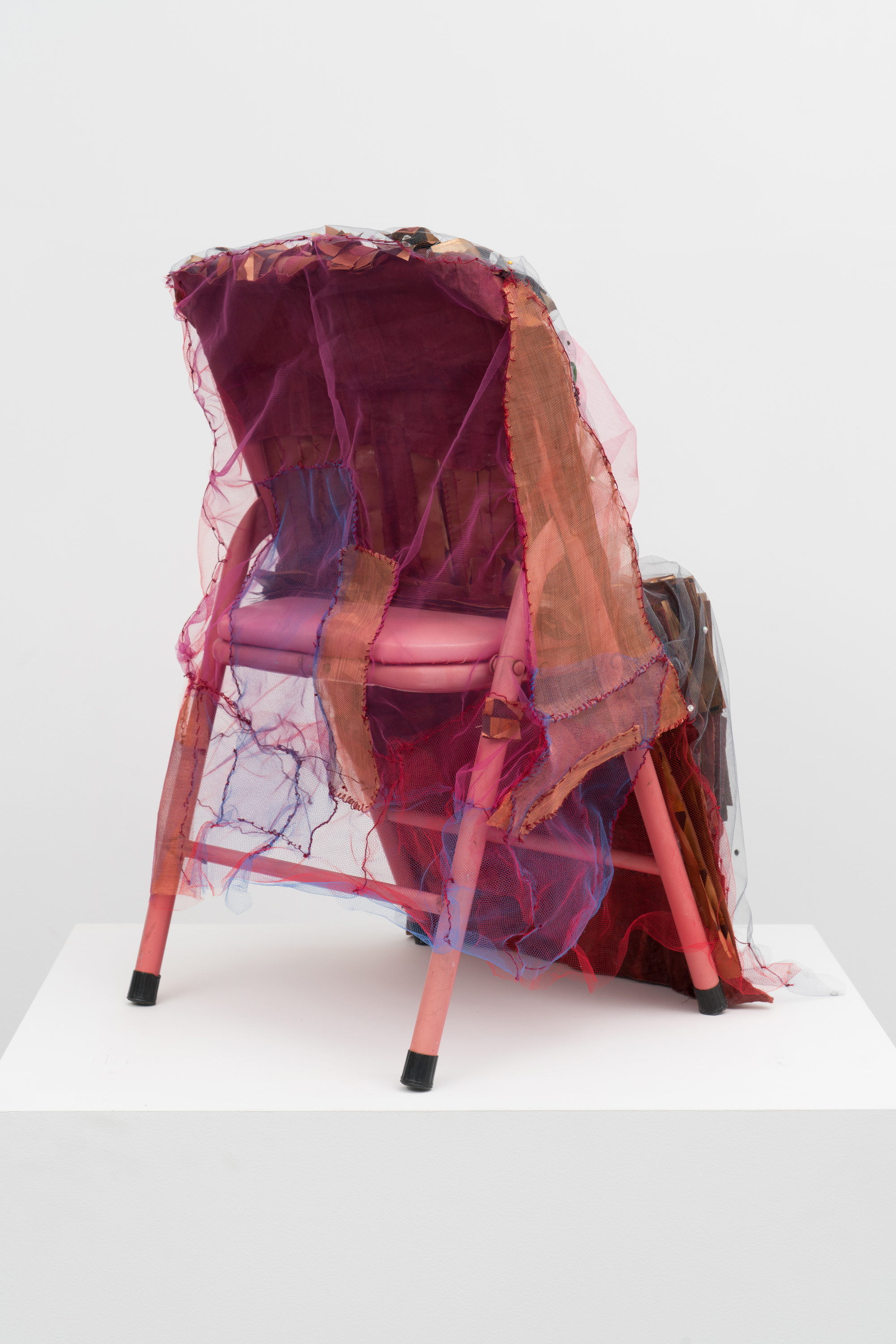 Em Rooney, Maenads' sákkos, 2024, Folding chair, paper, polymerized Aqua-Resin, cotton, tulle, acrylic rhinestones, copper mesh, thread, 23 × 16 × 17 in. (58.42 × 40.64 × 43.18 cm)
