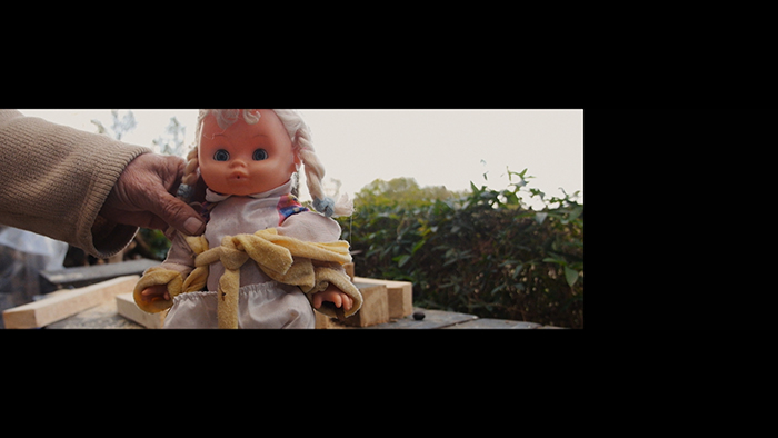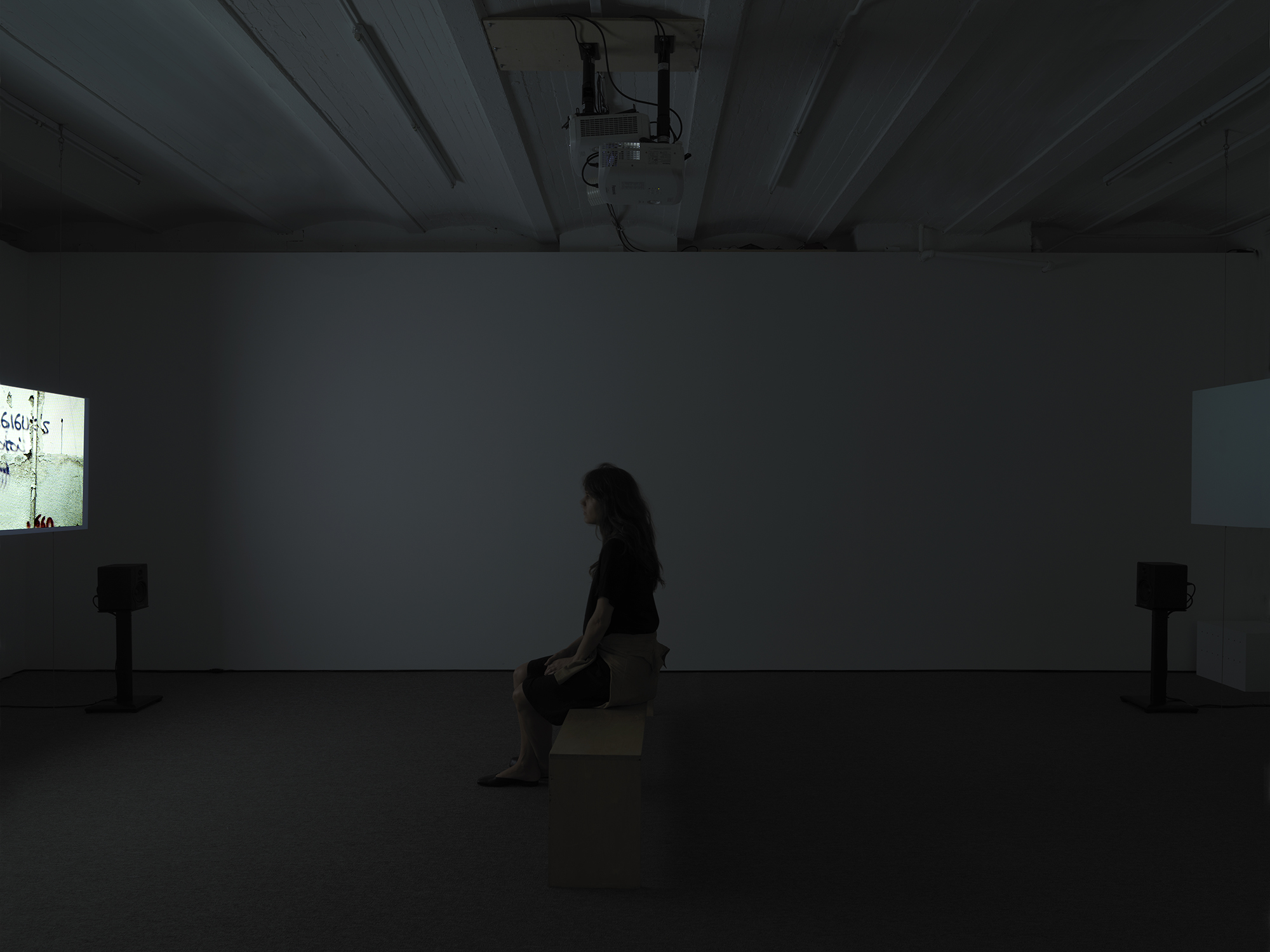The video installation is structured in separate strophes or verses, each one connected to the next by a shared geography or narrative. As each strophe closes, the screen darkens and a new verse opens on the opposing screen, requiring the viewer to turn and follow the reversals and shifts which have altered the course of the piece. Each turn launches a new facet of the narrative: an imperative change of direction in the story and perspective. On the screen, images are often truncated or blacked out: evidence of the artist’s decision to show or omit material. For Ga there is a deliberate commitment to the act of seeing, or showing, which weighed heavily on her during the making of this piece.